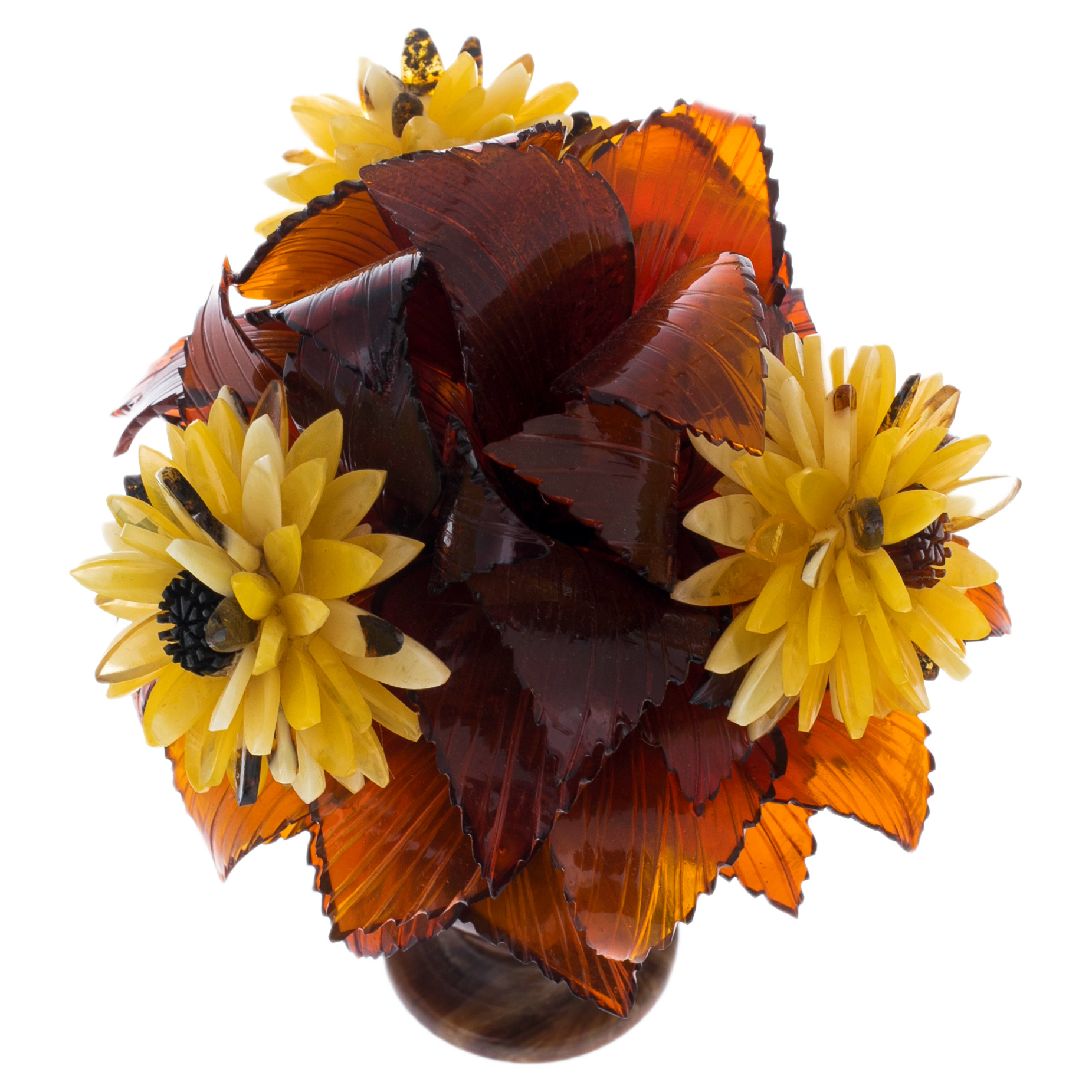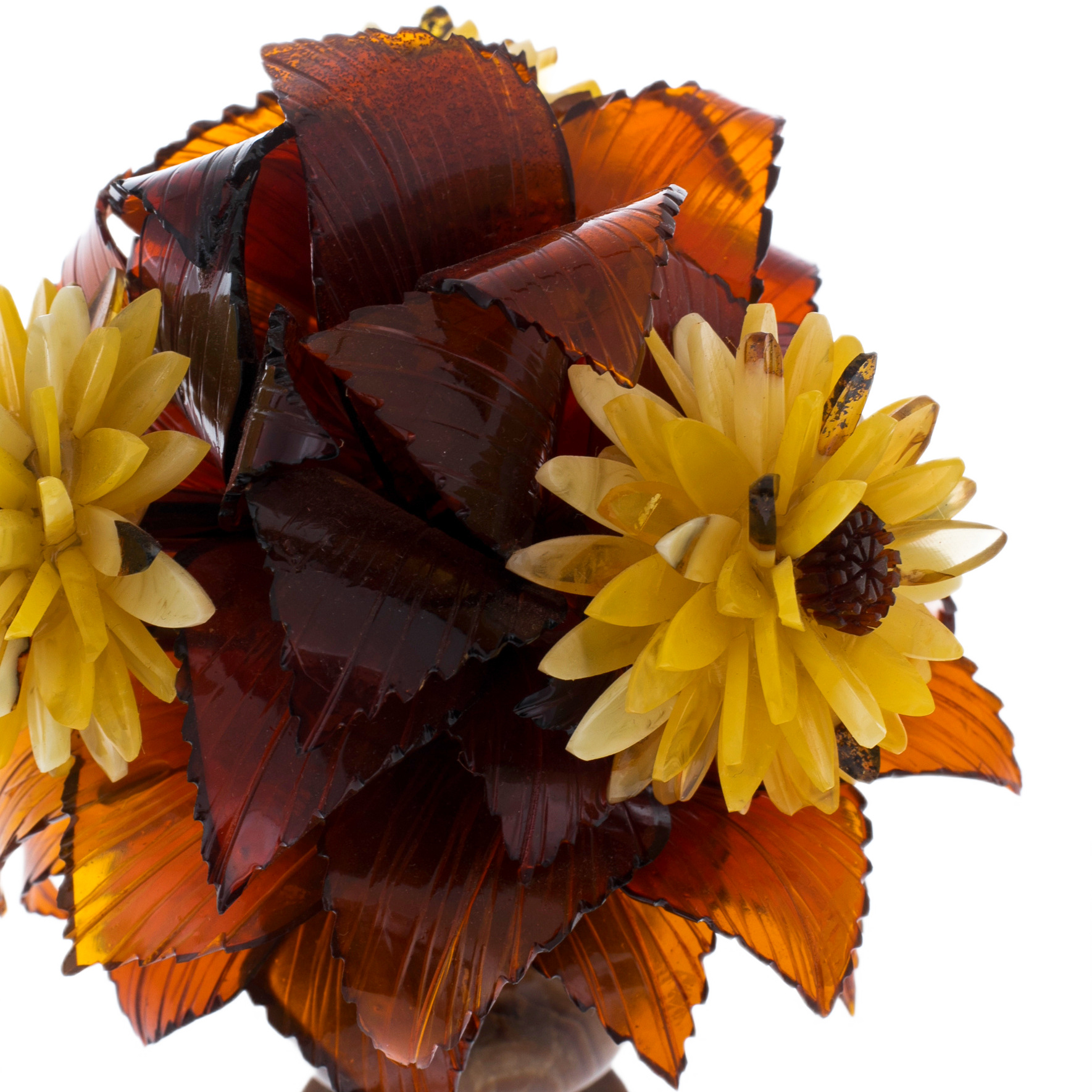 Листья, словно покрытые осенним туманом, играют сложными оттенками и глубинами, создавая контраст с яркостью цветов. Эта симфония янтарных тонов, выполненная с непревзойденной точностью и мастерством, напоминает о стремлении к изяществу и совершенству, воплощённом в искусстве. Янтарь, как вечный хранитель времени, собирает в себе эхо бескрайних лесов, и его природные переливы усиливают восприятие жизни в этой статуэтке.