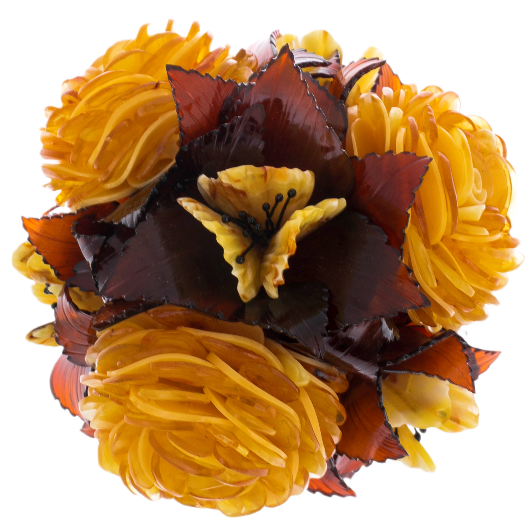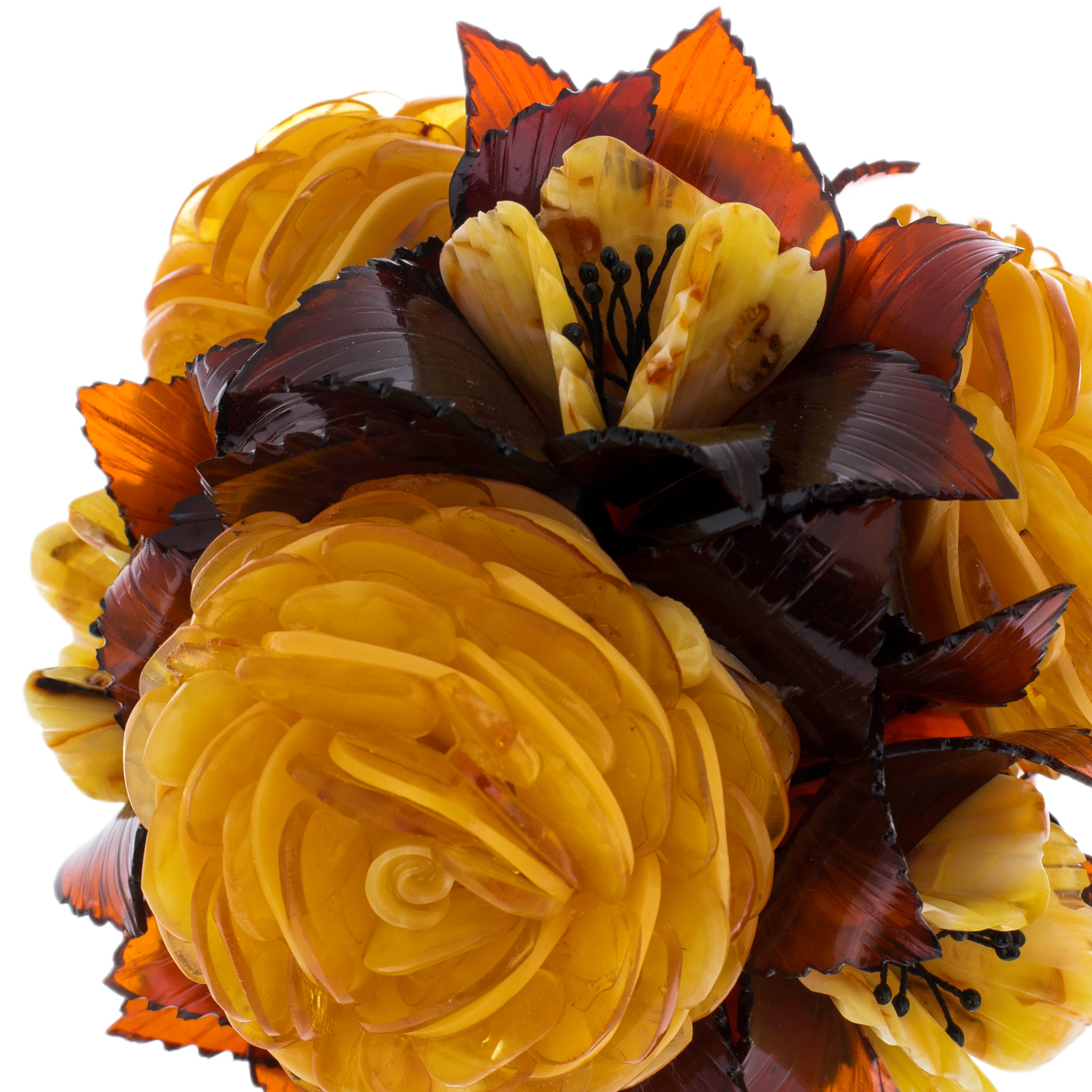 Букет, застывший во времени, воссозданный из драгоценного янтаря и благородного оникса, не подвержен увяданию, как истинные ценности, неподвластные течению лет. Каждая деталь этой композиции выточена с ювелирной точностью: лепестки рассыпаются солнечным светом золотистого янтаря, а темные листья напоминают о тенях заката, прячущих солнце за линией горизонта. В этом сочетании — контраст жизни, ее взлетов и пауз, ее энергии и умиротворения.