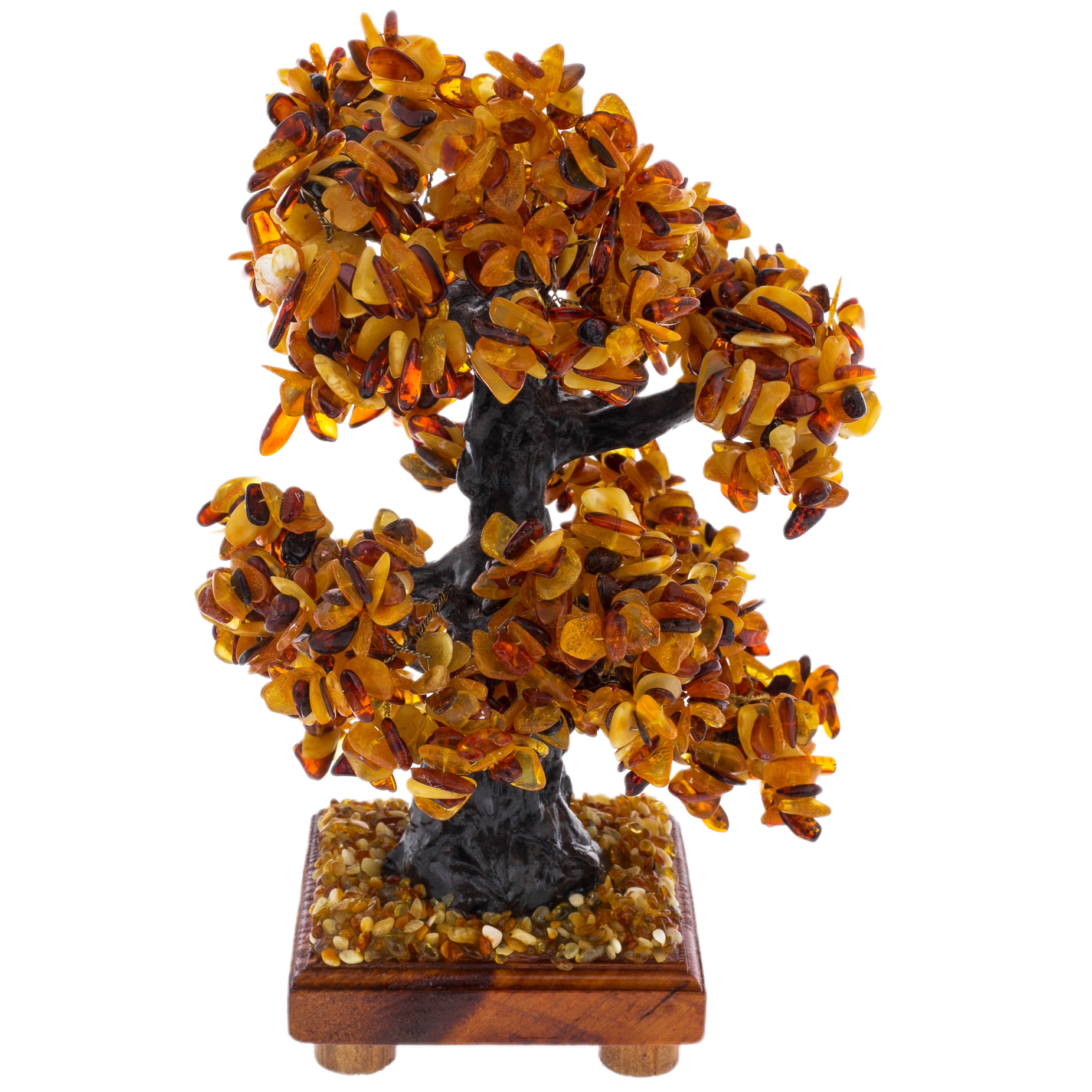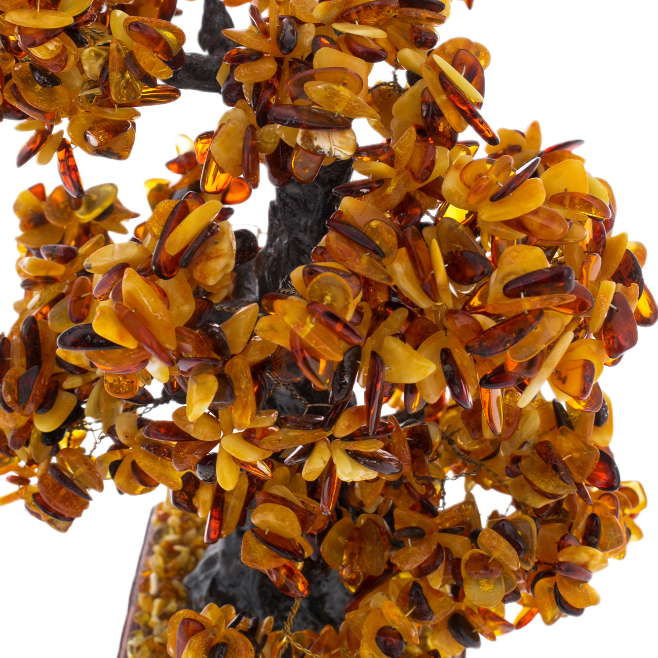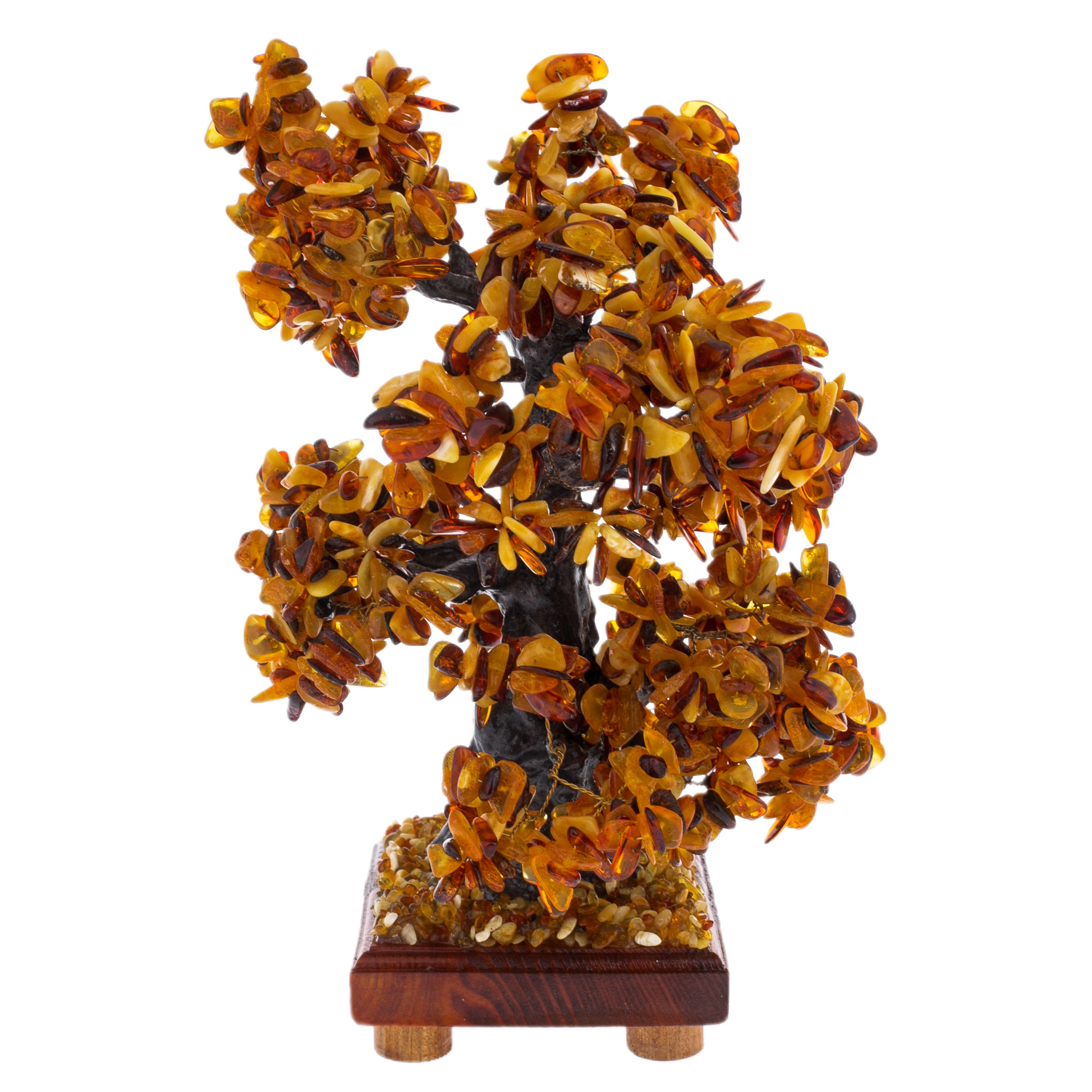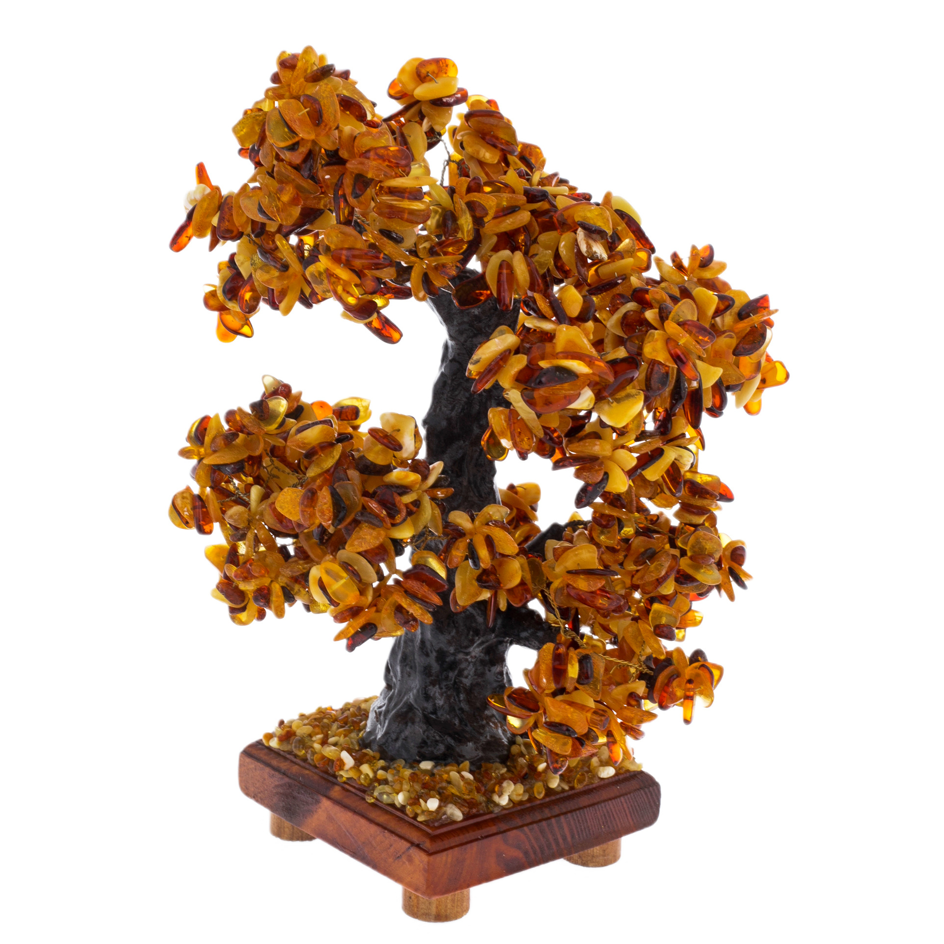 Подножие деревца, усыпанное крошкой янтаря, похоже на солнечный ковёр, сотканный из бесчисленных мгновений счастья и света. Каждый камешек в этом ковре — отдельная звезда, освещающая путь тем, кто ищет совершенство. Основание из натурального дерева, словно пьедестал для короля, подчеркивает уникальность и величие этого творения, соединяя тепло природы с безмолвной роскошью.