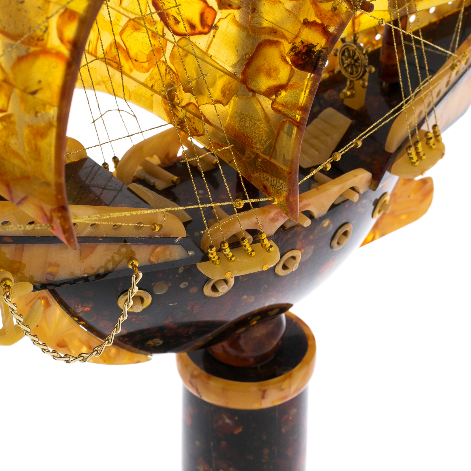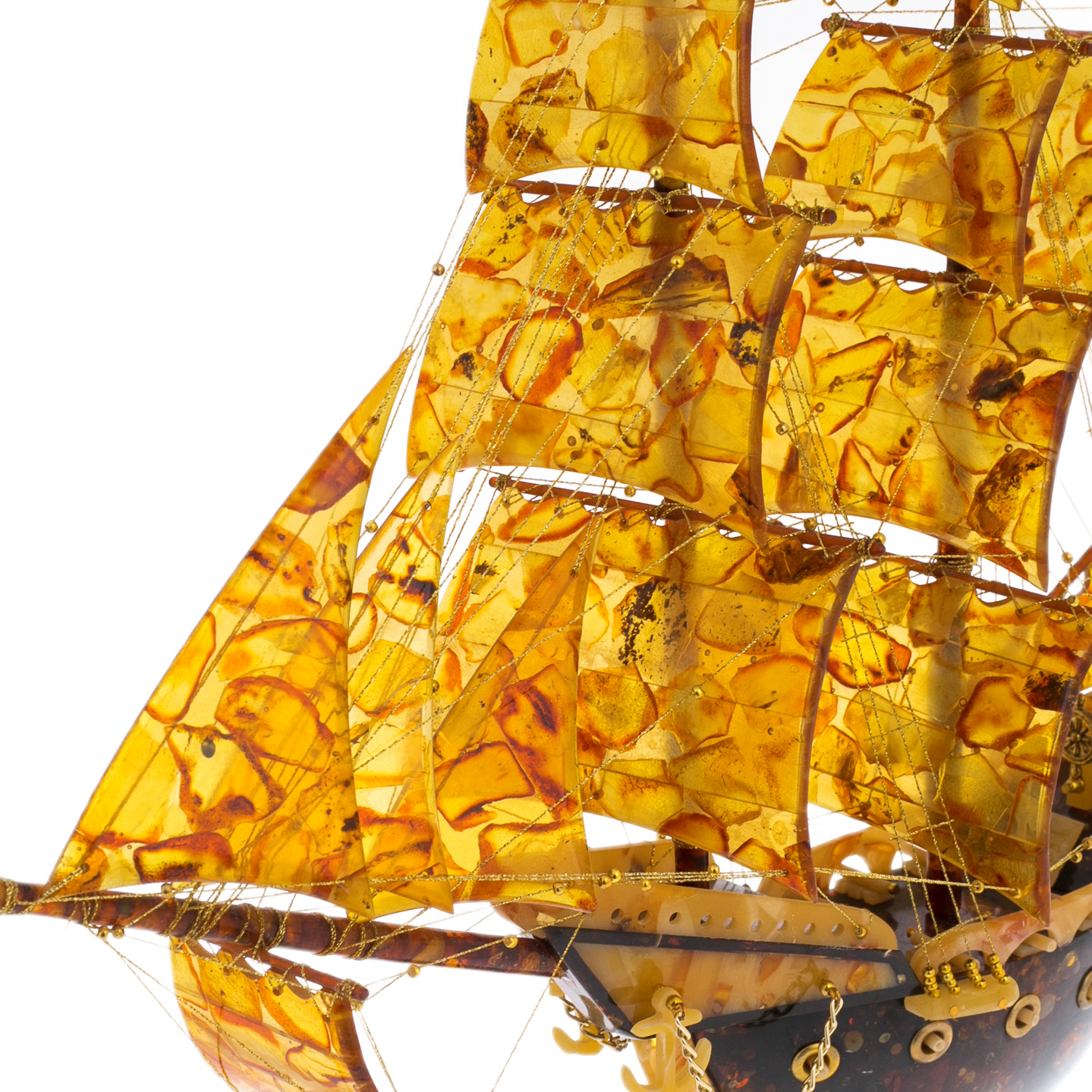Корпус судна выточен из редчайшего балтийского янтаря, насыщенного глубокой, как старое вино, игрой света и оттенков. Тёмная основа корпуса словно хранит в себе воспоминания о тысячах закатов, отражённых в морской глади, тогда как позолоченные миниатюрные иллюминаторы мерцают, подобно звёздам на ночном небосводе. Вращая корабль в руках, можно уловить отблеск солнца, навсегда заключённого в янтарных гранях, – память о тёплом дыхании древних лесов.