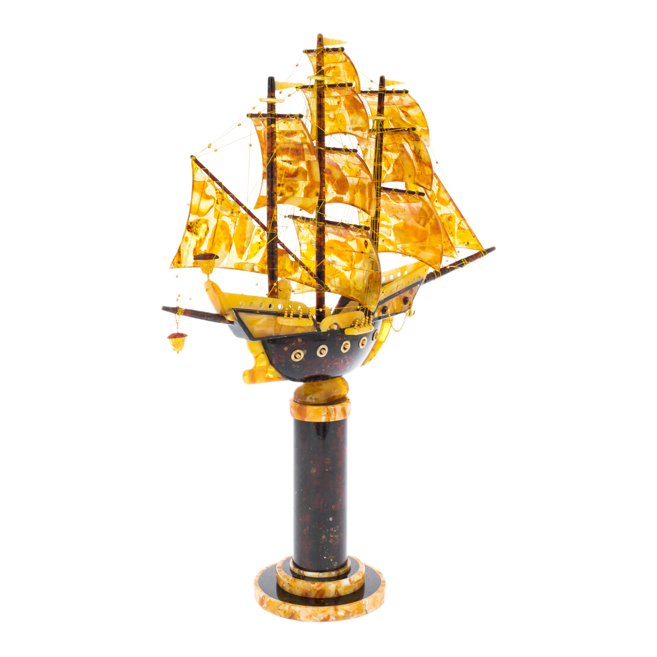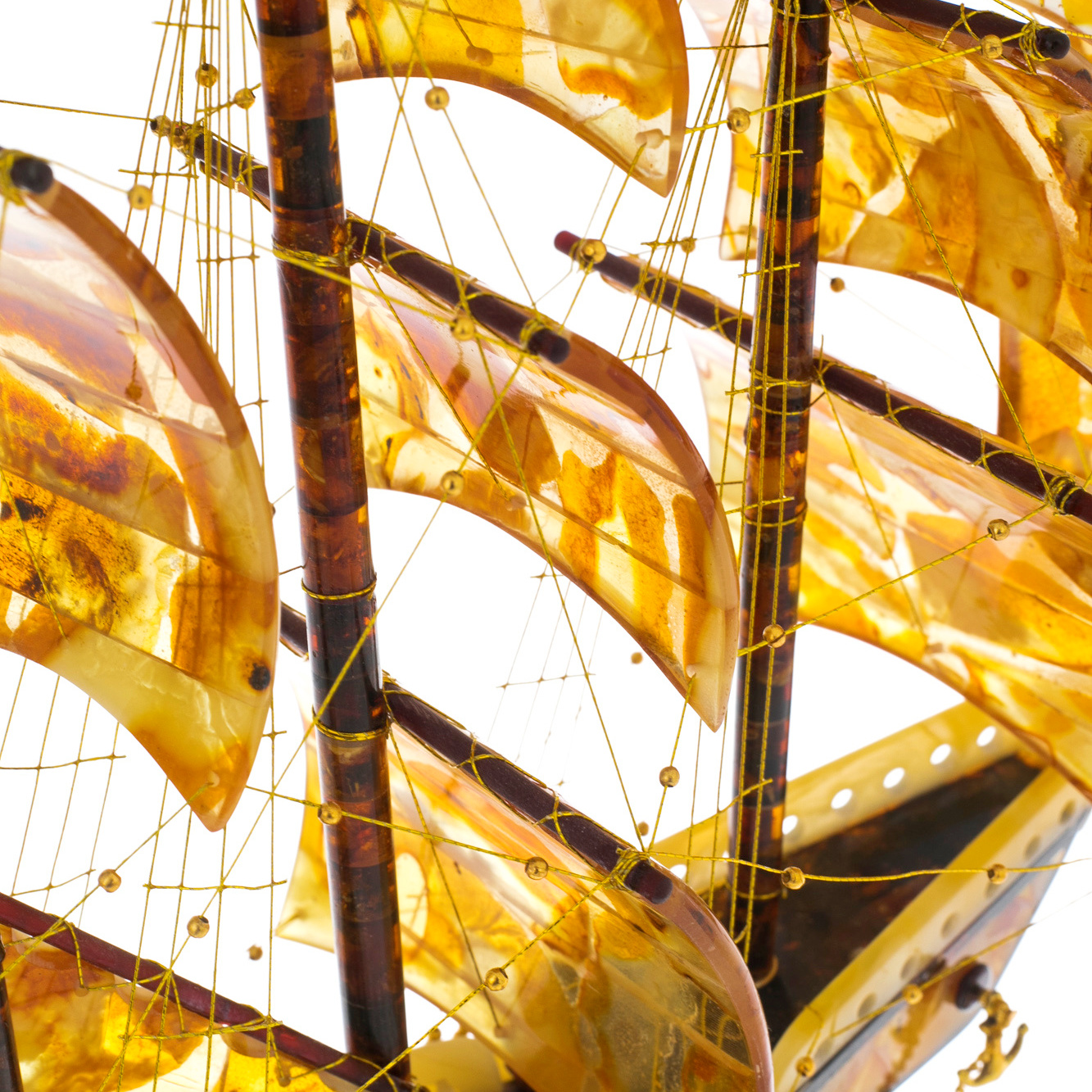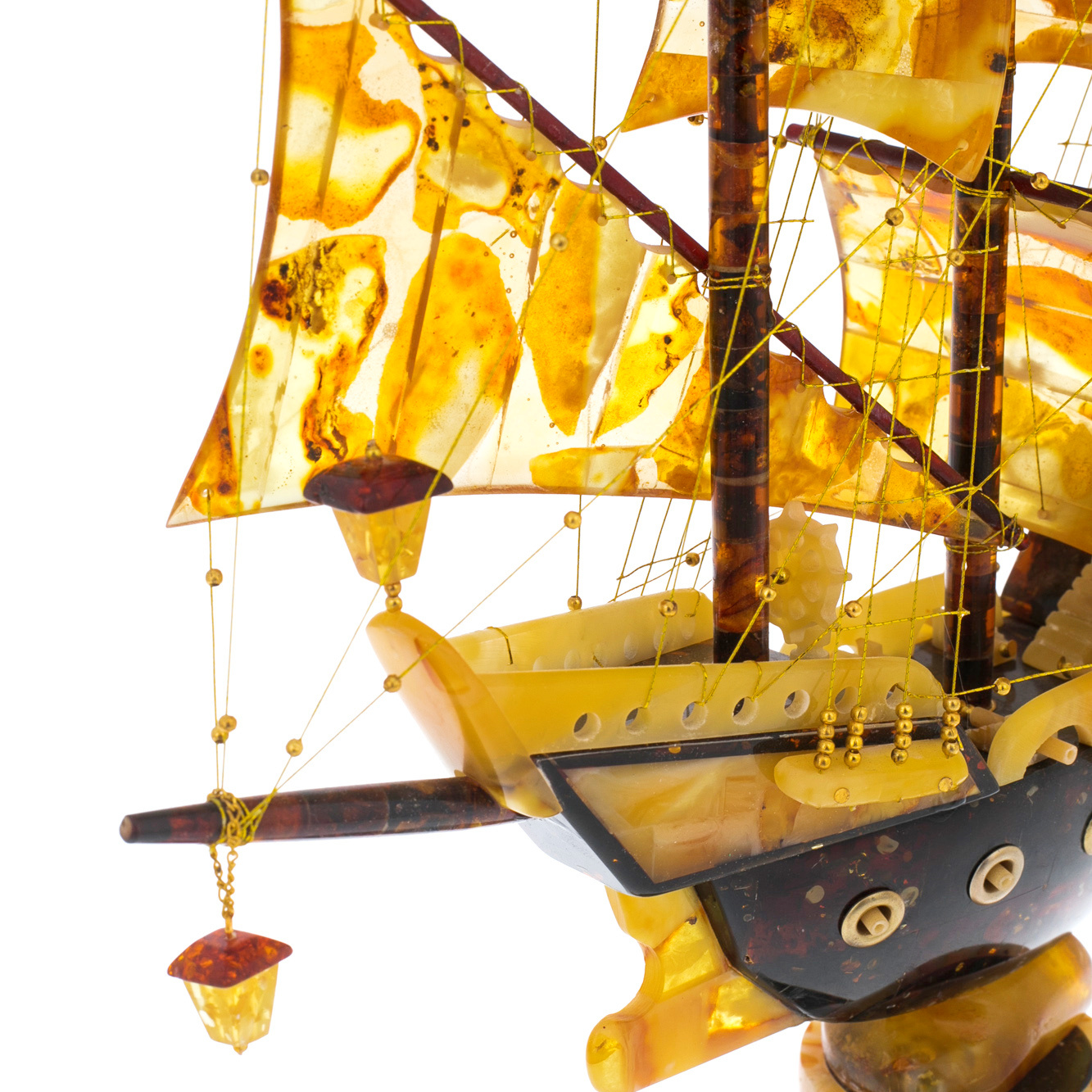 Основание, выполненное из более темных оттенков янтаря, олицетворяет глубины морей и неизведанные тайны, что скрыты под водной гладью. Янтарь, как символ накопленной мудрости и внутреннего света, делает этот корабль не просто украшением, а мощным артефактом, приносящим удачу и защищающим от невзгод.