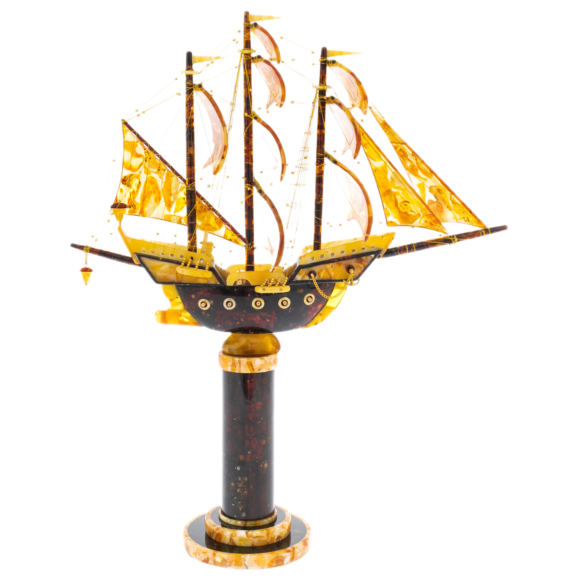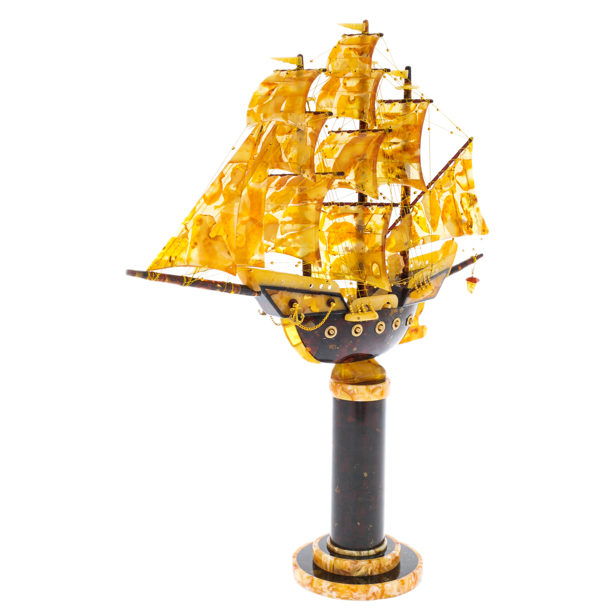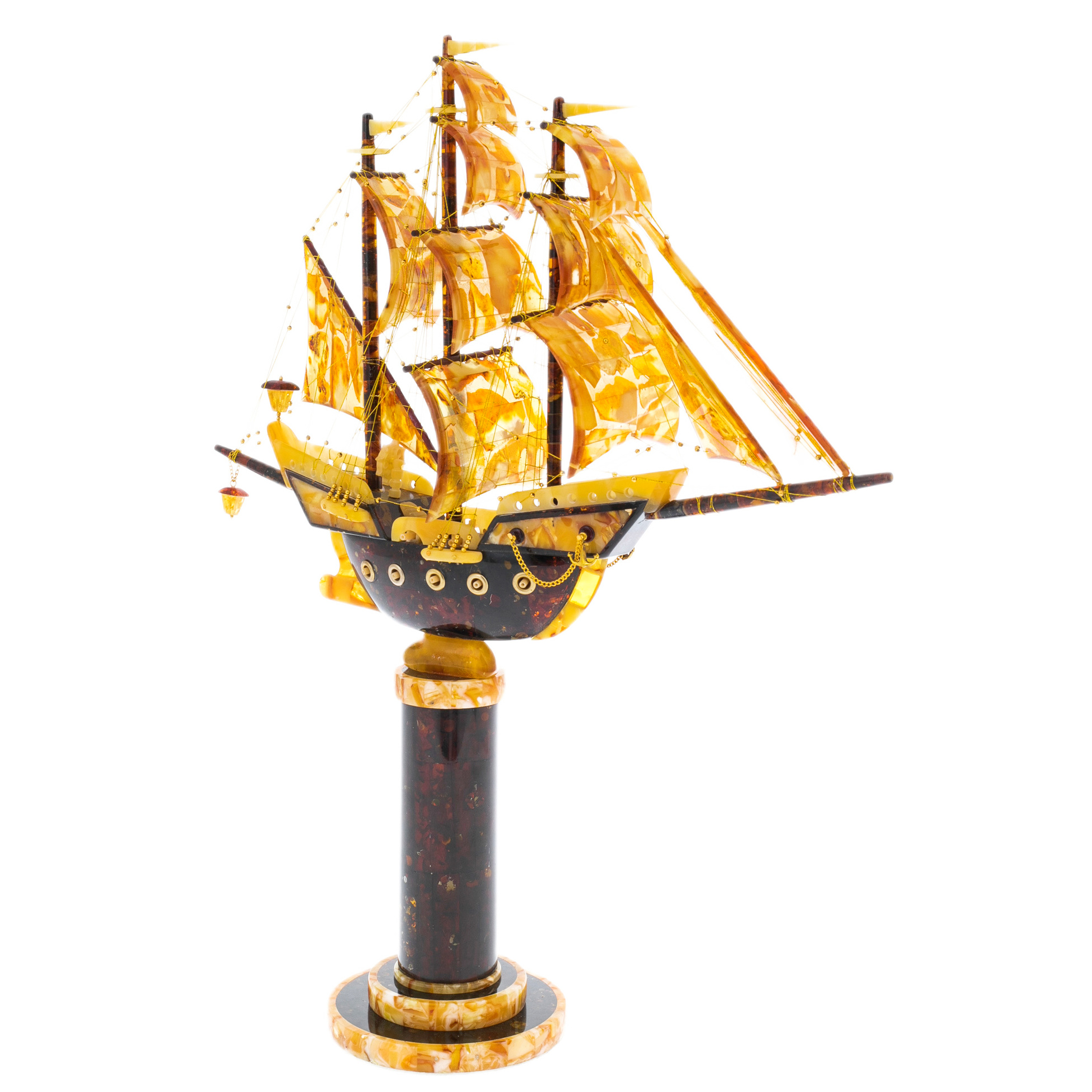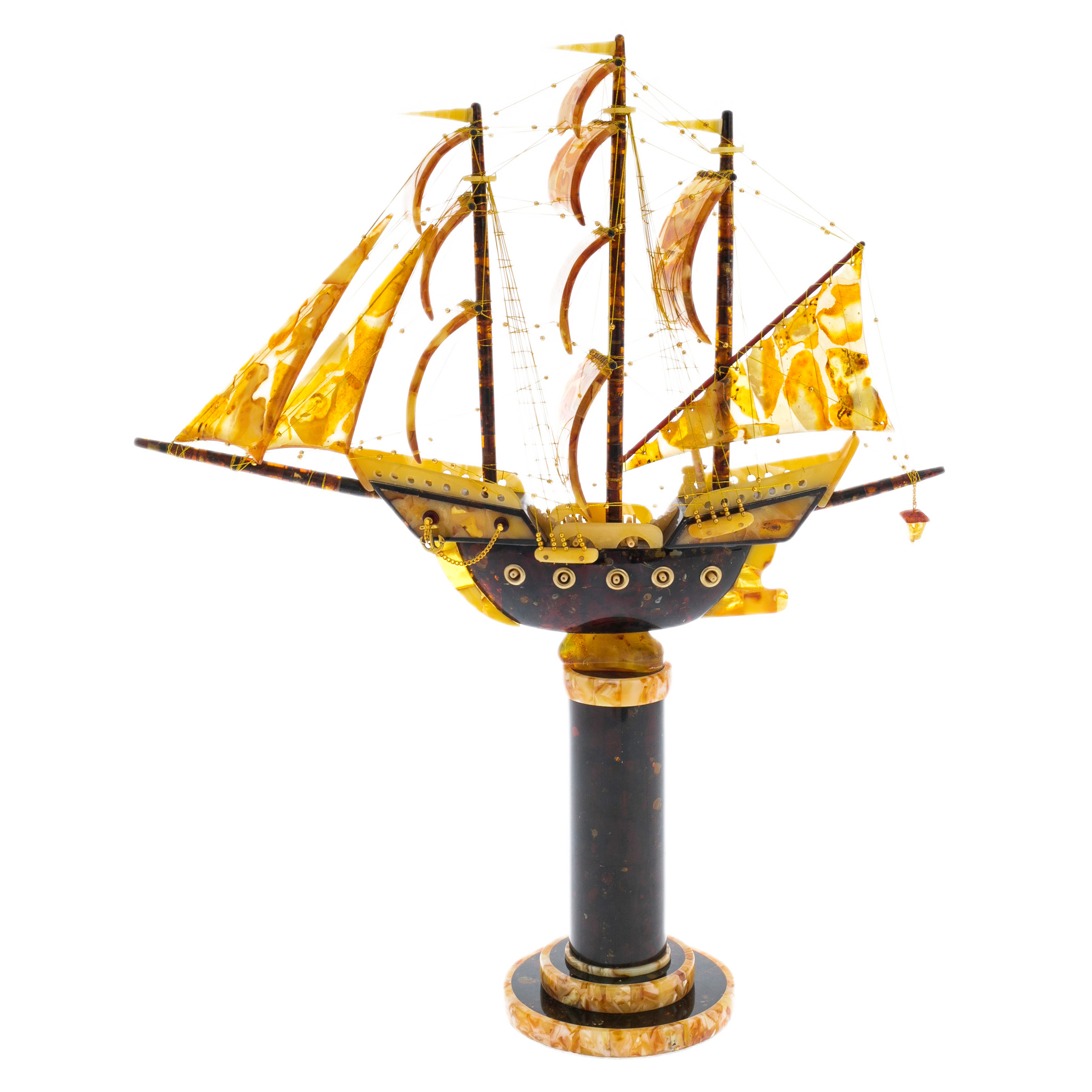 Основание, выполненное из более темных оттенков янтаря, олицетворяет глубины морей и неизведанные тайны, что скрыты под водной гладью. Янтарь, как символ накопленной мудрости и внутреннего света, делает этот корабль не просто украшением, а мощным артефактом, приносящим удачу и защищающим от невзгод.