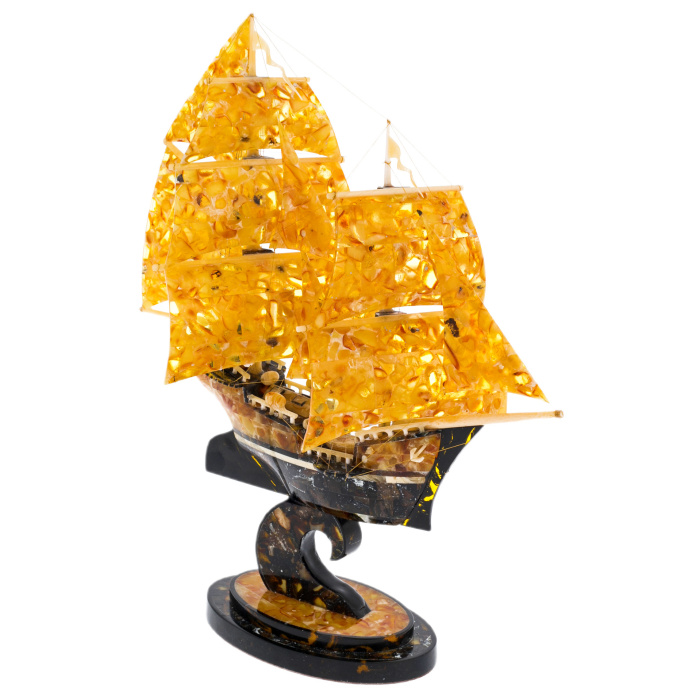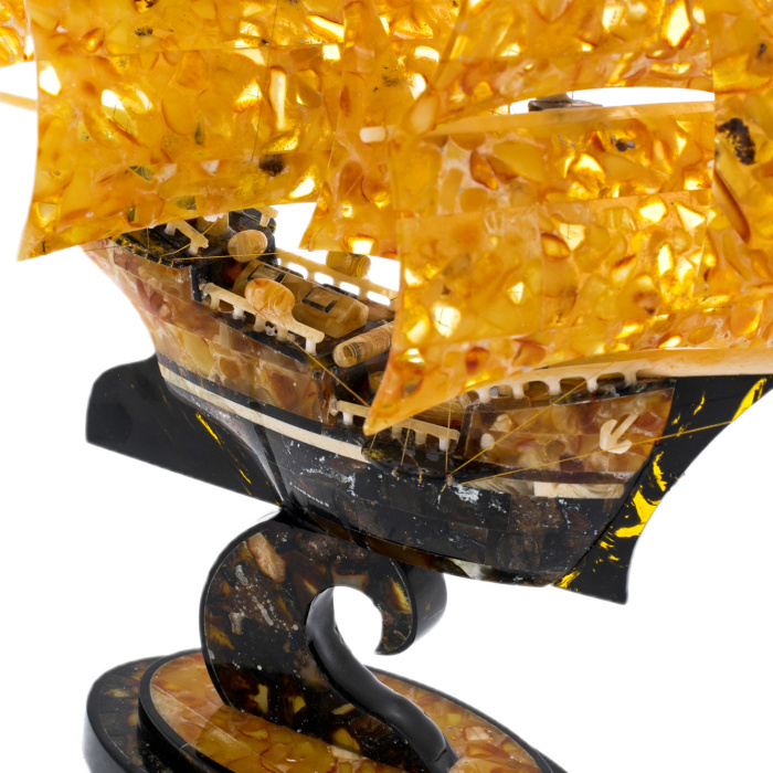 Композиция выполнена из янтаря и декоративного камня, собранных в многослойную модель. Паруса изготовлены из крупных янтарных пластин яркой золотистой гаммы, пронизанных мозаичной фактурой и естественными включениями: внутри читаются световые "осколки", тёплые искры, прозрачные просветы, усиливающие эффект сияния при любом освещении. Реи и мачты выполнены из светлого материала, подчёркивающего воздушность парусов; натяжение тонких такелажных нитей добавляет графику и точность, делая модель убедительной. Корпус набран сложной мозаикой: янтарные вставки соседствуют с тёмными слоями, напоминающими морёное дерево и корабельную обшивку, видны элементы палубы и надстроек, придающие образу архитектурную завершённость. Основание решено как скульптурная "волна" из тёмного камня с янтарными прожилками и золотистыми всплесками, поставленная на круглую платформу; этот изгиб держит корабль в лёгком подъёме, создавая впечатление, будто судно подхвачено гребнем и поднято над водой.