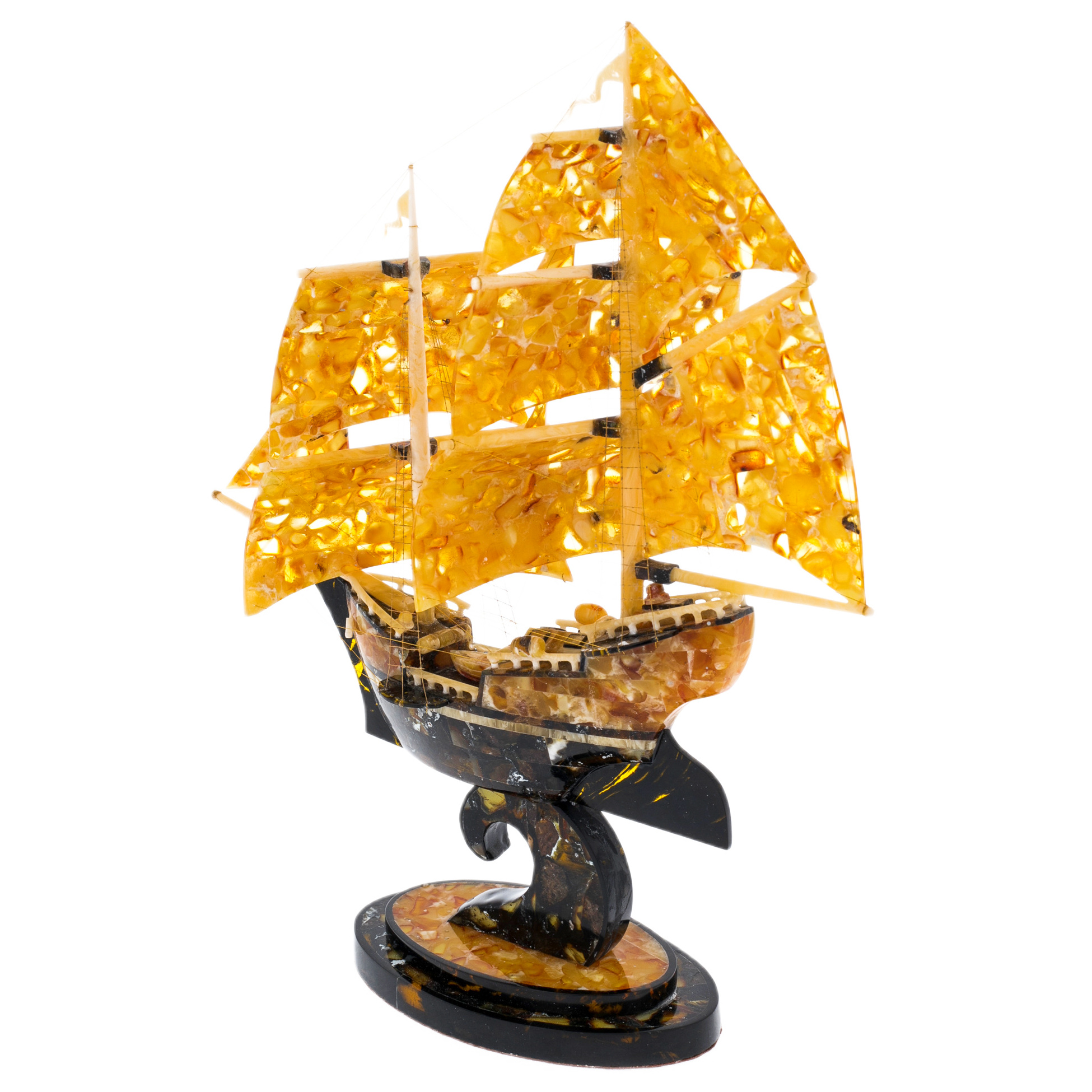 Корабль из янтаря "Фрегат на волне" — интерьерная композиция, построенная на контрасте движения и опоры, где парусник будто вырывается вперёд из тёмной волны, удерживаемый на мгновение в драгоценном материале. Судно показано не статично, а в ходе: паруса наполнены ветром, мачты выстроены ступенями, силуэт смещён вперёд, создавая ощущение курса и цели. Такой объект воспринимается как символ победного пути — для тех, кому близки море, путешествия, риск и умение управлять обстоятельствами, сохраняя холодную точность решений.
