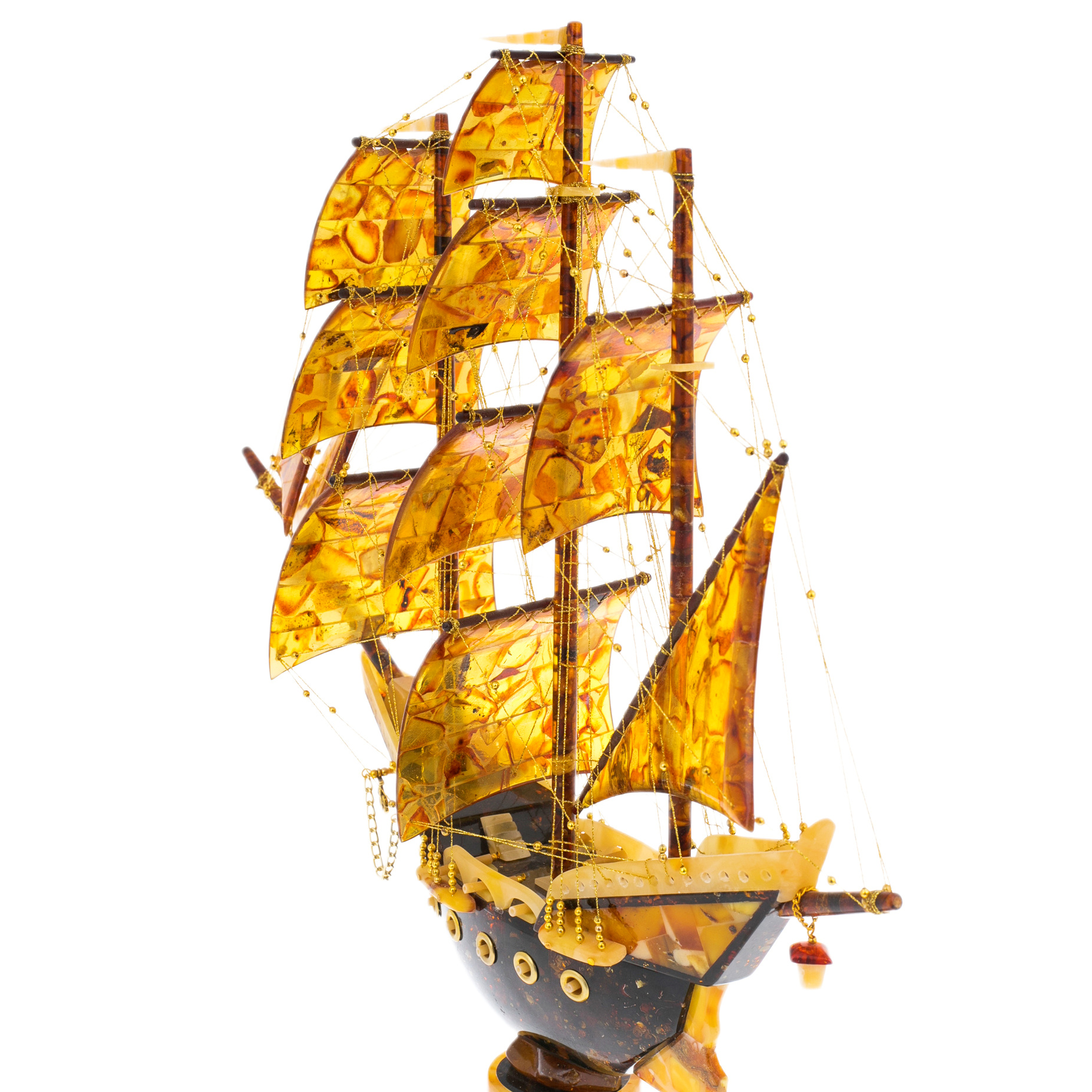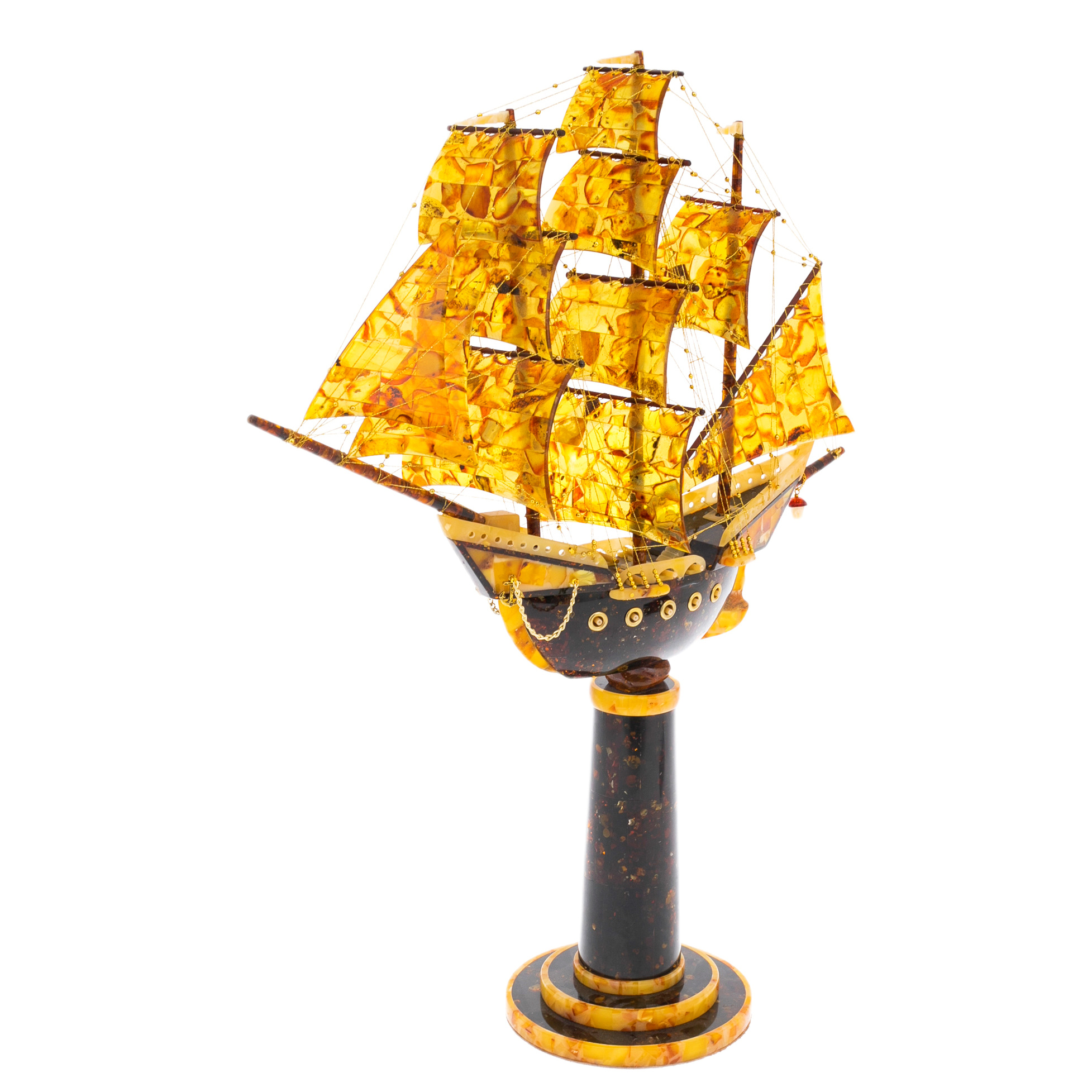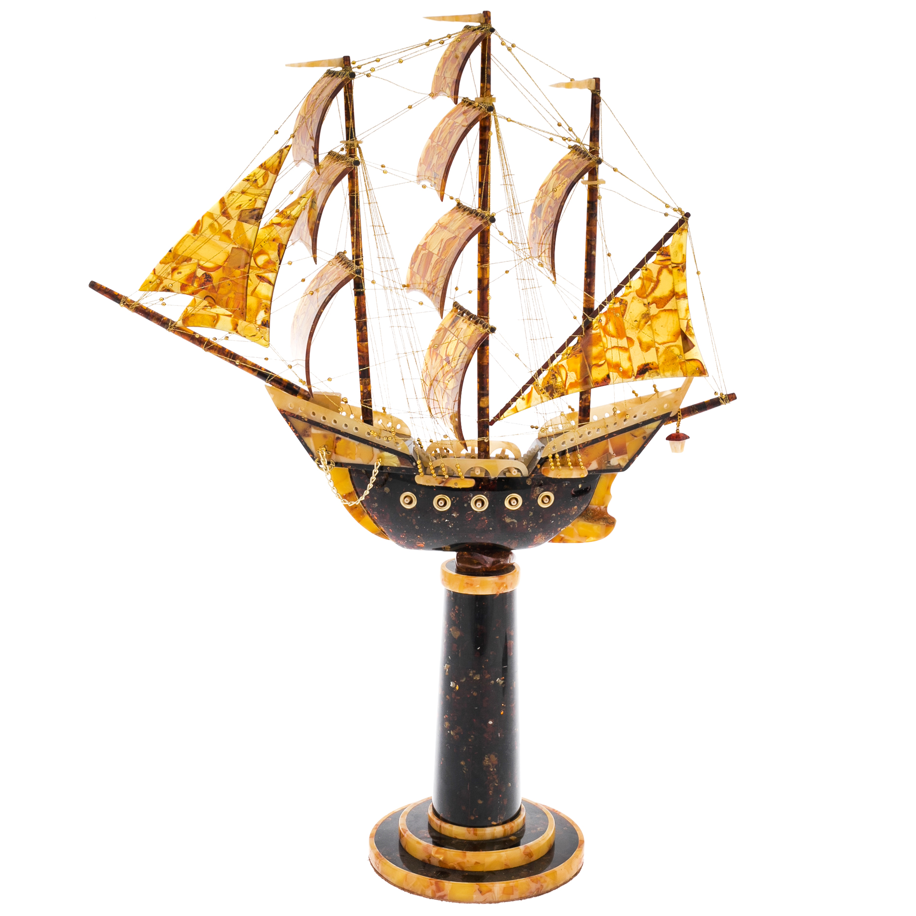 Особое очарование работе придают прозрачные янтарные паруса, пронзённые солнечным светом. Их поверхность будто хранит в себе дыхание моря и шёпот волн, а темный корпус корабля усиливает игру контрастов и добавляет глубину образу. Изящная подставка придаёт изделию монументальность и превращает его в полноценный интерьерный акцент.