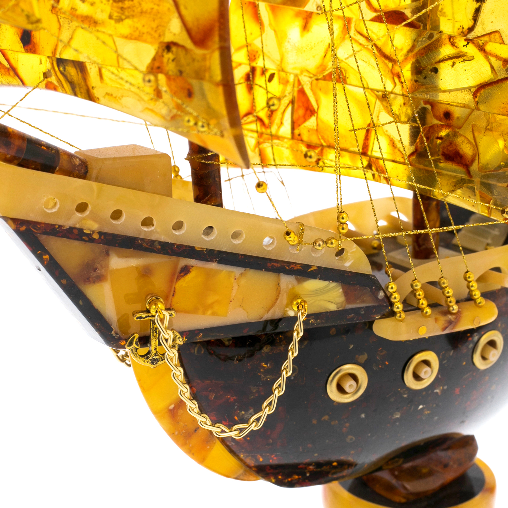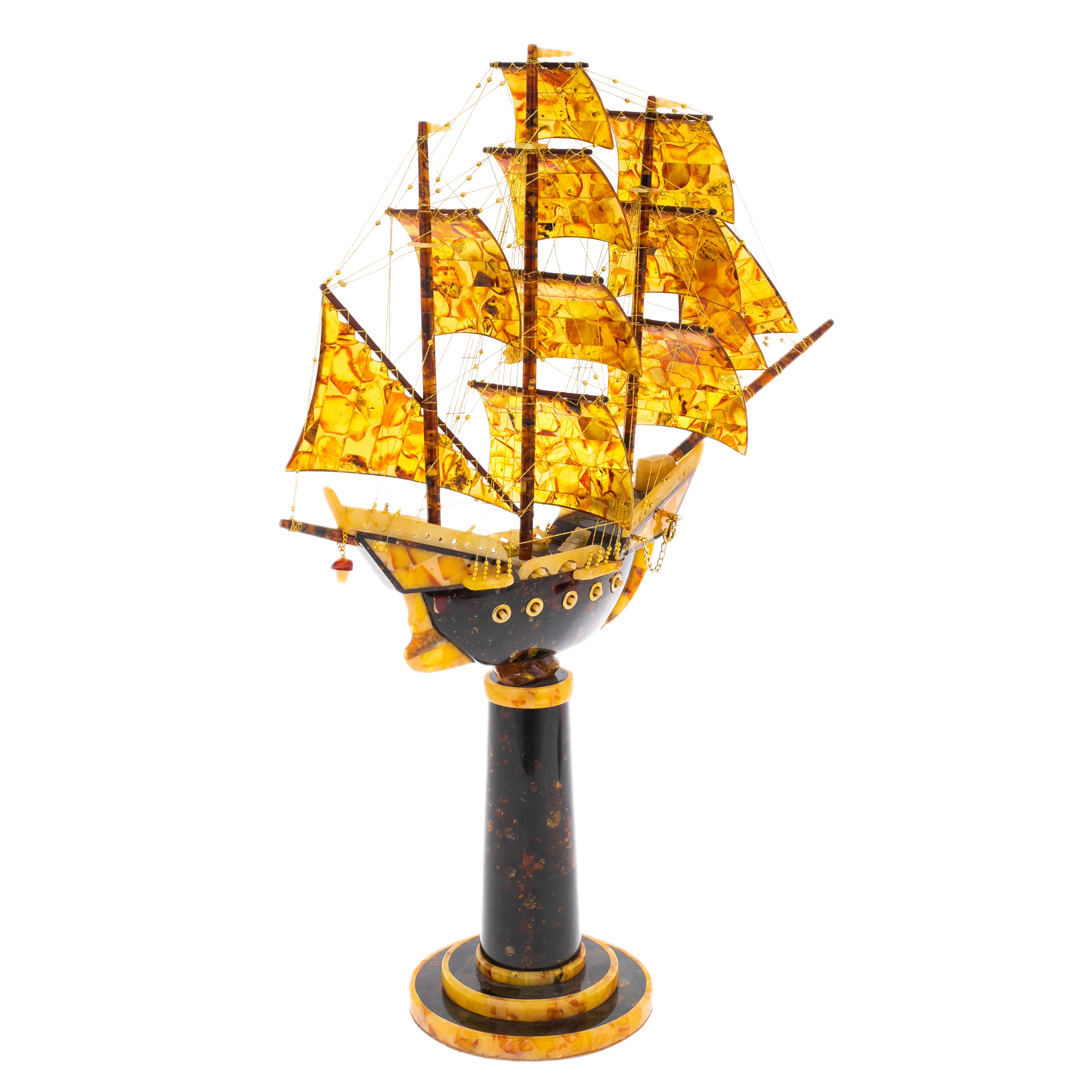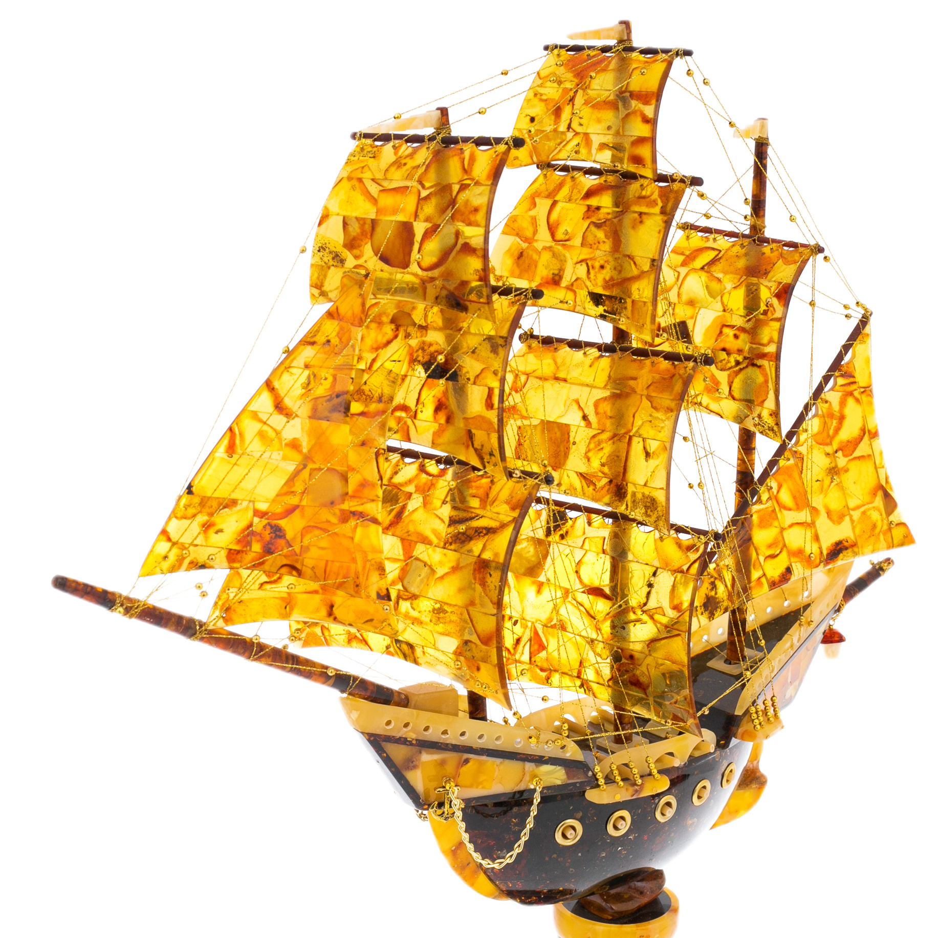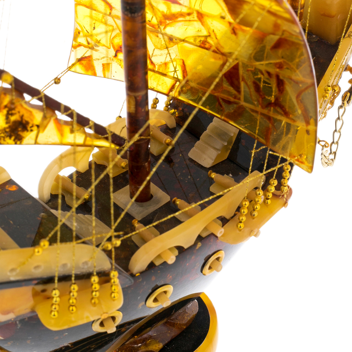 Особое очарование работе придают прозрачные янтарные паруса, пронзённые солнечным светом. Их поверхность будто хранит в себе дыхание моря и шёпот волн, а темный корпус корабля усиливает игру контрастов и добавляет глубину образу. Изящная подставка придаёт изделию монументальность и превращает его в полноценный интерьерный акцент.
