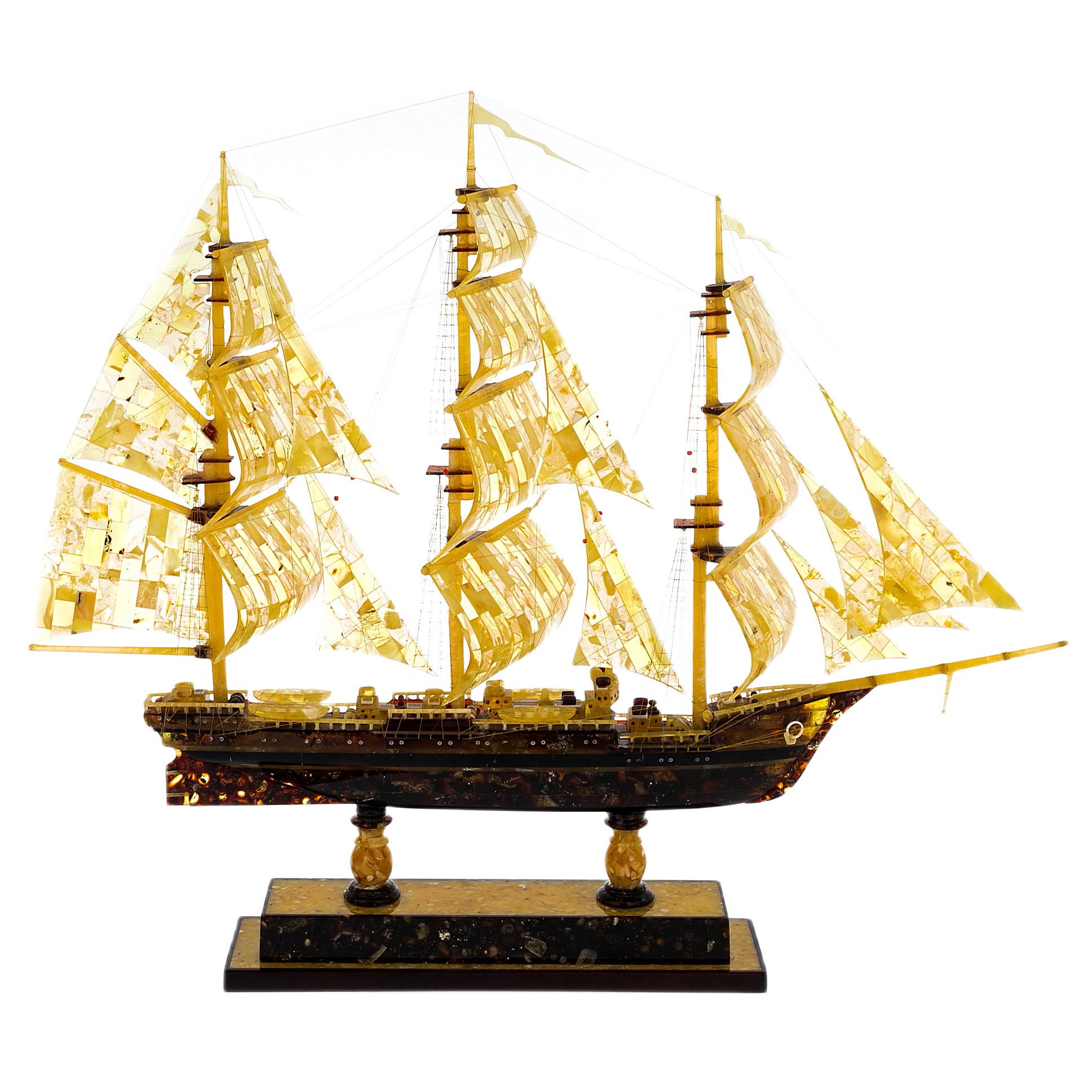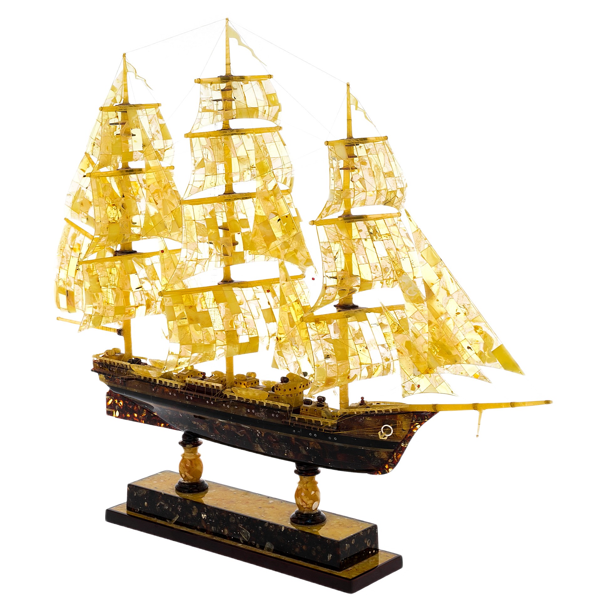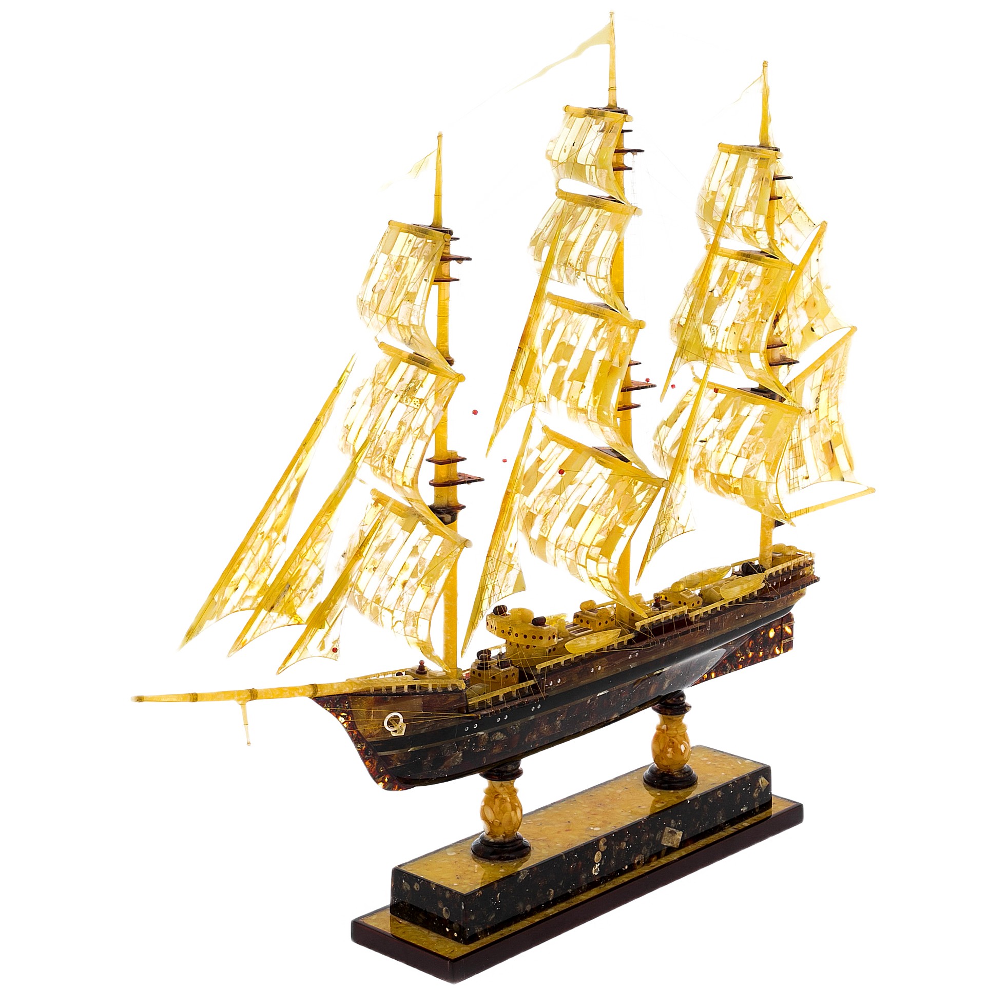 Корабль установлен на подставке из янтаря, что подчеркивает статус и роскошь этого произведения. "Барк" станет центральным элементом любой коллекции или выдающимся украшением интерьера для любителей морской тематики, навигации и истории мореплавания.