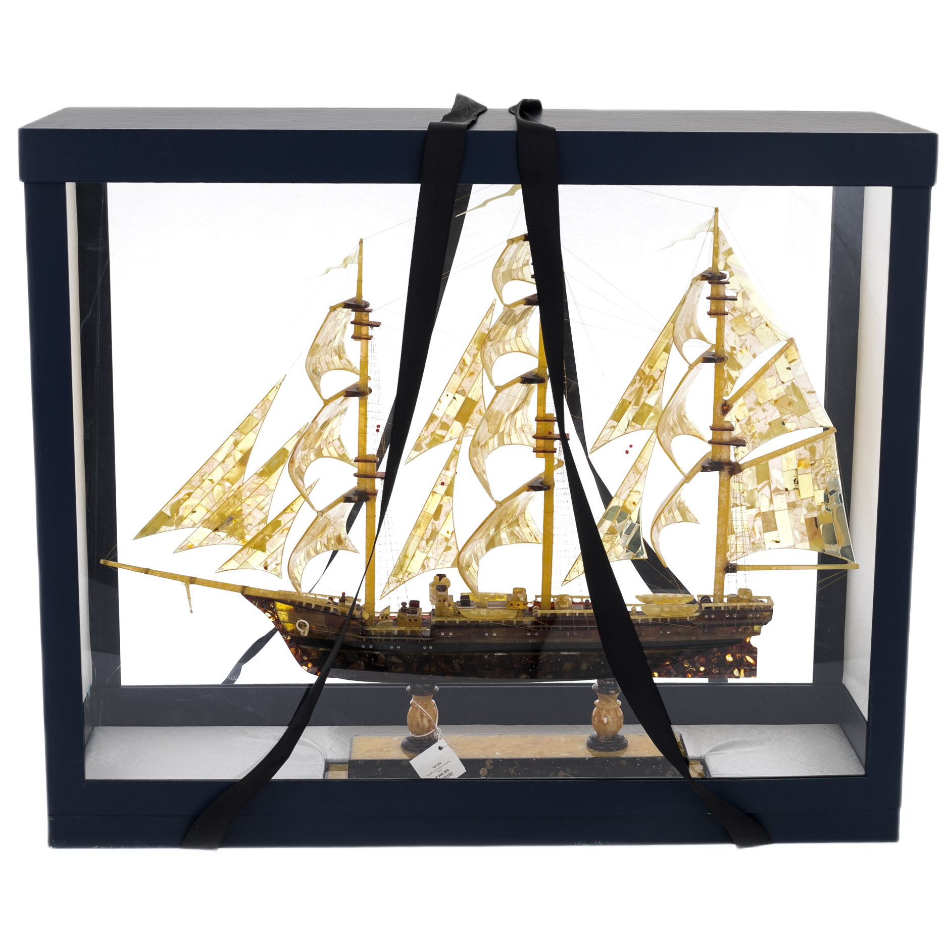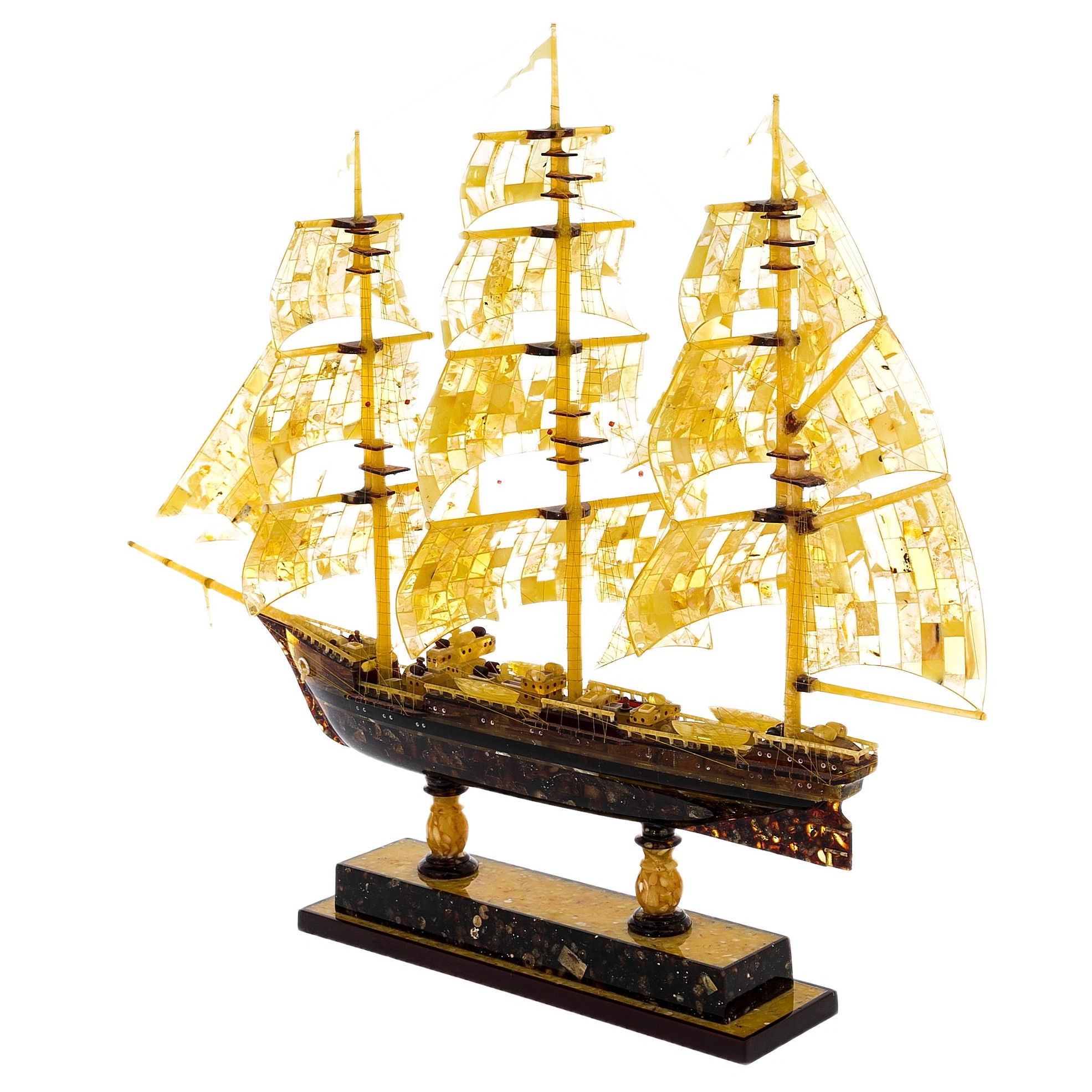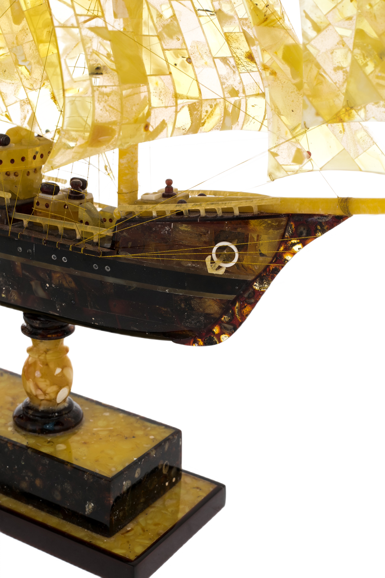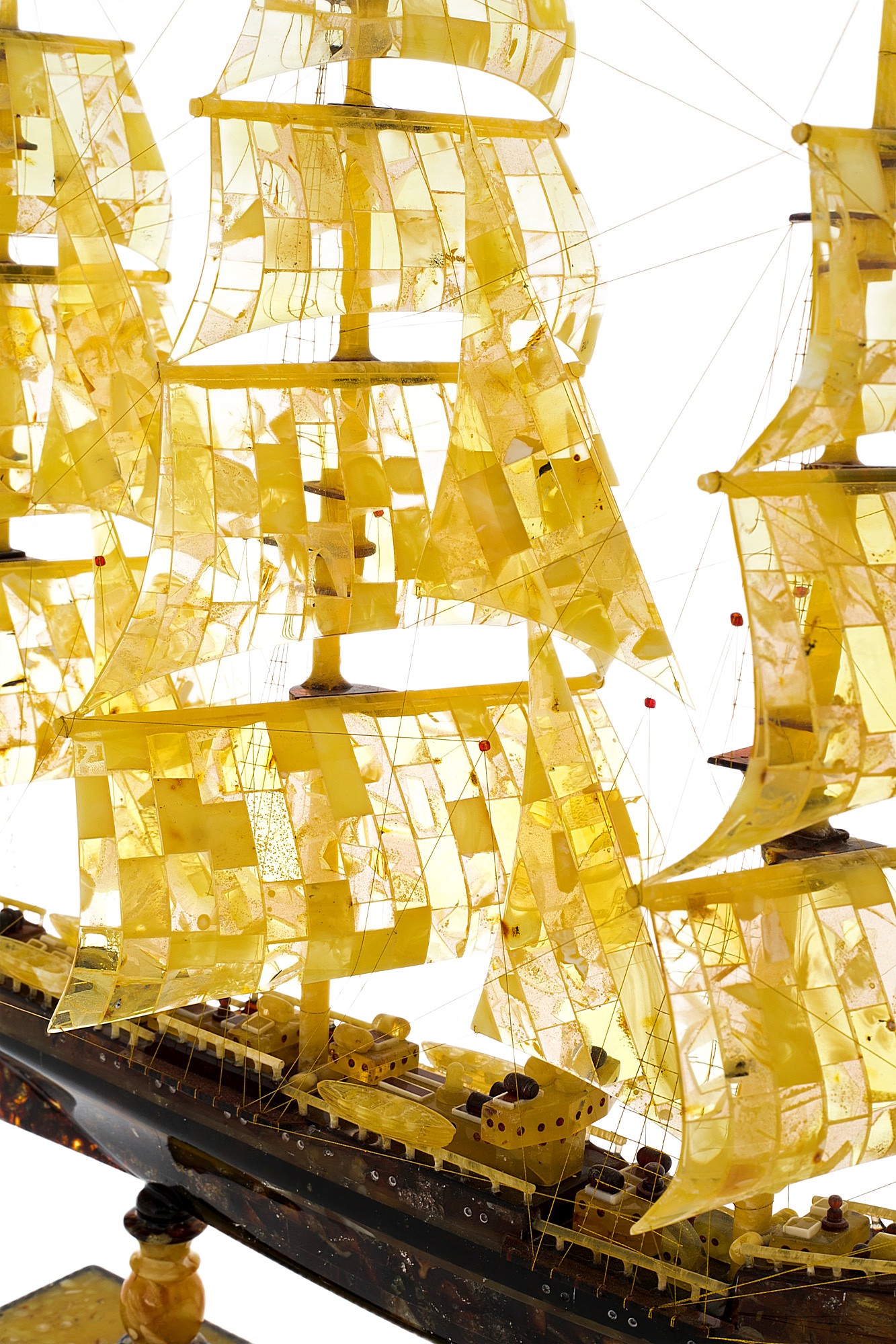 Детализация модели поражает воображение: каждый элемент, от мачт до парусов и палубы, выполнен с особой тщательностью. Паруса корабля, словно окутанные солнечным светом, демонстрируют богатство узоров, которые мастерски воплощены через янтарь. Это не только техническое достижение, но и искусство, передающее дух приключений и открытий.