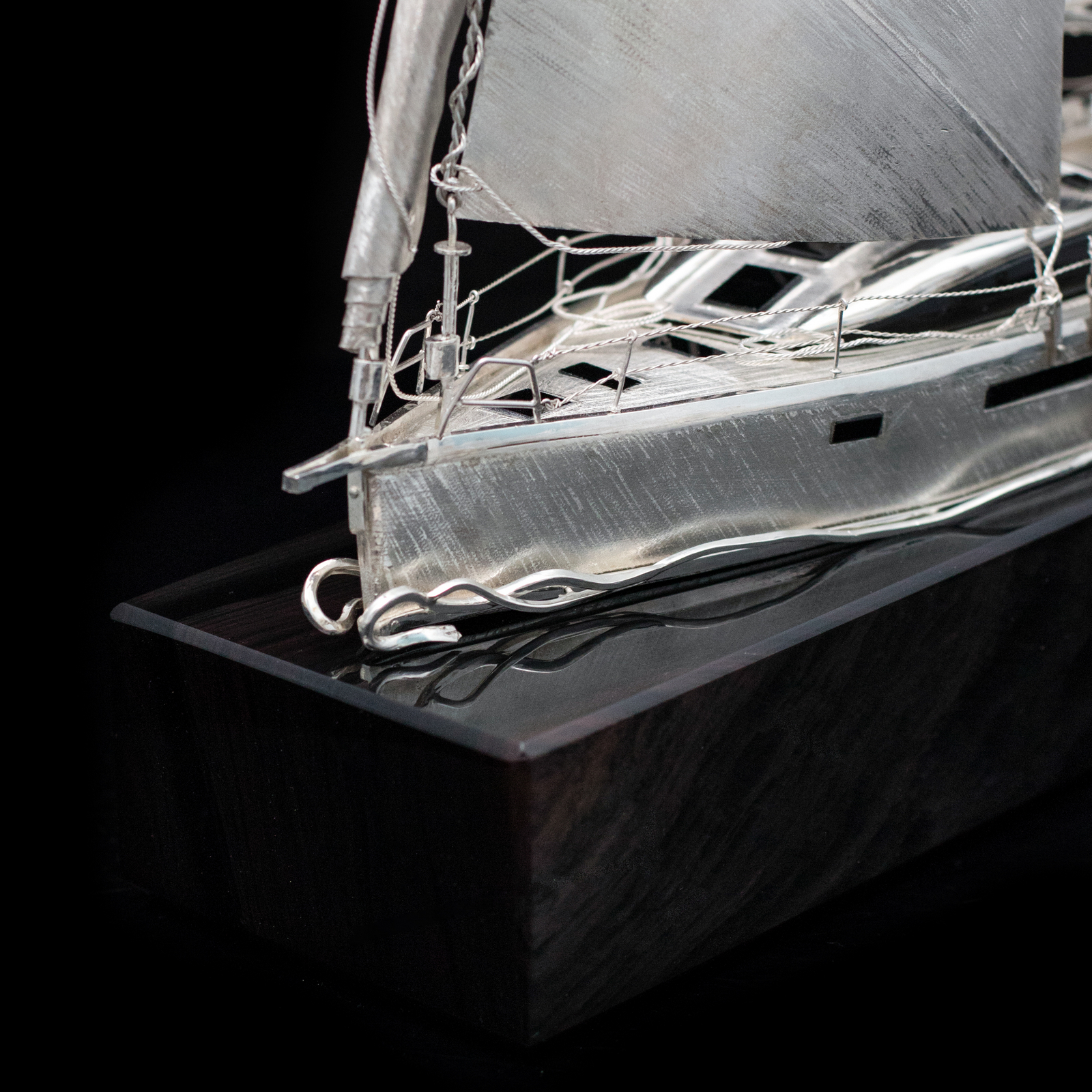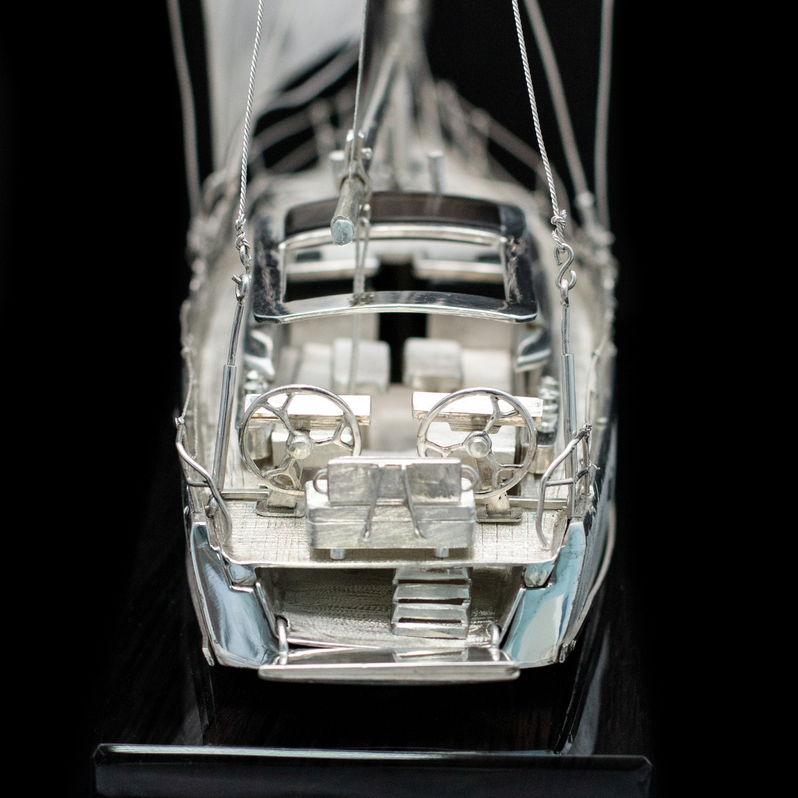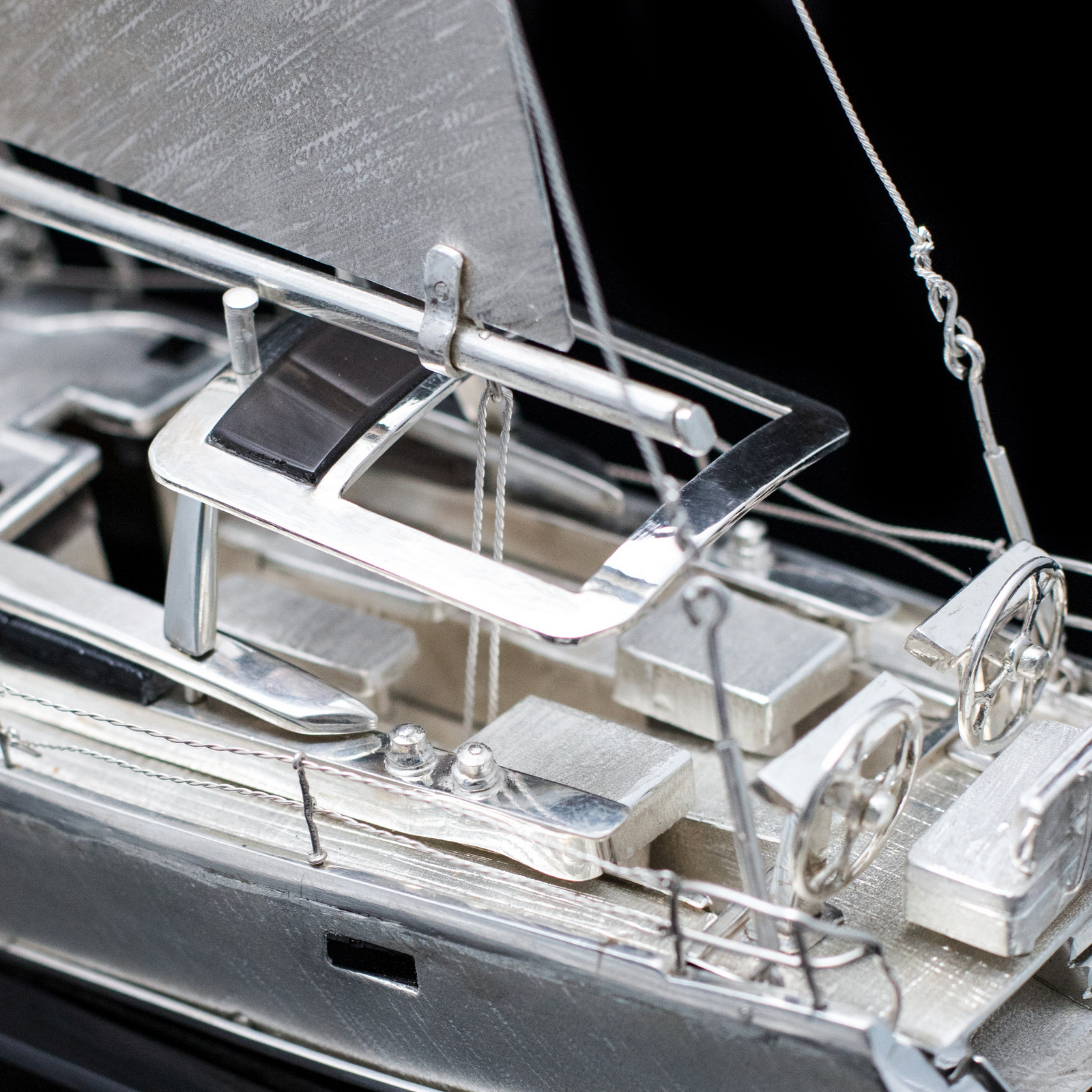 Каждая часть яхты, от такелажа до парусов, выполнена с использованием особых ювелирных техник, благодаря чему модель передает все нюансы реальной яхты. Масштаб 1:43 позволяет в полной мере оценить красоту и сложность конструкции, делая эту яхту великолепным произведением искусства.