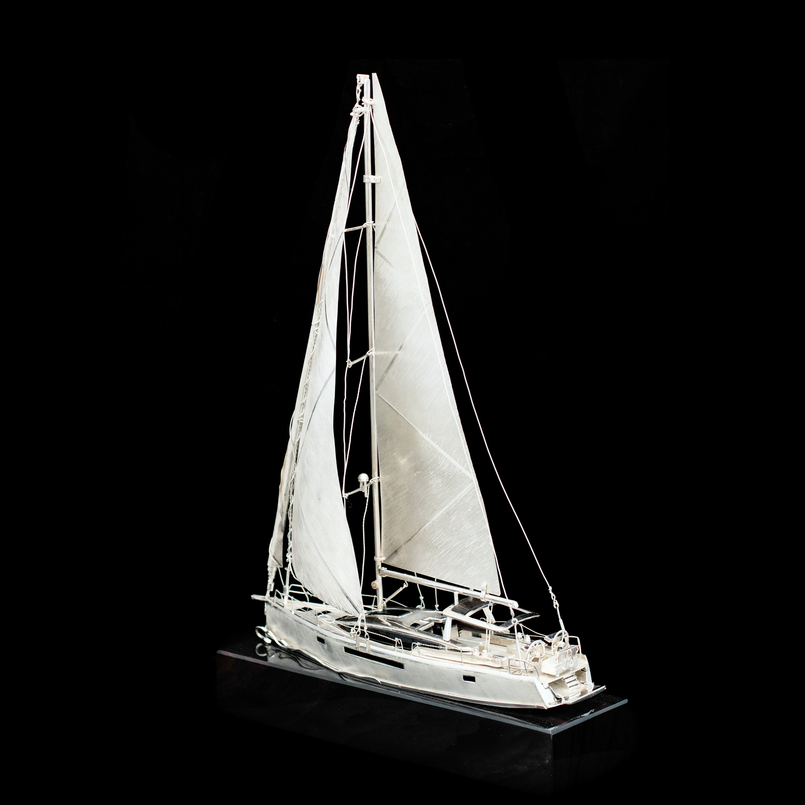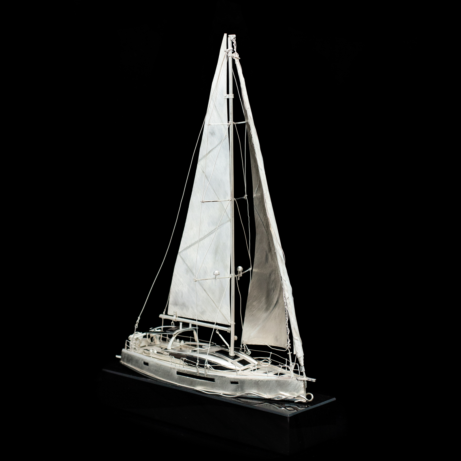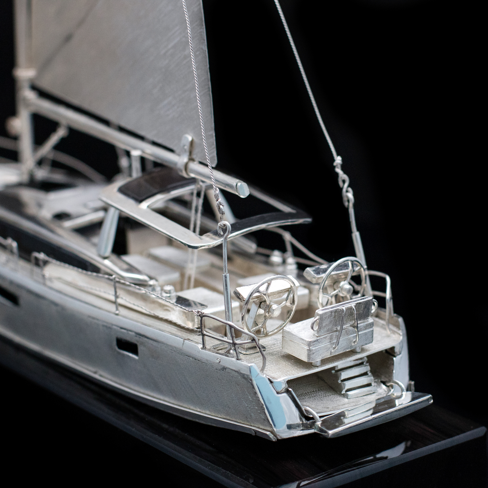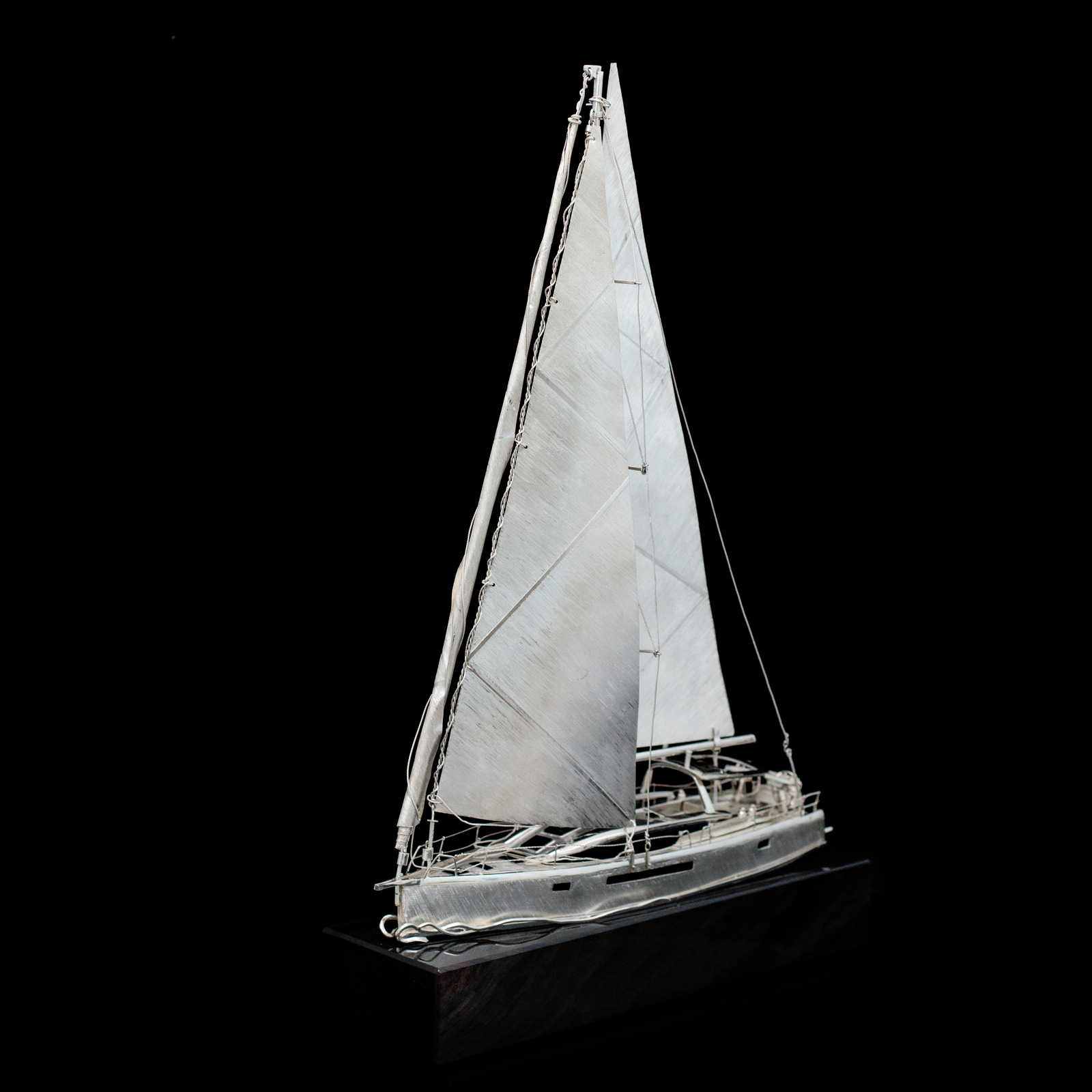 Представляем эксклюзивную модель парусной яхты "Jeanneau Сornetta 65", воплощение мастерства и роскоши, выполненное полностью вручную из серебра 925 пробы. Эта точная копия 65-футового судна знаменитой французской верфи Jeanneau собрана из более 350 отдельных деталей, демонстрируя несравненную точность и внимание к деталям.