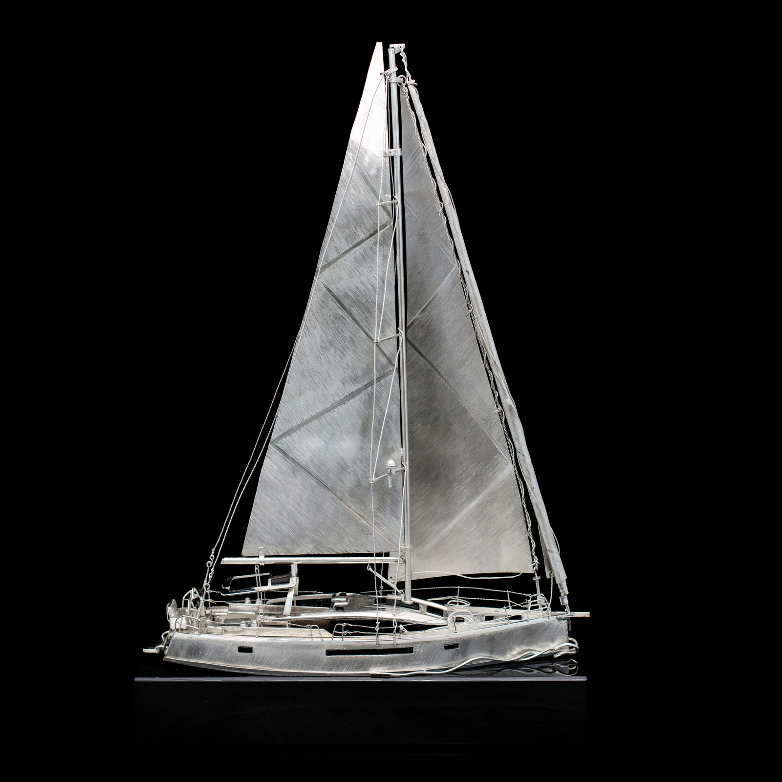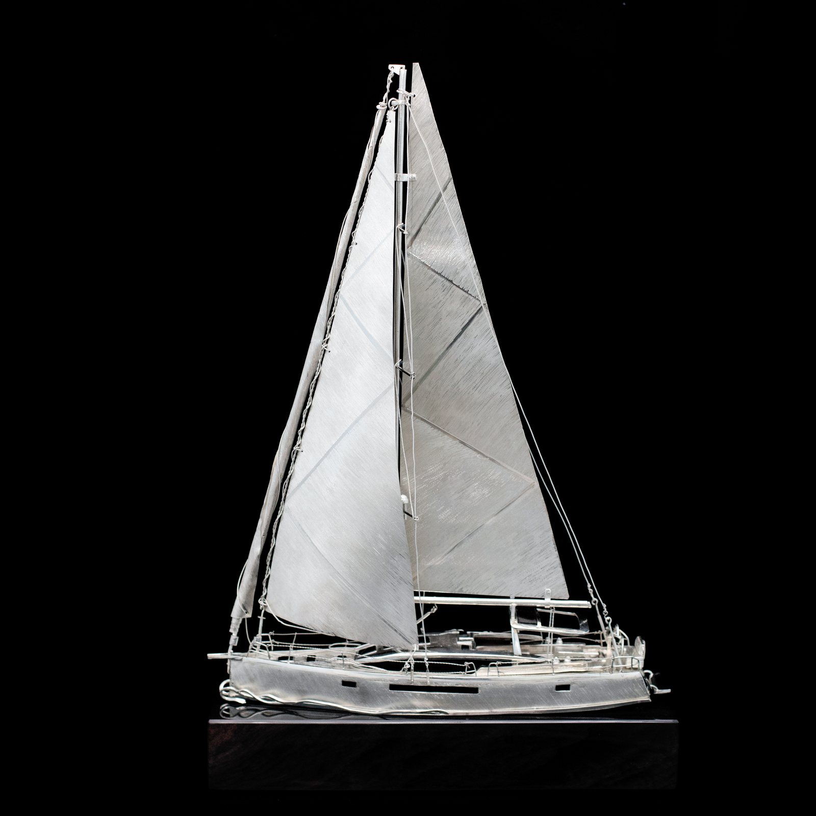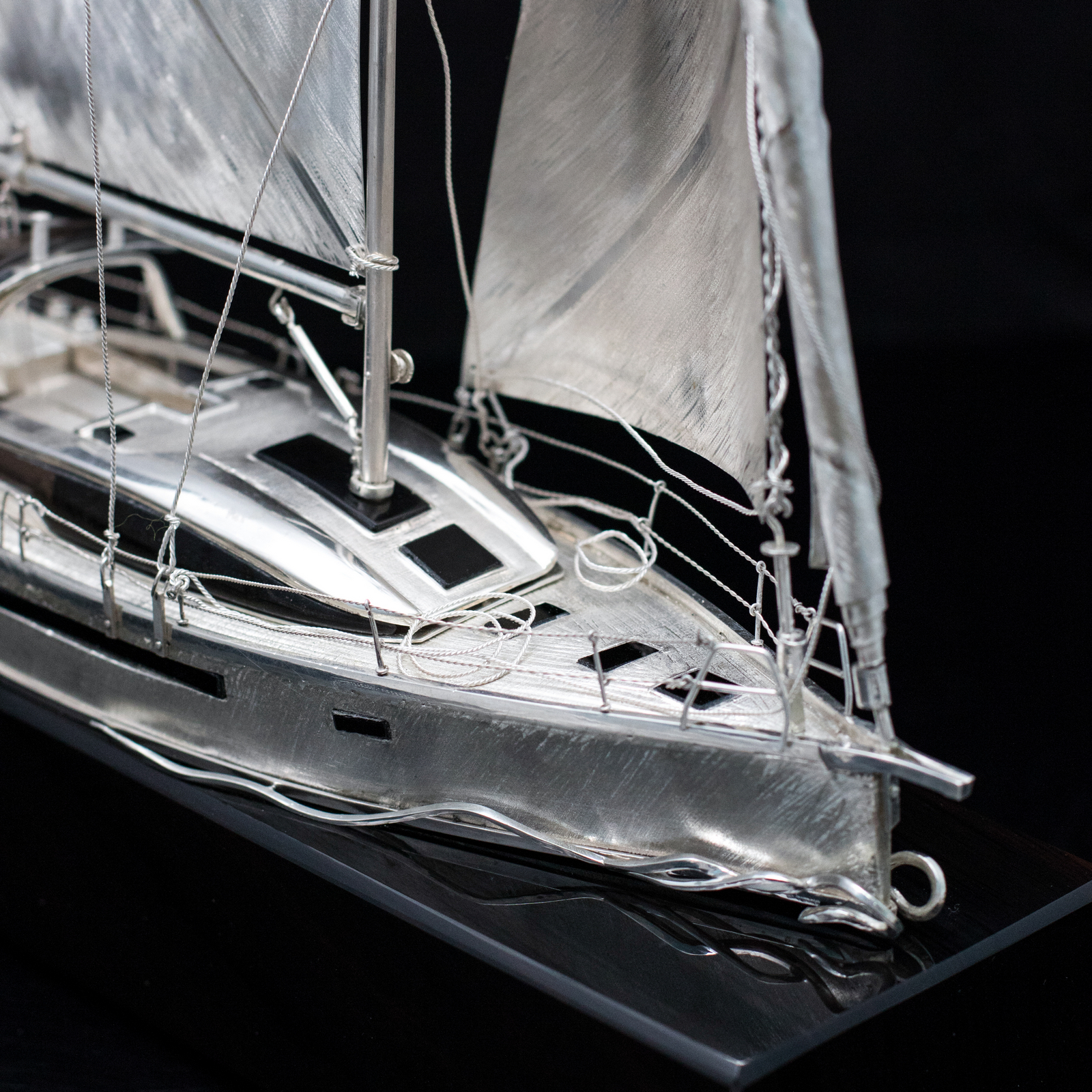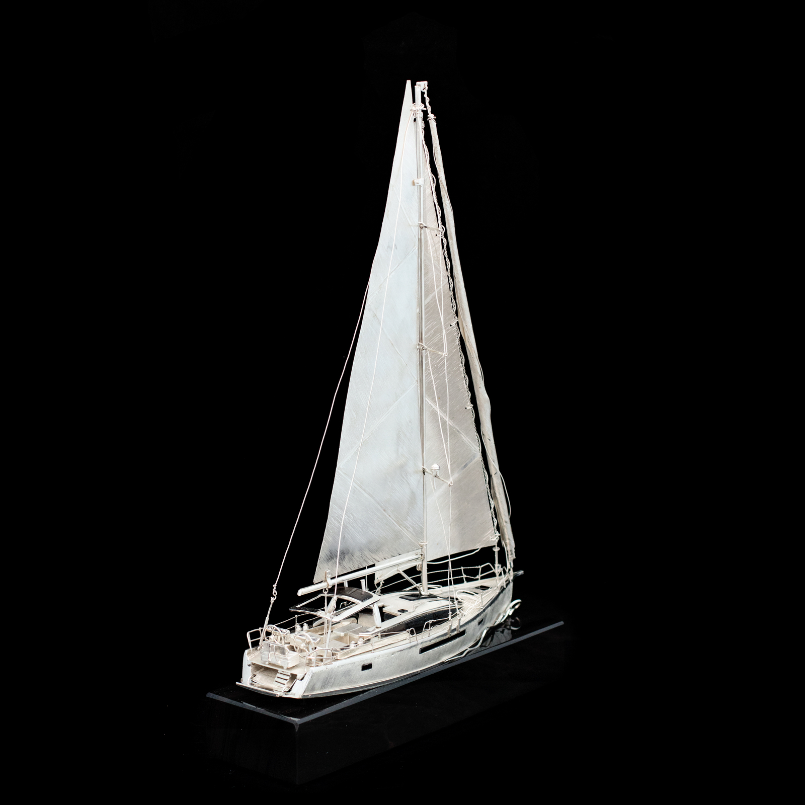 Представляем эксклюзивную модель парусной яхты "Jeanneau Сornetta 65", воплощение мастерства и роскоши, выполненное полностью вручную из серебра 925 пробы. Эта точная копия 65-футового судна знаменитой французской верфи Jeanneau собрана из более 350 отдельных деталей, демонстрируя несравненную точность и внимание к деталям.