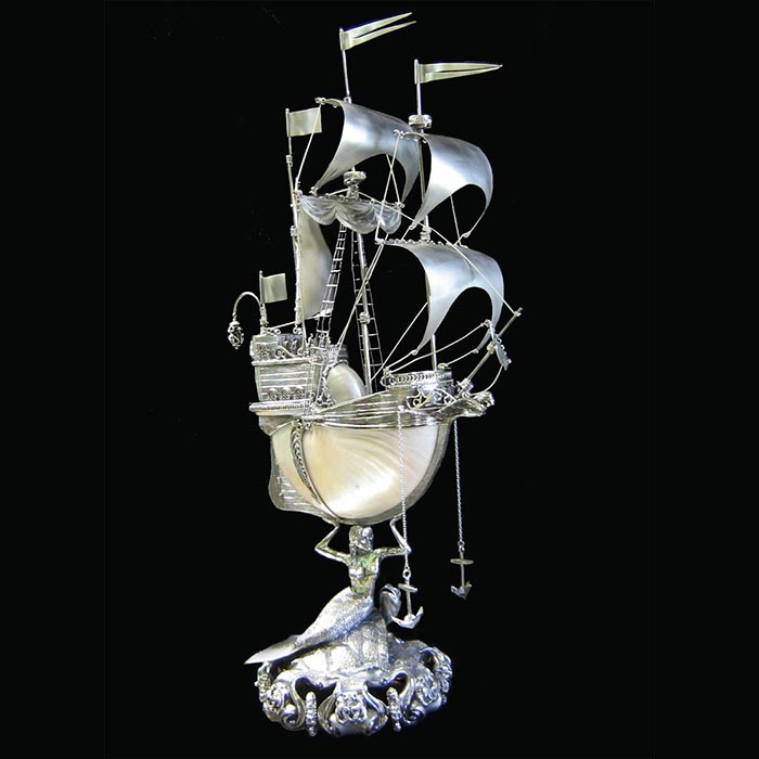 Отправьтесь в эпоху морских приключений с "Флибустьером", эксклюзивным серебряным кораблем, олицетворяющим смелость и свободу пиратской жизни. Это уникальное изделие, изготовленное из серебра 925 пробы и украшенное элементами морской раковины Nautilus, демонстрирует высочайшее мастерство и внимание к деталям, воссоздавая дух авантюр и непокоренных морей.
