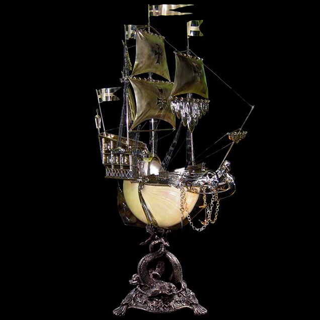 Познакомьтесь с "Фрегатом", эксклюзивным серебряным кораблем, который является шедевром ювелирного искусства и морской инженерии. Изготовленный из серебра 925 пробы и дополненный элементами морской раковины Nautilus, этот корабль отличается изысканностью дизайна и богатством деталей, олицетворяя дух морских приключений и историческое величие.