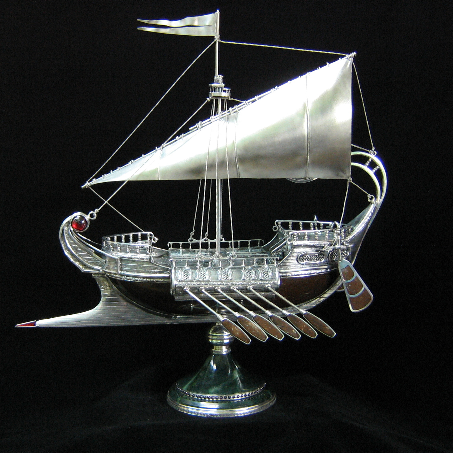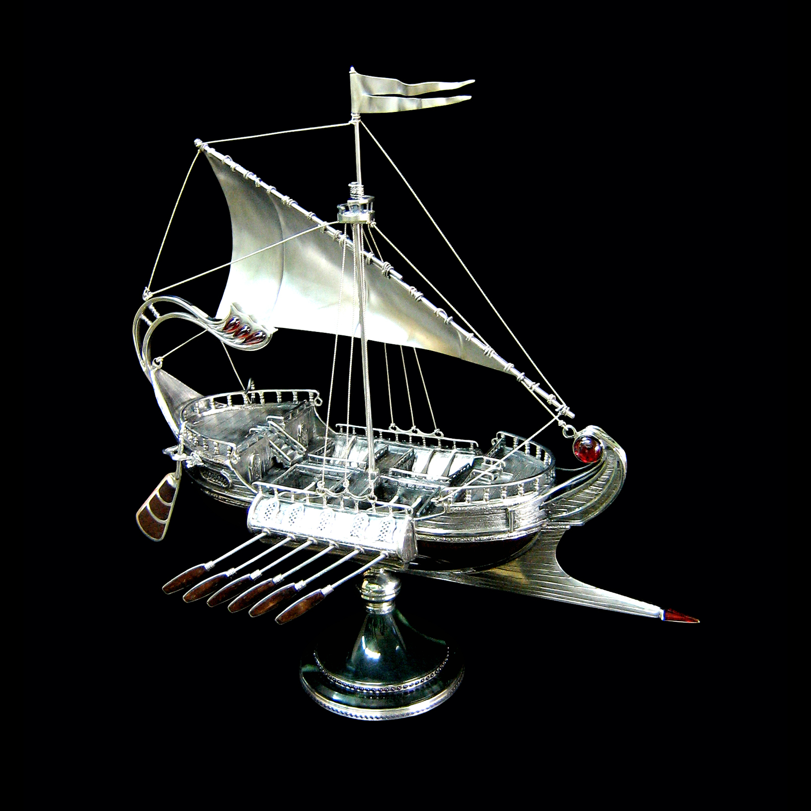 Изящное воплощение средневекового военного корабля в драгоценном металле притягивает взгляд сложной архитектурой, филигранной деталировкой и аристократической строгостью линий. Массивный серебряный корпус, исполненный в стиле античных галер, подчеркивает мощь и величие корабля. Тонкие серебряные мачты вздымаются ввысь, поддерживая парус, отливающий шелковым блеском. Миниатюрные весла с инкрустацией из нефрита ритмично выстраиваются вдоль борта, намекая на безупречный порядок и дисциплину флотилии.
