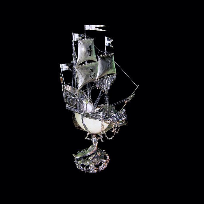 Серебряный корабль «Каравелла» — воплощение великой эпохи географических открытий, созданное мастерами ювелирного искусства. Изящный корпус, основанный на натуральной раковине, перламутровым блеском отсылает к морской стихии, а детали палубы, выполненные из серебра, воссоздают атмосферу парусника, несущегося сквозь океанские волны. Тонкие цепи, удерживающие парусное оснащение, миниатюрные канаты, искусно вытянутые мачты с флагами, трепещущими в воображаемом ветре, придают скульптуре динамику и воздушность. Геральдические кресты на парусах отсылают к кораблям первооткрывателей, чей путь был устремлён к неизведанным землям.