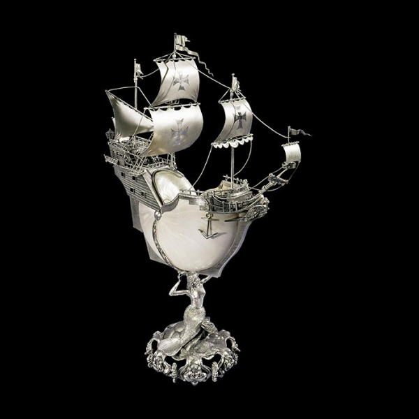 Серебряный корабль «Корвет» — воплощение романтики дальних плаваний и утончённого ювелирного мастерства. Корпус, созданный на основе натуральной морской раковины, мерцает перламутровыми отблесками, создавая иллюзию живой воды, отражающей свет луны. Над ним возвышаются изящные мачты, увенчанные развевающимися парусами с геральдическими крестами, напоминающими о славных эпохах великих открытий. Плетёные канаты, тонкие цепи и филигранные декоративные элементы создают ощущение парусника, готового разрезать морские просторы.