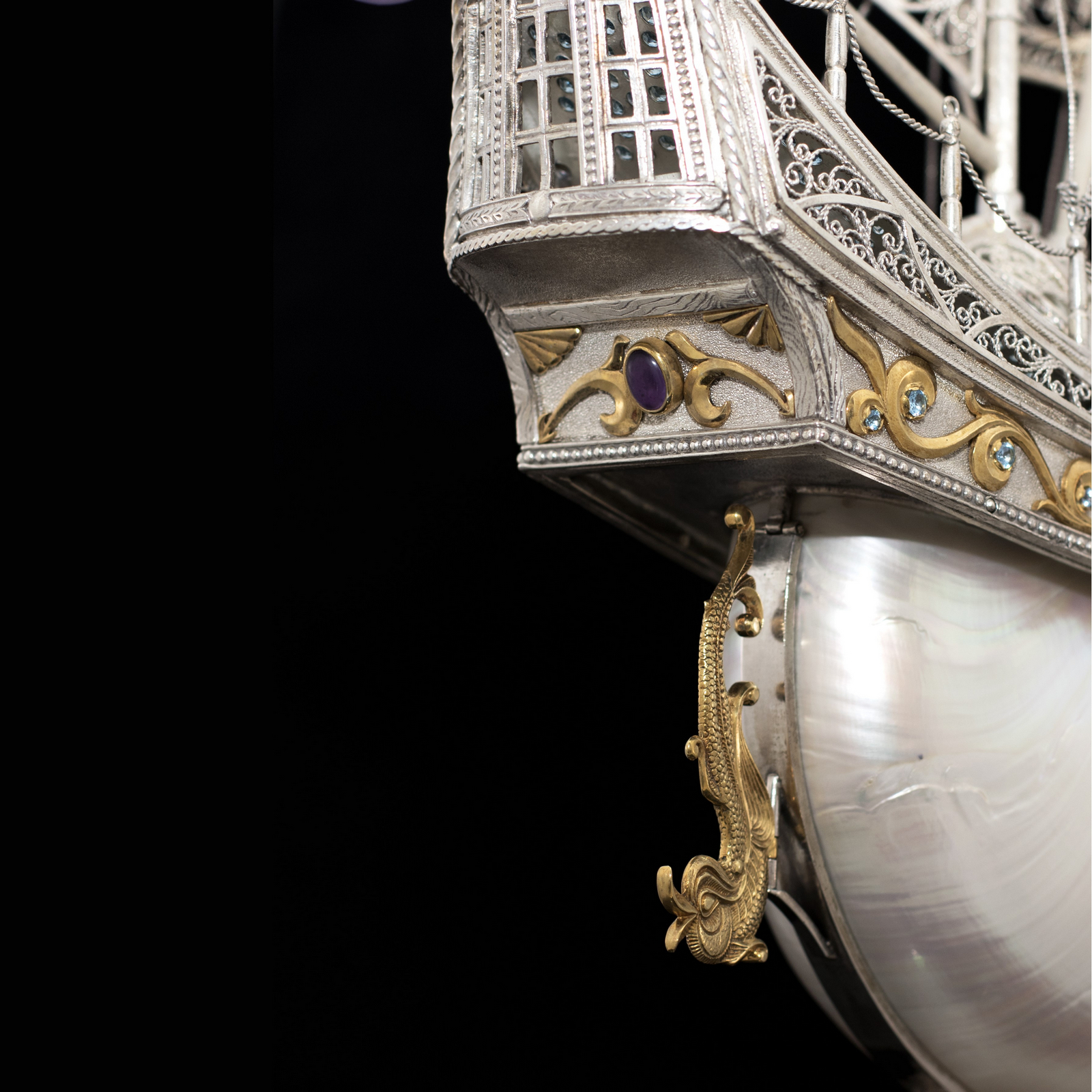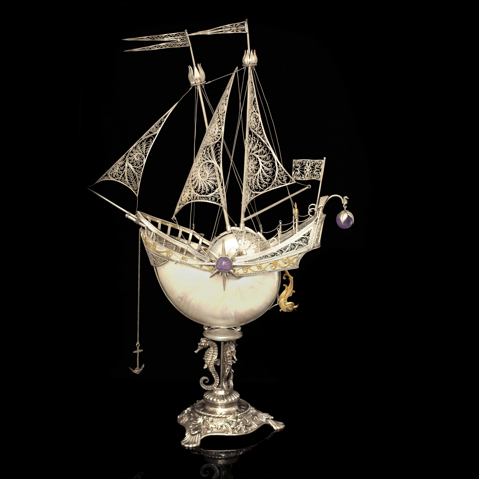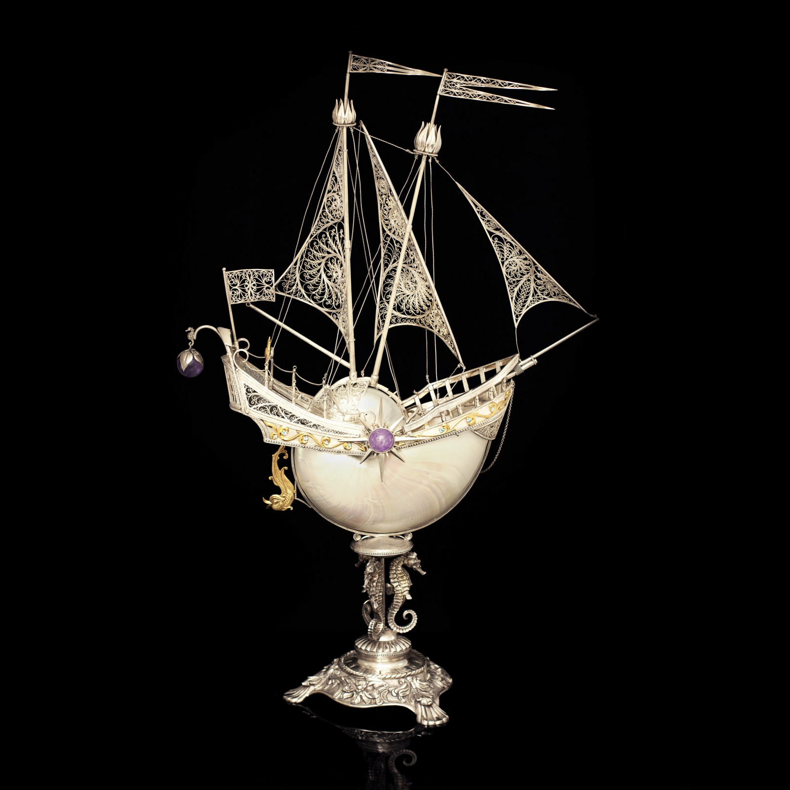 Серебряный корабль "Морская жемчужина" является вершиной ювелирного искусства, предлагая владельцу не только роскошный предмет декора, но и источник бесконечного вдохновения. Роскошь позолоты и богатство полудрагоценных камней в сочетании с серебром и раковиной Nautilus придают этому кораблю уникальное великолепие.
