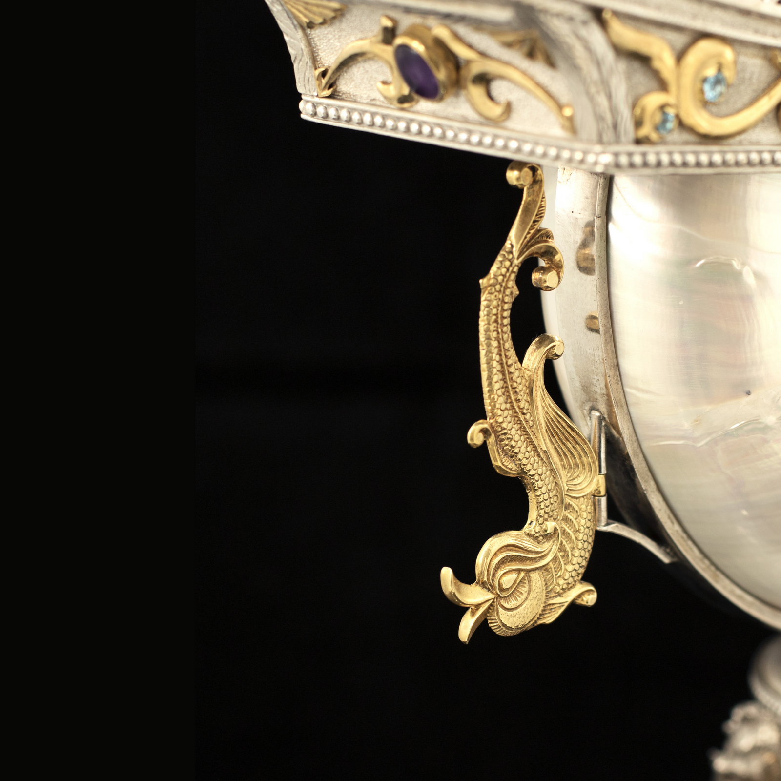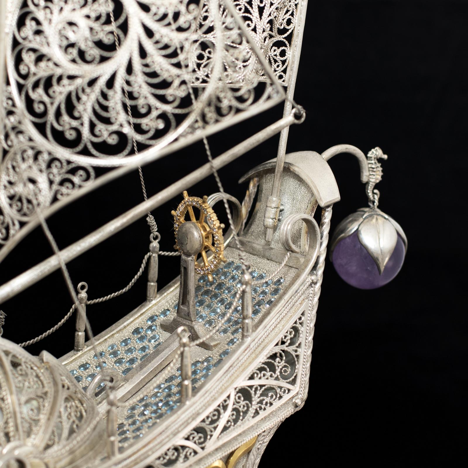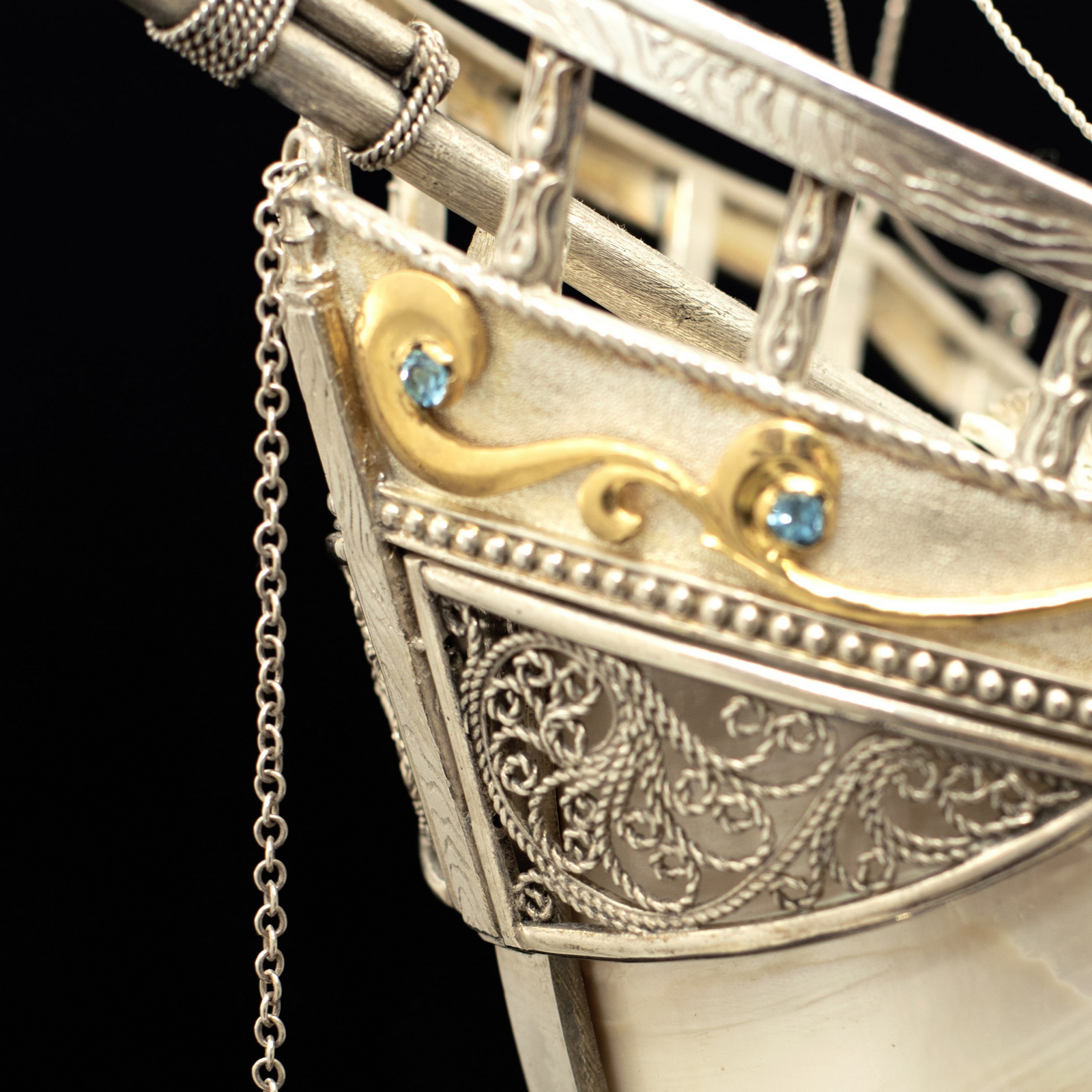 Серебряный корабль "Морская жемчужина" является вершиной ювелирного искусства, предлагая владельцу не только роскошный предмет декора, но и источник бесконечного вдохновения. Роскошь позолоты и богатство полудрагоценных камней в сочетании с серебром и раковиной Nautilus придают этому кораблю уникальное великолепие.
