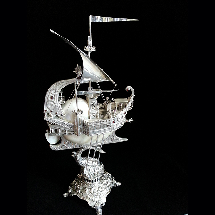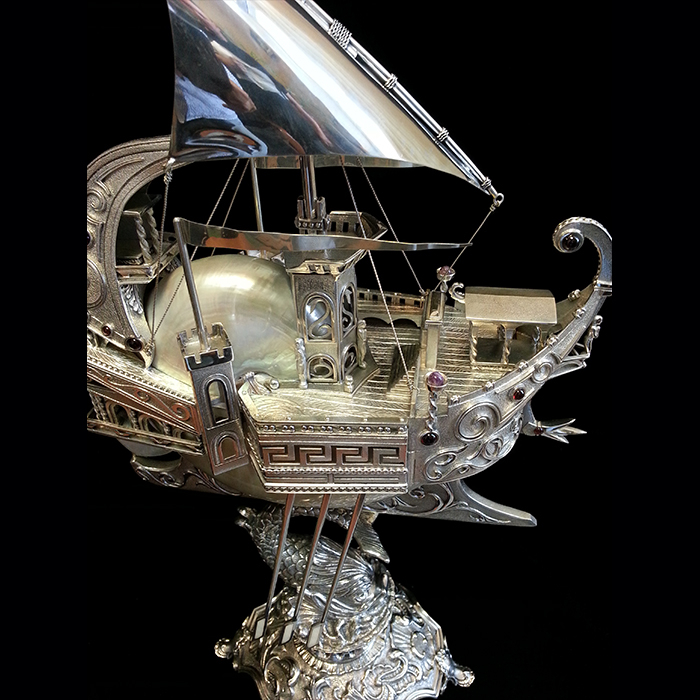 Форштевень изогнут горделивым завитком, а по бокам корпуса закреплены копья-рули, словно напоминающие о военной мощи античных флотилий. Мачта с натянутым серебряным парусом пронзает пространство, создавая ощущение стремительного движения. Подставка, украшенная скульптурной композицией, передаёт мотив морской стихии, символизируя мощь волн, несущих корабль к новым берегам. Детализация каждой линии, филигранная обработка серебра, искусное сочетание зеркальной и матированной поверхностей подчеркивают высокий уровень ювелирного мастерства.