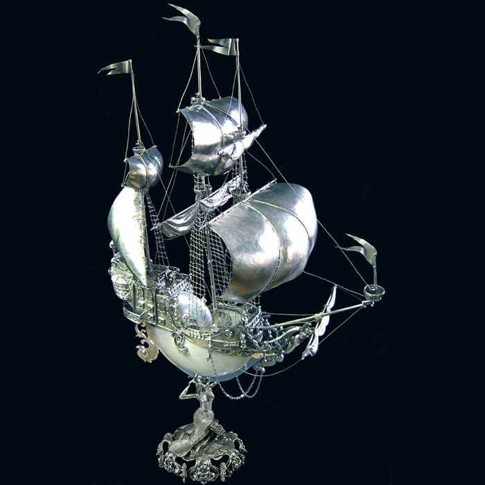 Палуба детализирована до мельчайших элементов: лестницы, поручни, канаты, крошечные мореплаватели, застывшие в мгновении работы. Форштевень венчает скульптурный элемент, исполненный в золотых оттенках, символизируя путь, освещённый светом Полярной звезды. Подставка, созданная в виде мифологического сюжета, соединяет корабль с морской стихией, поддерживая его на волнах серебряных завитков. Композиция подчёркнута контрастом матированных и полированных поверхностей, что придаёт кораблю глубину и выразительность.