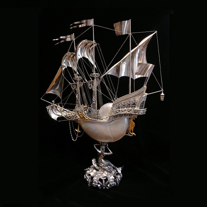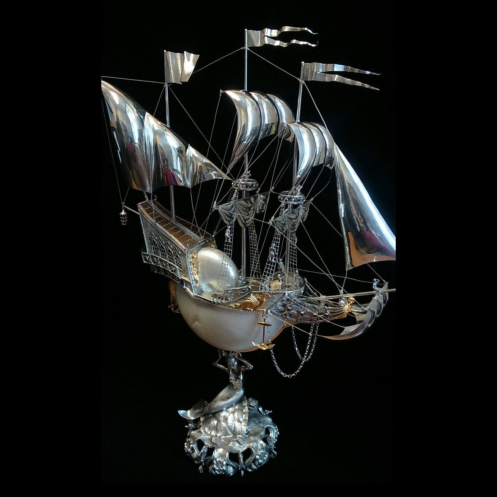Каждый элемент скульптуры несёт в себе отсылку к эпохе великих географических открытий, к кораблям, уходившим за линию горизонта, ведомым лишь звёздами и ветром. Серебряные мачты, словно тончайшие башни готического собора, поднимаются над палубой, украшенной кружевной решёткой и резными барельефами. В корме — миниатюрные каюты с крохотными окнами и декоративными балюстрадами. В основании композиции — фигура вспарывающего волны морского существа, на спине которого корабль уносится в вечный путь.