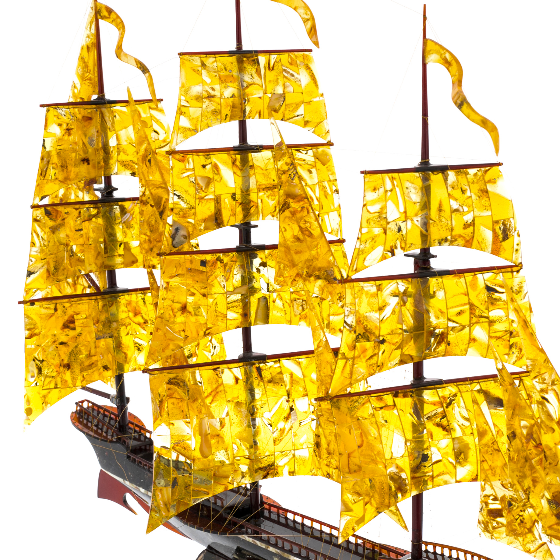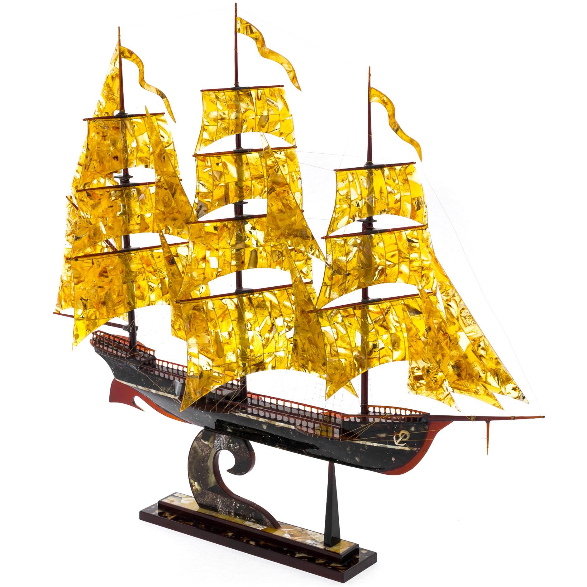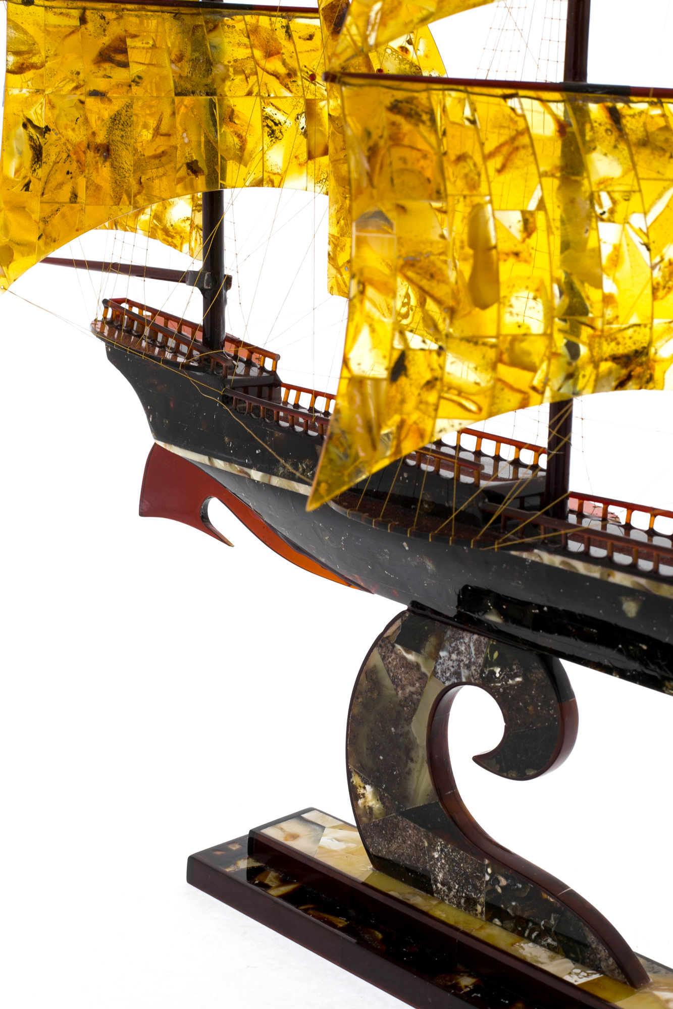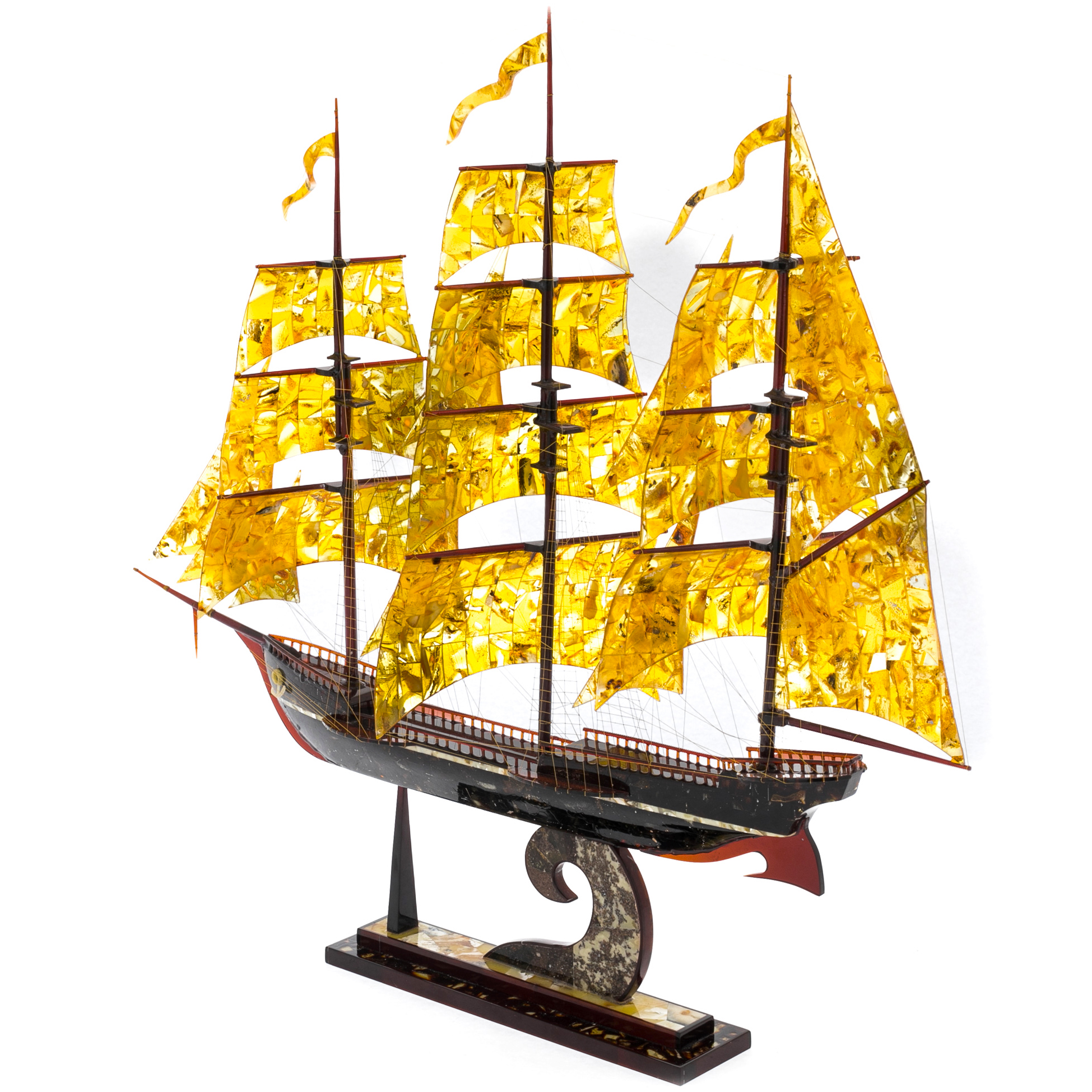 Корпус парусника выполнен из редчайшего тёмного янтаря, насыщенного глубокими переливами. Его изгибы повторяют линии настоящих парусных судов, храня в себе дух морских приключений и дерзких завоеваний. Изящная резьба по борту подчеркивает роскошь, в которой сочетаются изысканность и мощь. Этот корабль не просто дань истории — он её продолжение, её воплощение в янтарном совершенстве.