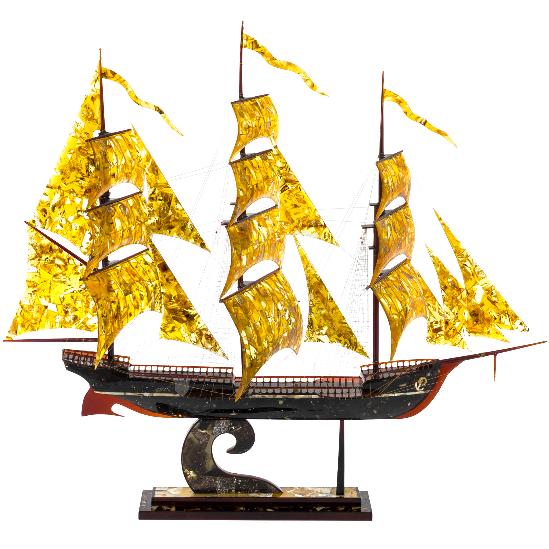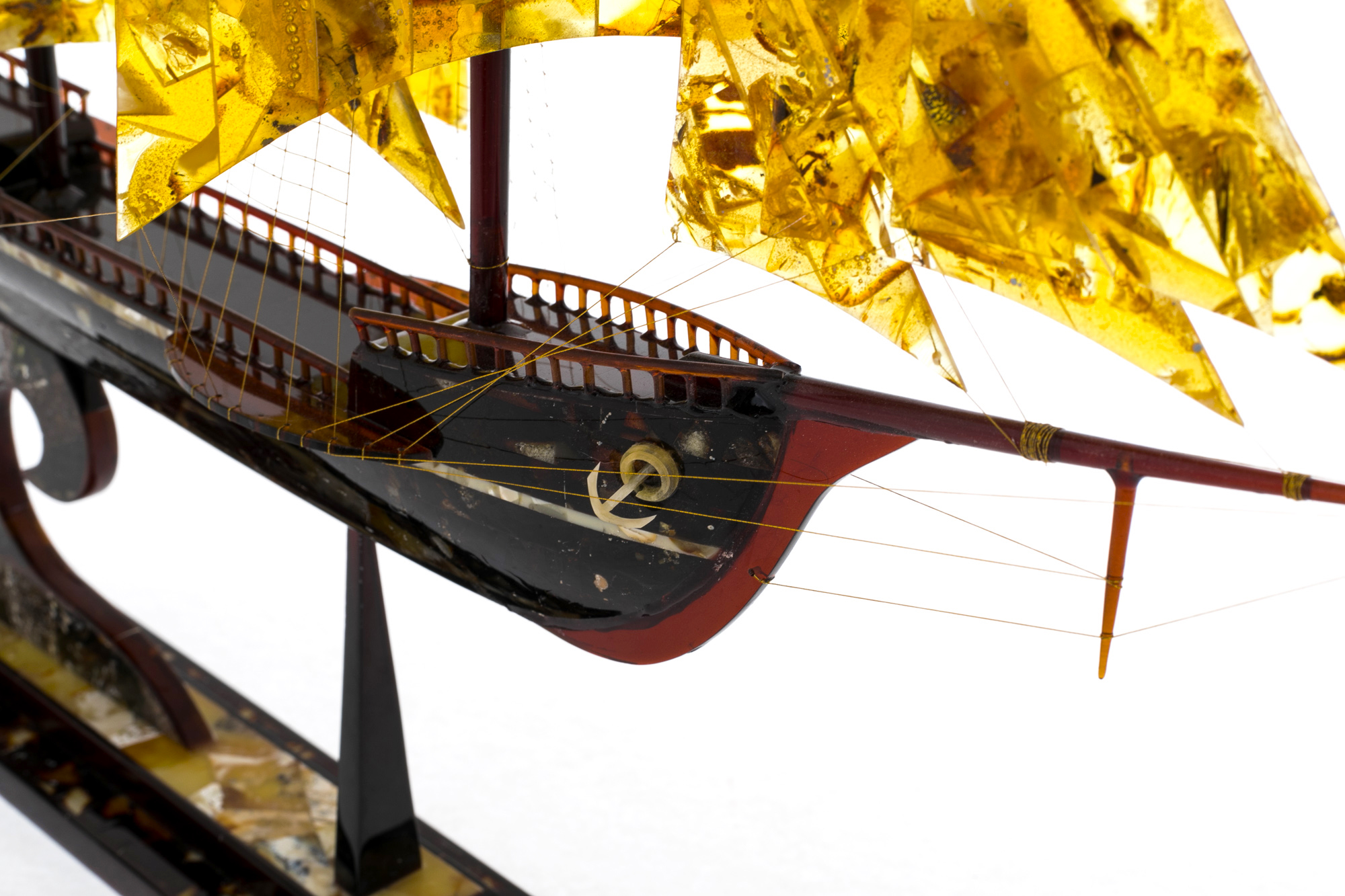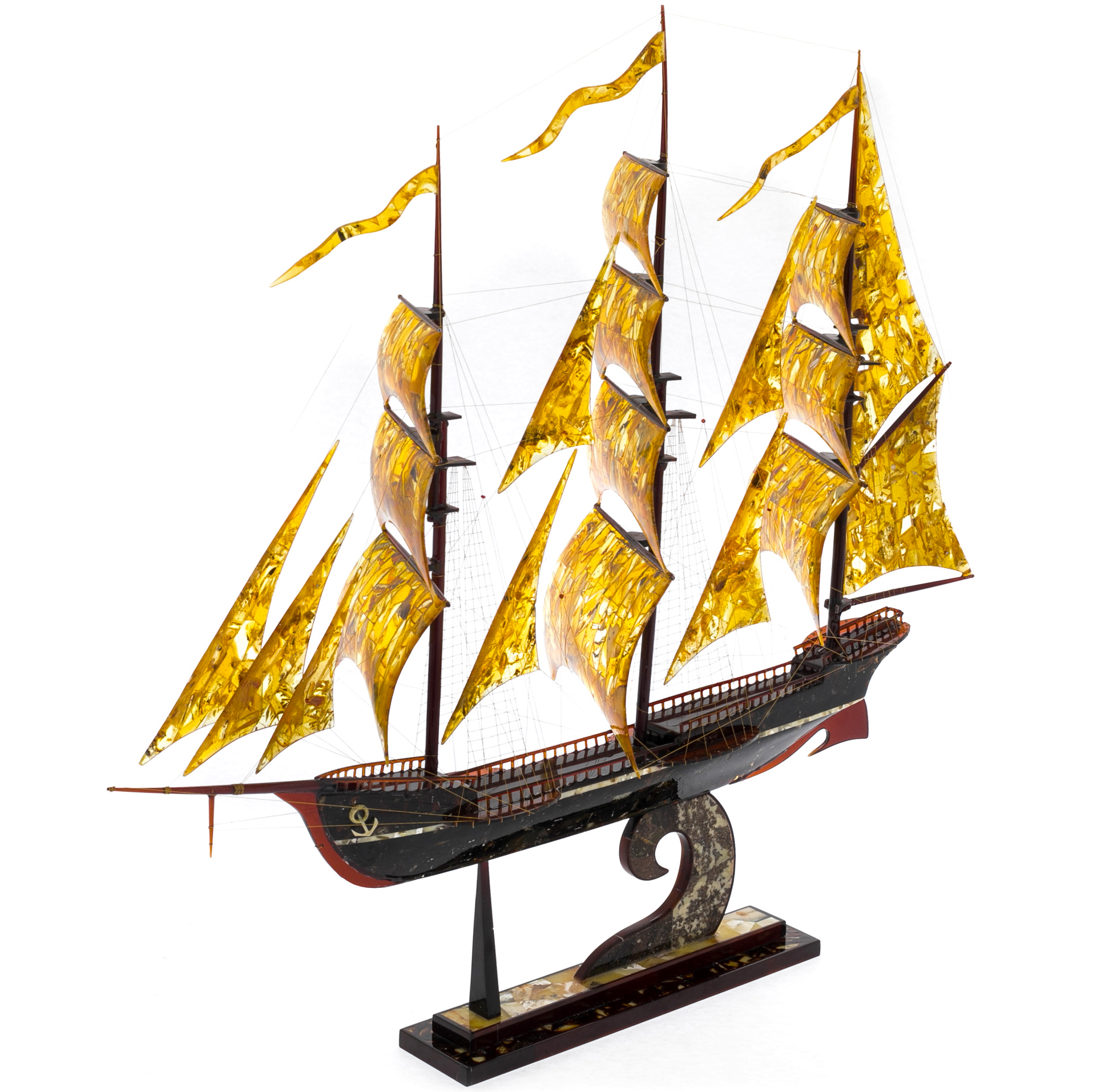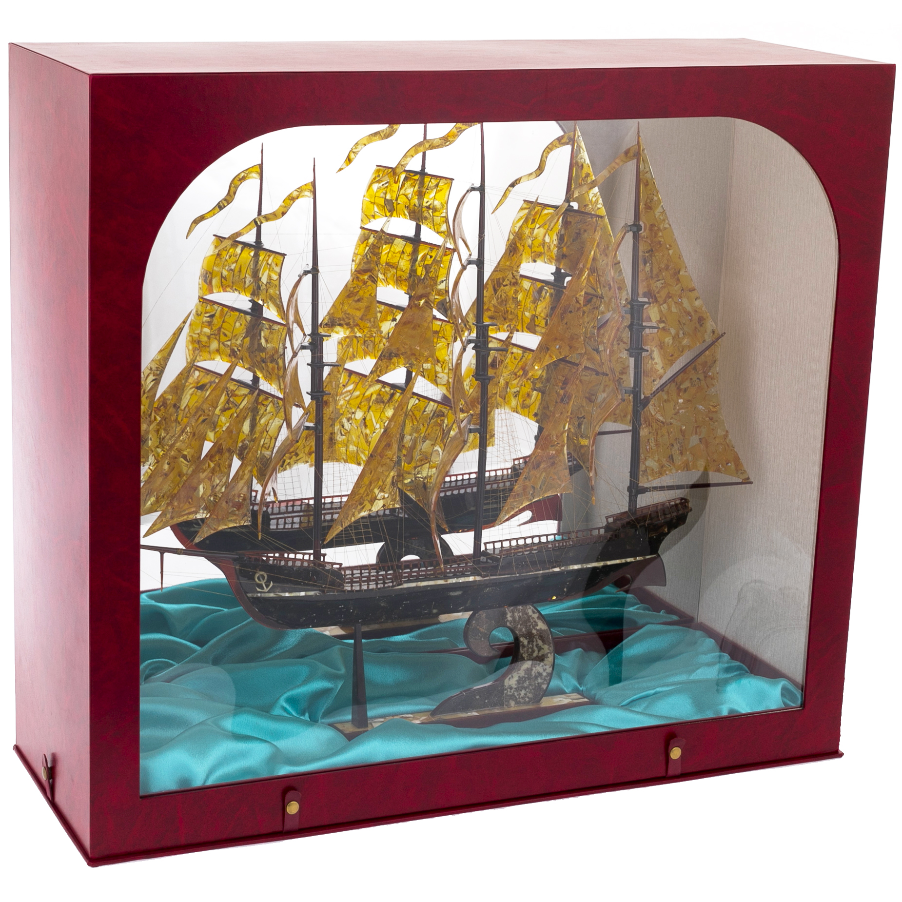 Корпус парусника выполнен из редчайшего тёмного янтаря, насыщенного глубокими переливами. Его изгибы повторяют линии настоящих парусных судов, храня в себе дух морских приключений и дерзких завоеваний. Изящная резьба по борту подчеркивает роскошь, в которой сочетаются изысканность и мощь. Этот корабль не просто дань истории — он её продолжение, её воплощение в янтарном совершенстве.