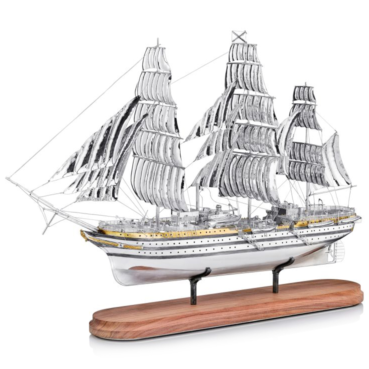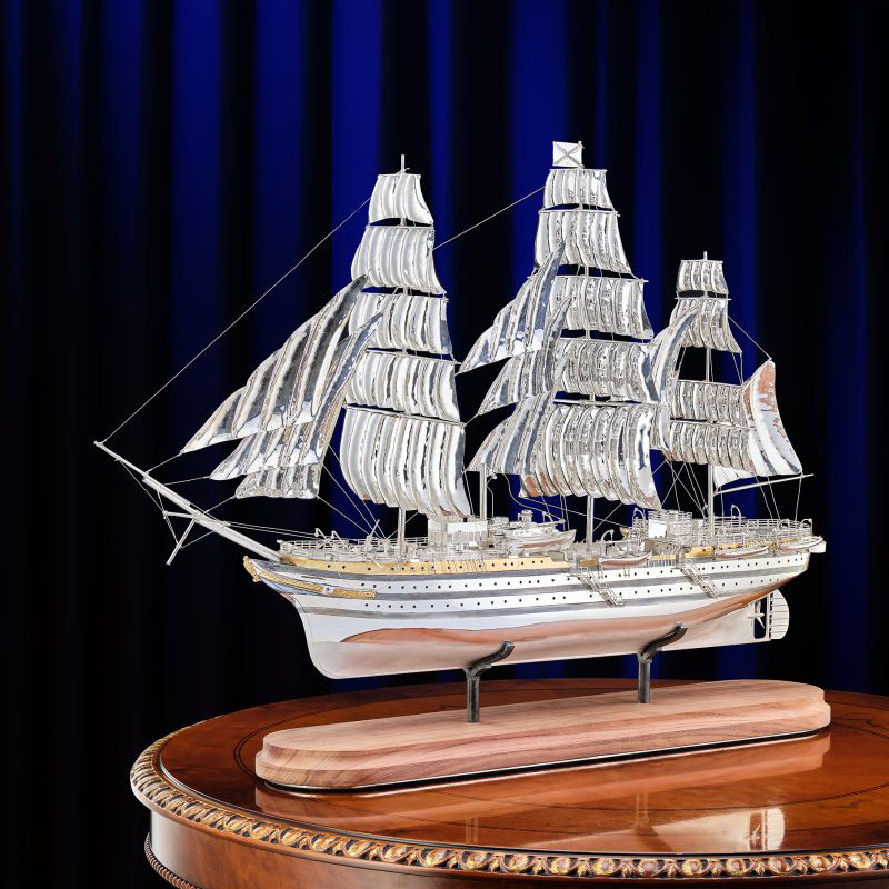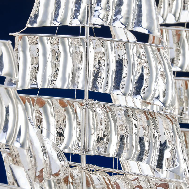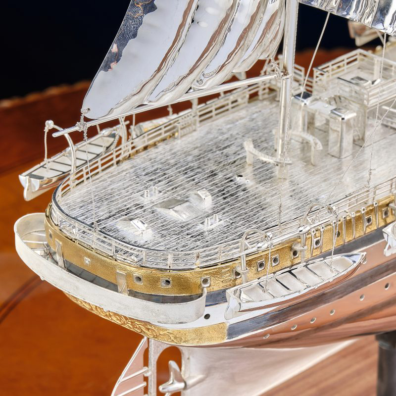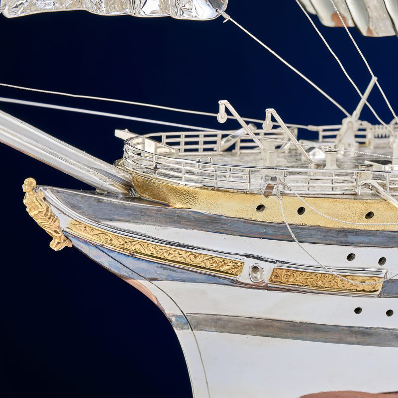 Паруса, рангоут и корпус выполнены из серебра 925 пробы, а элементы отделки подчёркнуты мягким сиянием позолоты. Каждый изгиб отточен с ювелирной точностью, а сложная система такелажа воссоздана вручную с поразительной достоверностью. Корабль установлен на массивной подставке из ценной породы дерева — лакированной и отполированной до зеркального блеска, что придаёт композиции завершённость и подчёркивает контраст между металлом и живой природной фактурой.