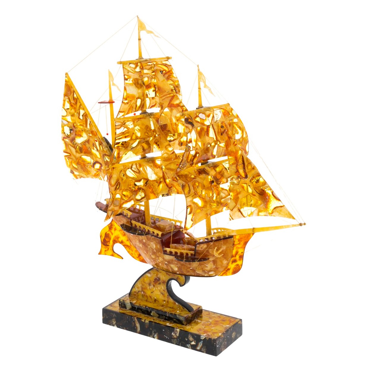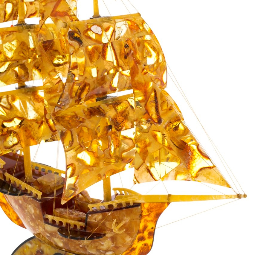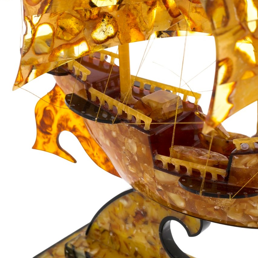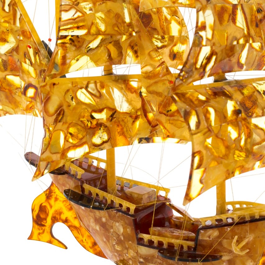 Каждая деталь изделия соткана из янтарных оттенков, играющих на свету золотистыми бликами. Паруса, будто наполненные ветром приключений, излучают теплую энергетику древнего смолистого минерала, связывая время и пространство. Тонкие линии вантов напоминают о хрупкости равновесия и одновременно о прочности воли — именно такие качества отличают истинного лидера.