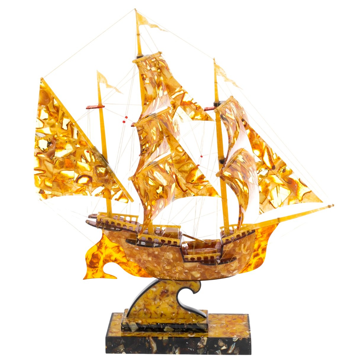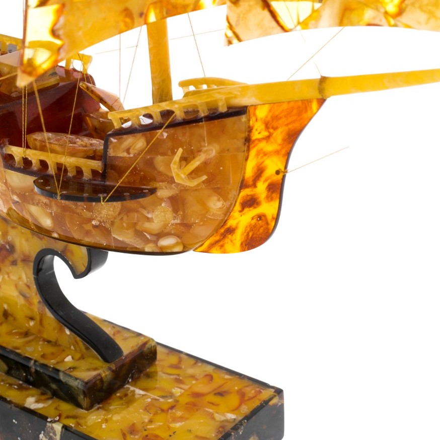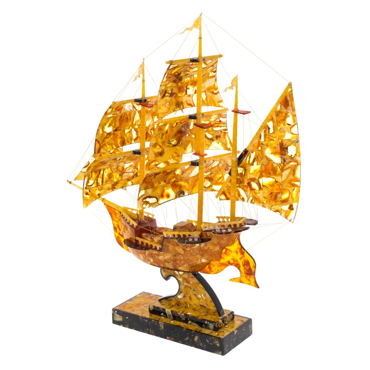 Каждая деталь изделия соткана из янтарных оттенков, играющих на свету золотистыми бликами. Паруса, будто наполненные ветром приключений, излучают теплую энергетику древнего смолистого минерала, связывая время и пространство. Тонкие линии вантов напоминают о хрупкости равновесия и одновременно о прочности воли — именно такие качества отличают истинного лидера.