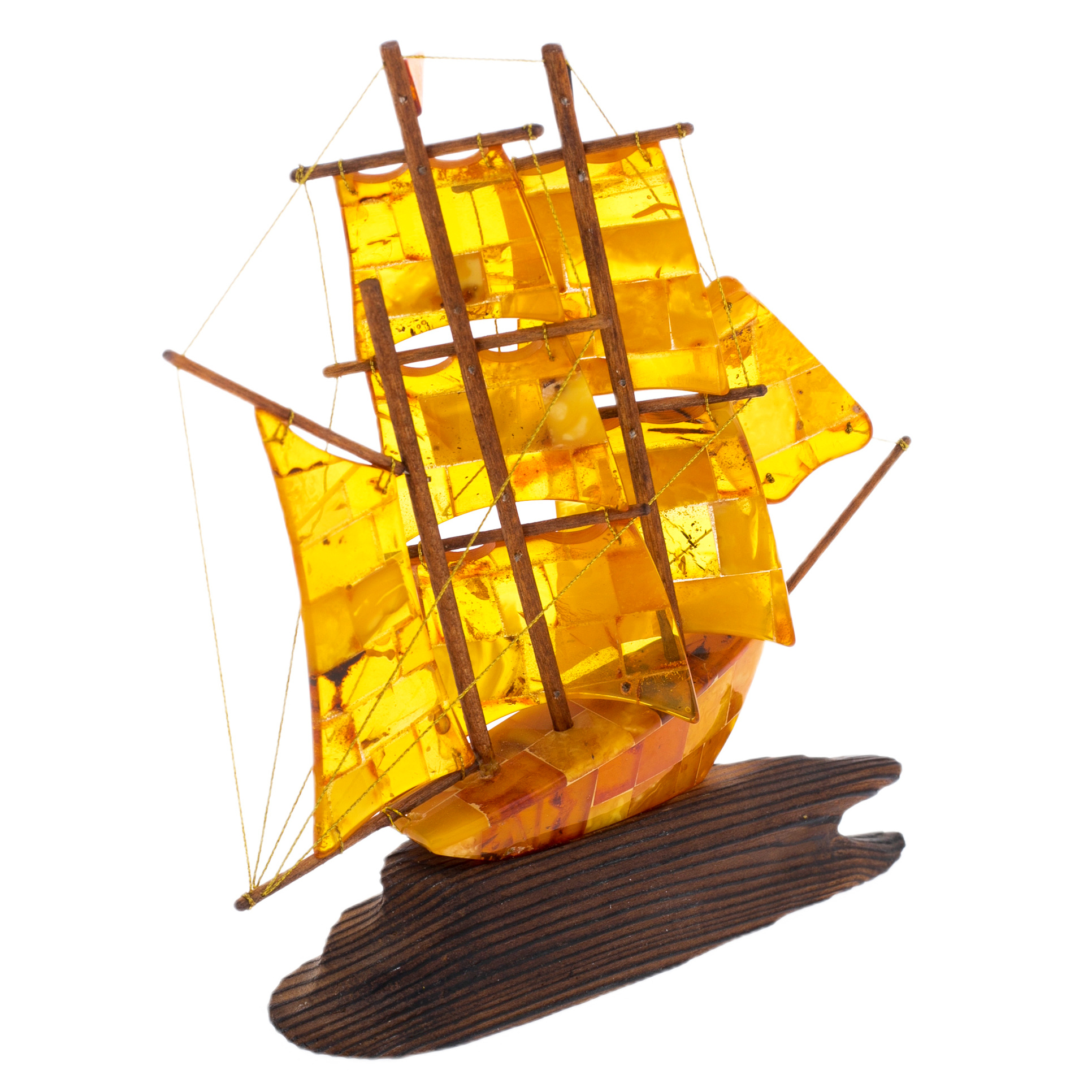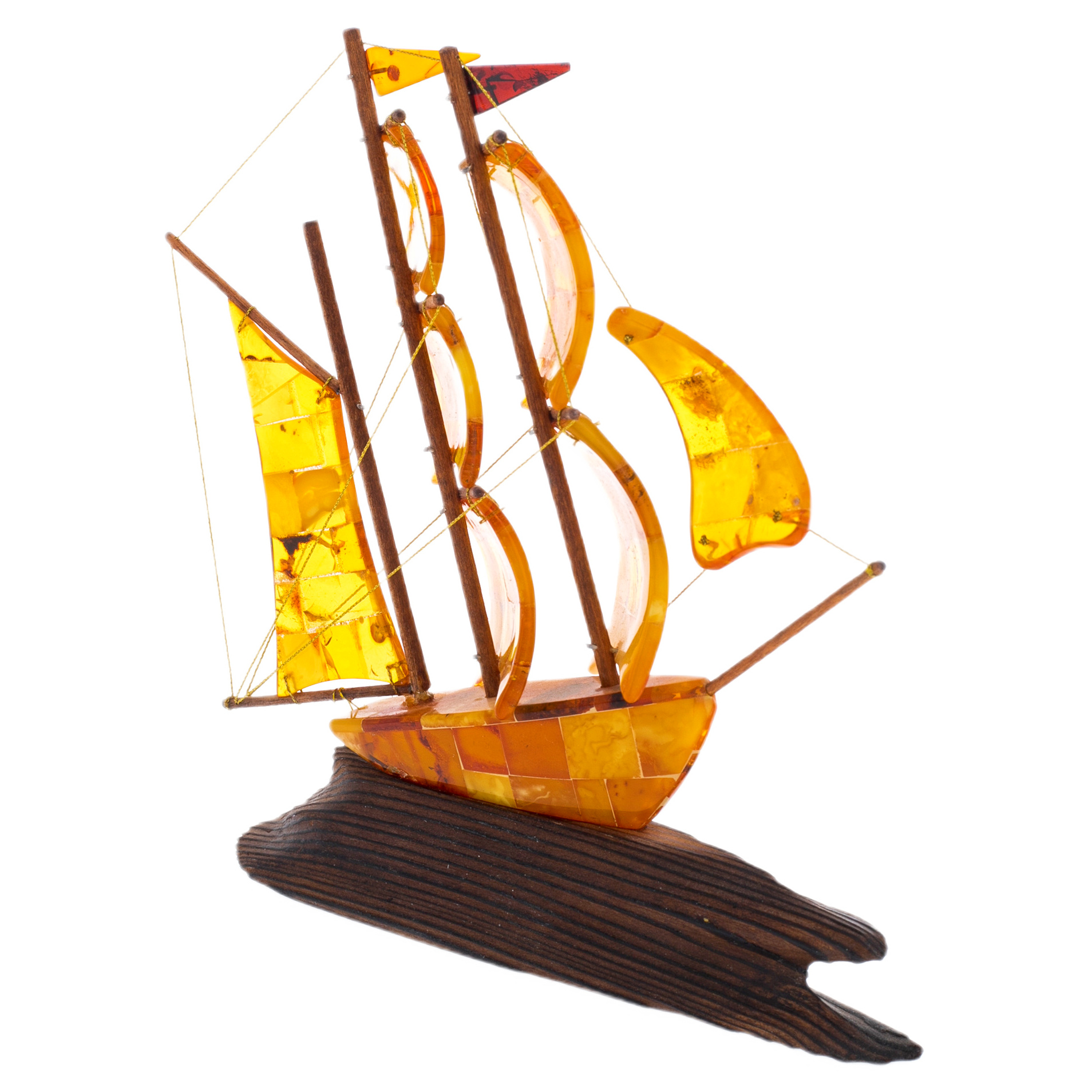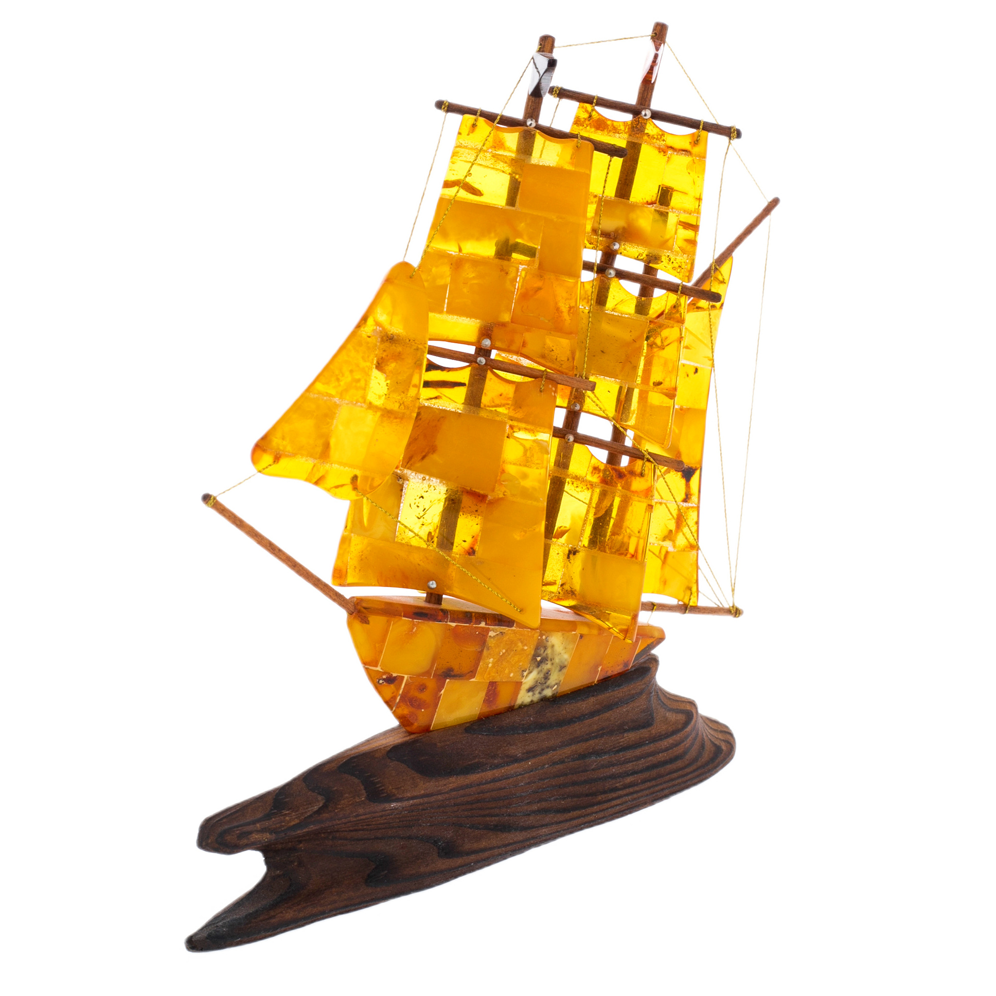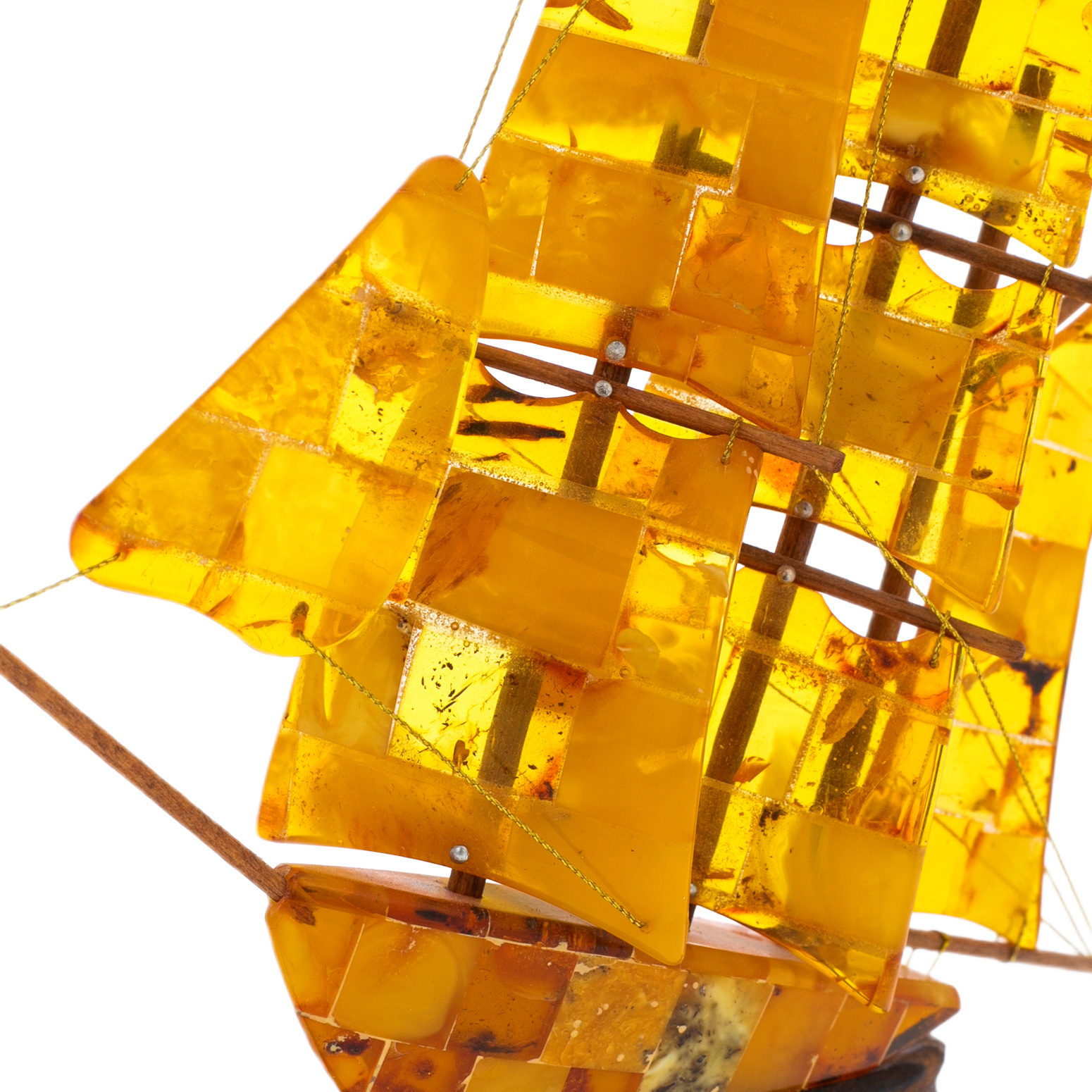 Использование янтаря придаёт этому сувениру особую глубину. Каждый фрагмент корабля выполнен из природного камня возрастом миллионы лет, сформированного из окаменевшей смолы древних хвойных лесов. Янтарь наделён магнетизмом и теплом, храня в себе солнечную энергию прошлого. Он издревле считался символом удачи в морских путешествиях и мощным оберегом, особенно в формах, связанных с движением, дорогой, ветром. Его прозрачные и полупрозрачные участки, насыщенные оттенками от меда до коньяка, создают многослойный эффект — как будто корпус судна и паруса дышат светом.