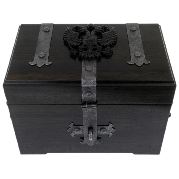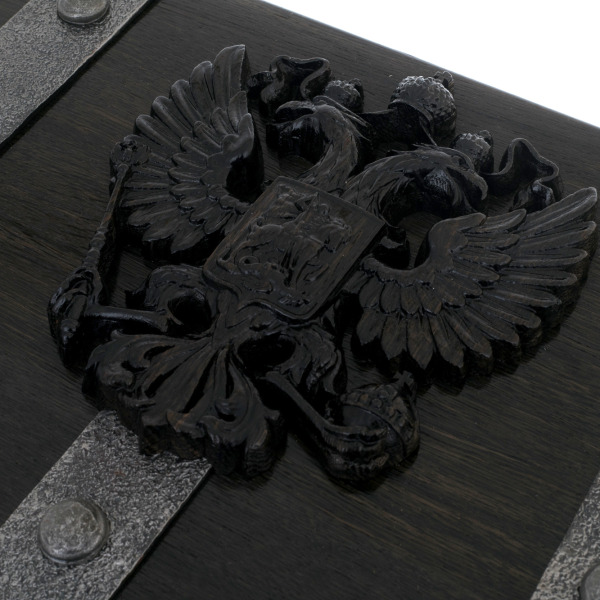С легкостью, достойной королевской канцелярии, двуглавый орёл с распростёртыми крыльями венчает крышку, напоминая о славе и государственности. Выполненный в лучших традициях декоративного искусства, он хранит в себе символ российской державности, как будто стоит на страже тайн прошлого и устремляет взгляд в будущее.
