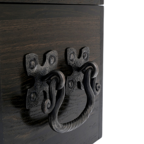 Тяжёлые, массивные ручки по бокам кажутся древними цепями, будто бы из глубин старинных легенд, переплетены и соединены так, чтобы только рука достойного смогла коснуться этого загадочного сундука. Патинированный металл подчеркивает благородство и основательность каждого элемента, создавая впечатление, что сундук прошёл через века, сохранив в себе вечное — власть, силу и традиции.
