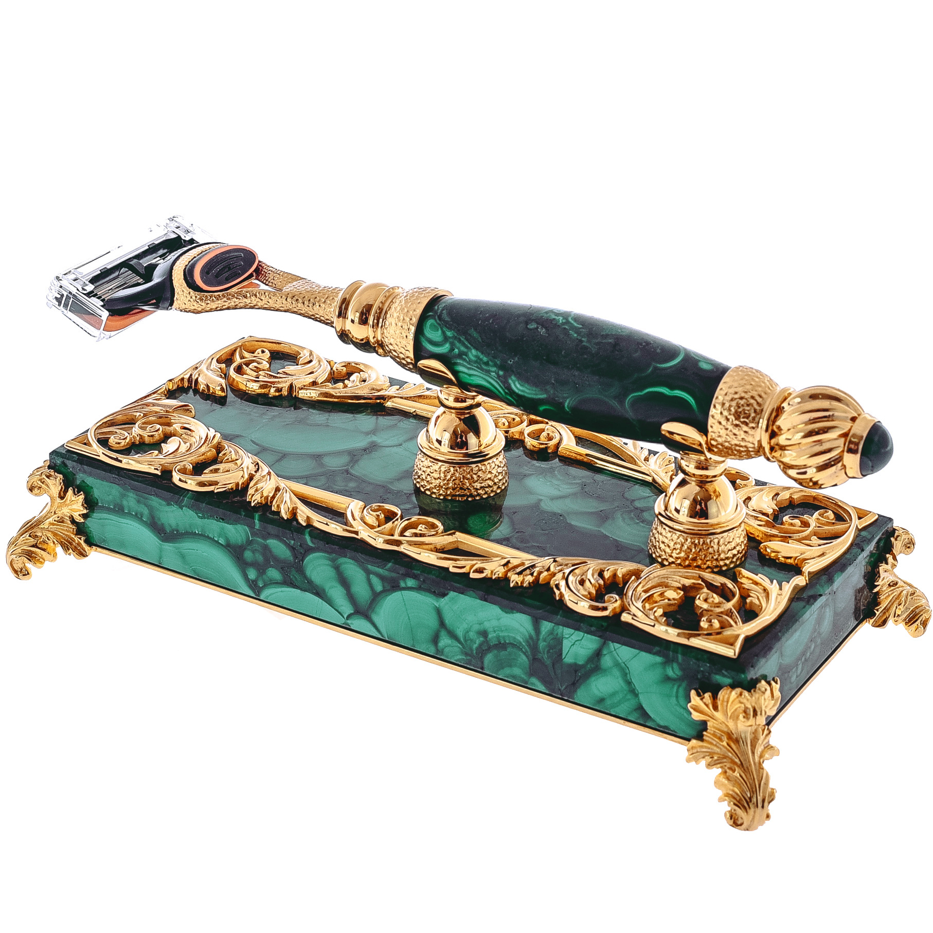 Подставка и станок выполнены из натурального малахита, насыщенно-изумрудного камня с уникальным рисунком на срезе. Все работы мастера Златоуста производят только вручную. Камень режут, полируют, придавая нужную форму, а затем украшают латунными вставками с золочением. Только посмотрите, как филигранно нанесён рисунок! Причудливые узоры сначала отрисованы от руки, а затем выгравированы. На финальном этапе золотой декор подвергся травлению, чтобы закрепить результат и сделать его живым и объёмным. Станок размещается на специальных креплениях, чтобы с лезвий стекала влага. Кассету можно приобрести в любом магазине, как только затупятся старые лезвия.