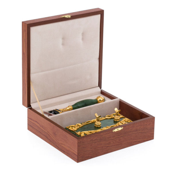 Златоустовская техника здесь проявилась в своём классическом блеске — это не просто декор, а живой диалог с ремесленной традицией. Обрамления подставки, отлитые вручную и вручную же шлифованные, покрыты позолотой, в которой сдержанно сияют мягкие отблески света. Каждый завиток орнамента — след ювелирной работы, превращающей функциональный предмет в декоративный артефакт. Эстетика златоустовской гравюры на металле органично сочетается с плотной текстурой природного нефрита, подчёркивая природную энергию камня и утонченную роскошь металлодекора.