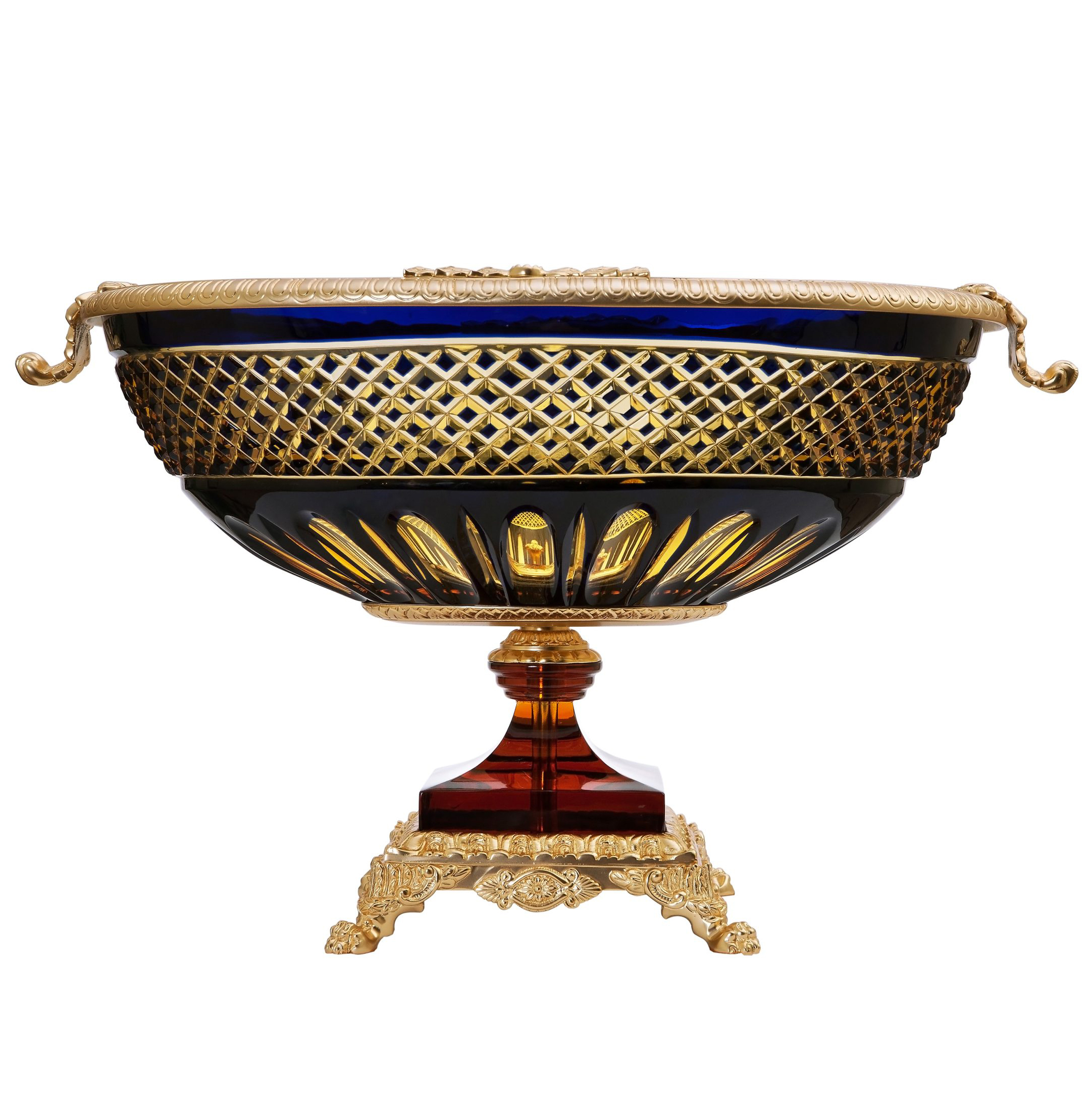 Янтарно-синий хрусталь переливается, словно отражение заката в водах великой реки, на чьих берегах строились империи. Его глубокая огранка в технике «грильяж» создает игру света, подобную танцу пламени в камине дворцового зала. Позолоченные бронзовые детали, обрамляющие ладью, словно ленты триумфального венка, заключают в себе незыблемость традиций и блеск былых эпох.