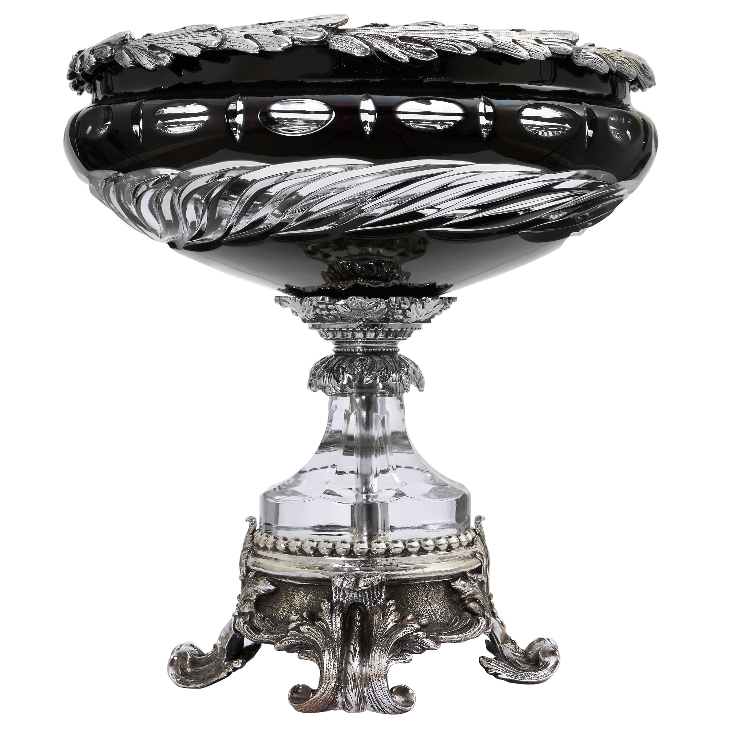 Глубокий, как ночное небо, черный хрусталь с его таинственными переливами рождает образ величественного, словно сотканного из теней и бликов предмета, достойного украшать королевские залы. Изысканная ручная огранка создает игру света, пробегающего по граням чаши, словно мерцающие звезды на бархатном полотне ночи.