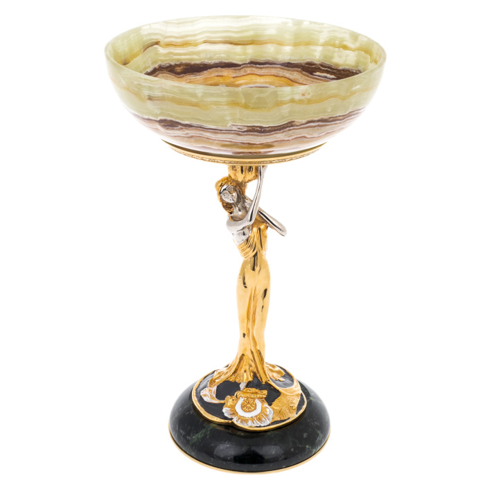 Чаша, выполненная из полупрозрачного оникса, излучает внутреннее свечение. Природные слои камня, от молочно-зелёного до янтарного, образуют нежные волны — символ жизненной энергии и гармонии. В центре чаши — золотой медальон с златоустовским гравированным орнаментом, выполненным в лучших традициях уральского искусства. Он добавляет композиции торжественности и изысканного блеска.