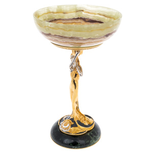 Ваза из оникса «Грация» — это ода женственности, воплощённая в камне и металле. Её основа — тончайшая скульптура женщины, словно вышедшей из мифов античности. Её силуэт излучает мягкость и уверенность, а плавные линии фигуры превращают холодный металл в живую форму. Позолота придает статуе глубину света, а в её лице читается спокойствие и достоинство — грация, ставшая движением, застывшим во времени.