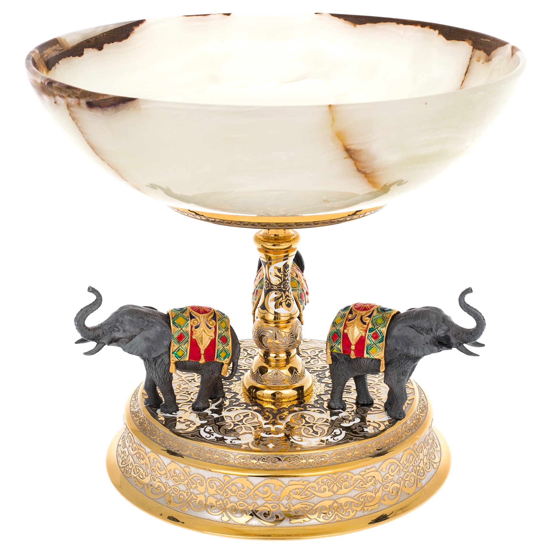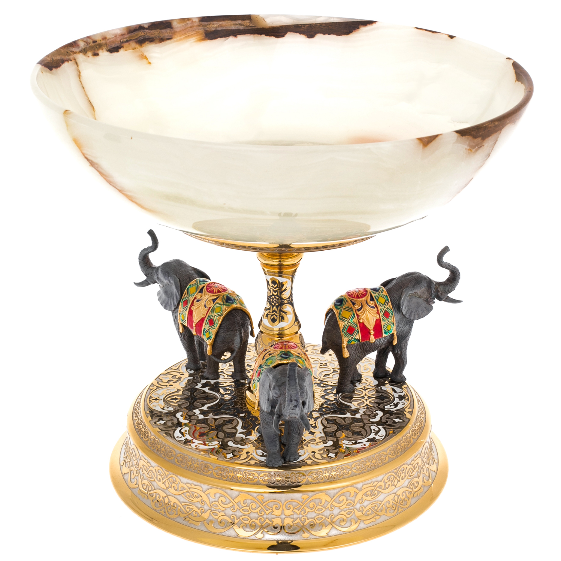 Как будто вознесённая на спинах мудрых и благородных животных, чаша из полупрозрачного оникса словно парит в воздухе. На её опоре — изящная композиция из трех слонов, шаг за шагом несущих спокойствие, благополучие и процветание. Их фигуры отлиты с филигранной точностью и украшены пышными, яркими попонами с эмалевыми вставками, подобно королевскому эскорту на торжественном шествии.