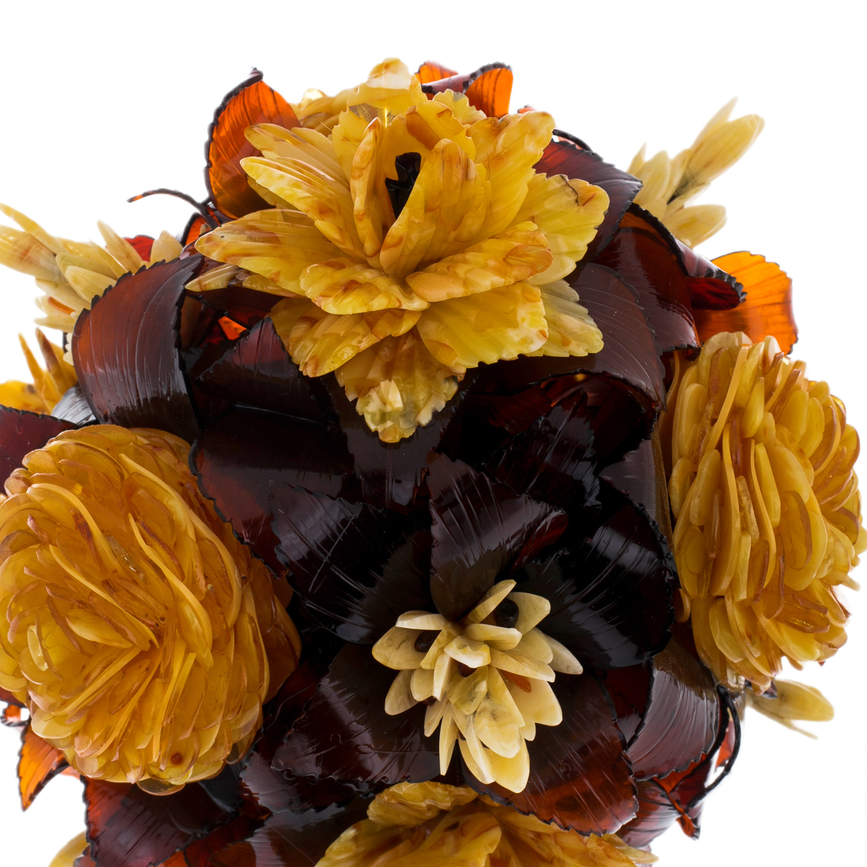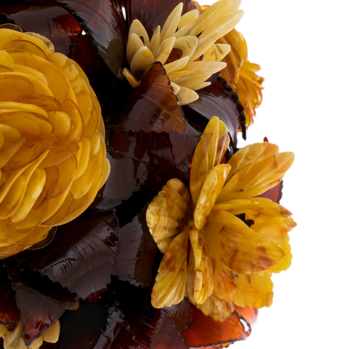 Лепестки, выполненные из различных оттенков янтаря, сливаются в гармоничную палитру золотых и медовых тонов, напоминая о роскоши природы, неподвластной времени. Розы, созданные руками мастеров, словно оживают, окружая пространство благородным теплом. Их текстура и переливы света подчёркивают органичность материала, связывая прошлое, настоящее и будущее.