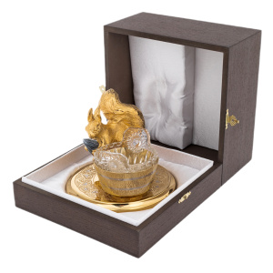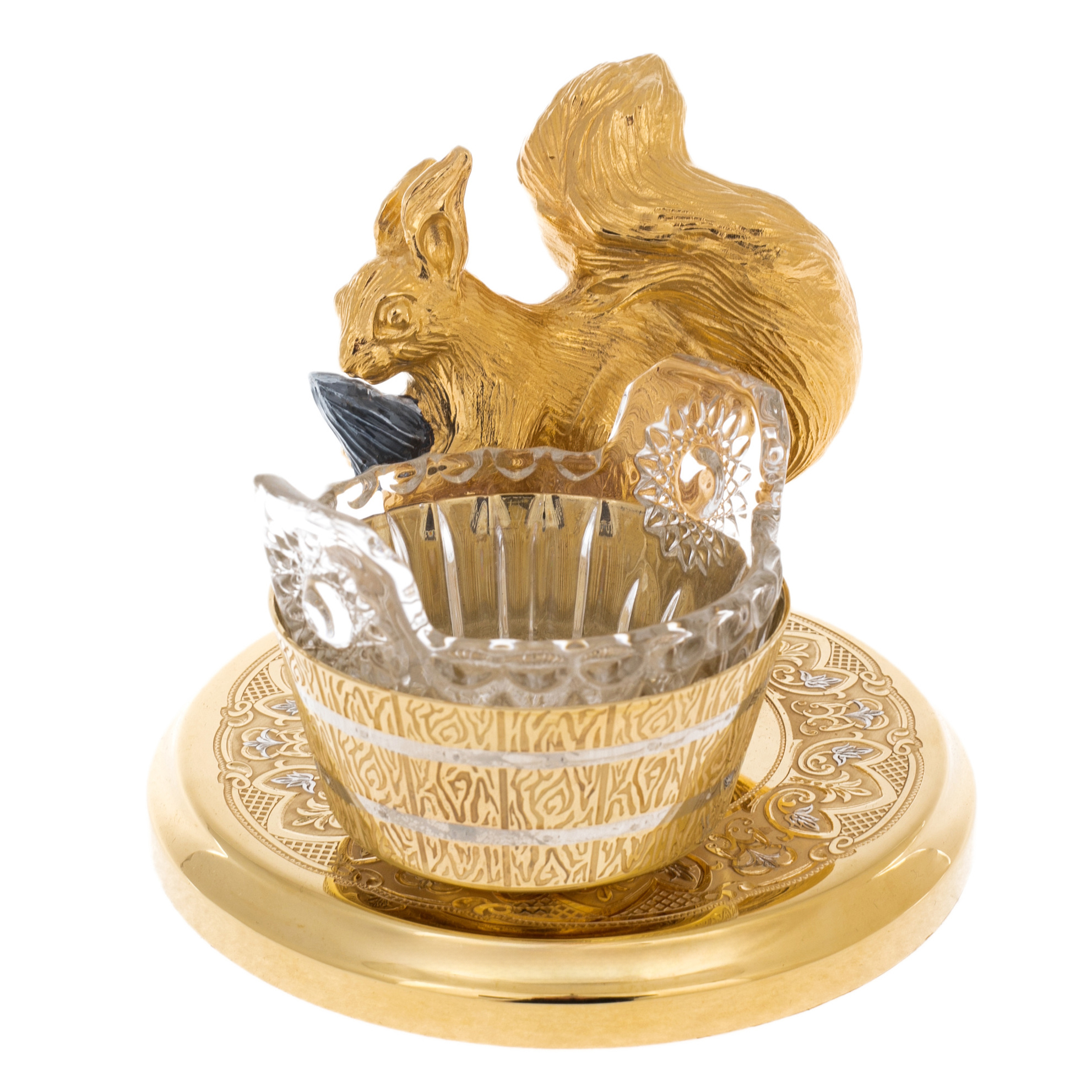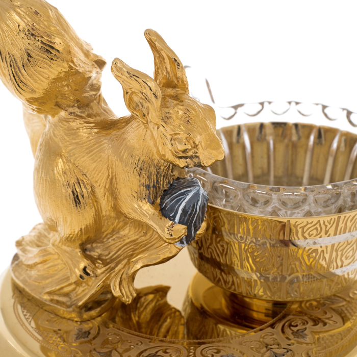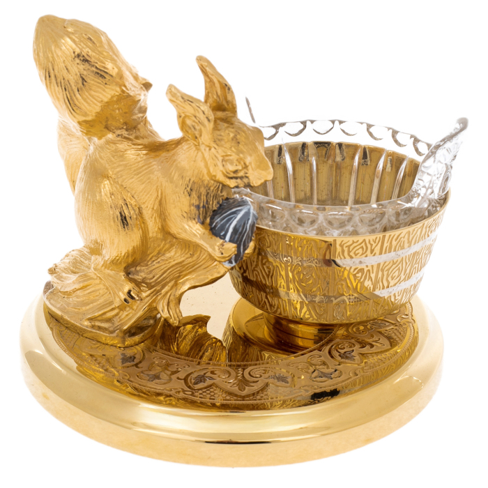 Изделие выполнено из латуни с позолотой и никелевым покрытием. В центре композиции — фигурка белки, державшей в лапках орешек из тёмного камня, будто только что найденный в густом лесу. Хрустальная чаша напоминает миниатюрное ведёрко, а основание украшено тончайшим орнаментом ручной работы — примером филигранной точности мастеров Златоуста.