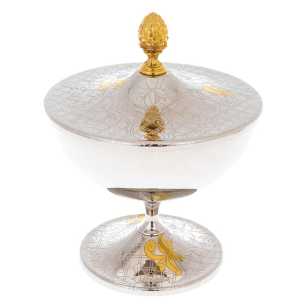 Эта ваза для конфет — настоящее сокровище, которое станет украшением любого интерьера. Блестящее никелевое покрытие, золотые вставки, а также позолоченный артишок в виде ручки на крышке придают вазе современное очарование и элегантность, при этом аккуратно подчеркивая ее роскошь и статус хозяев дома.