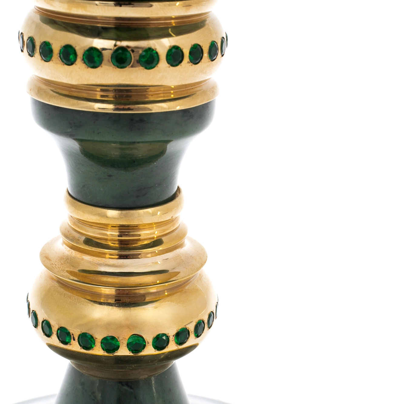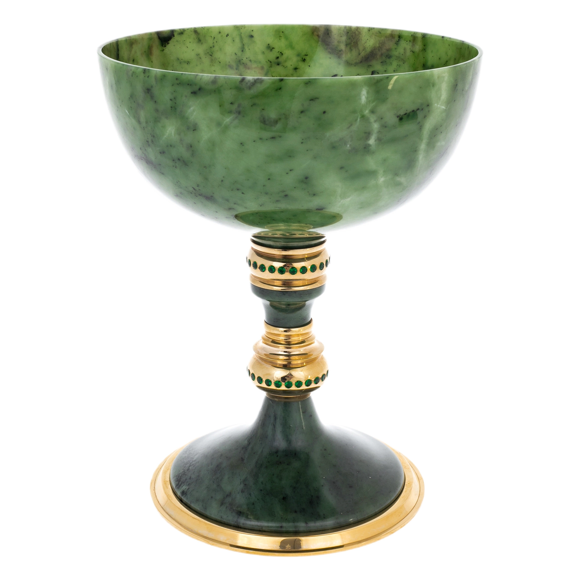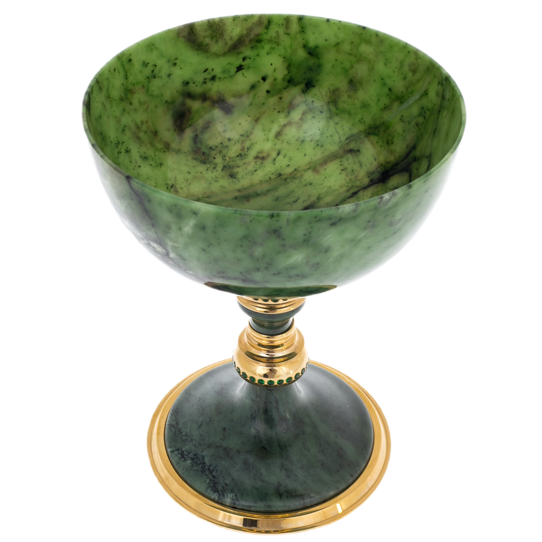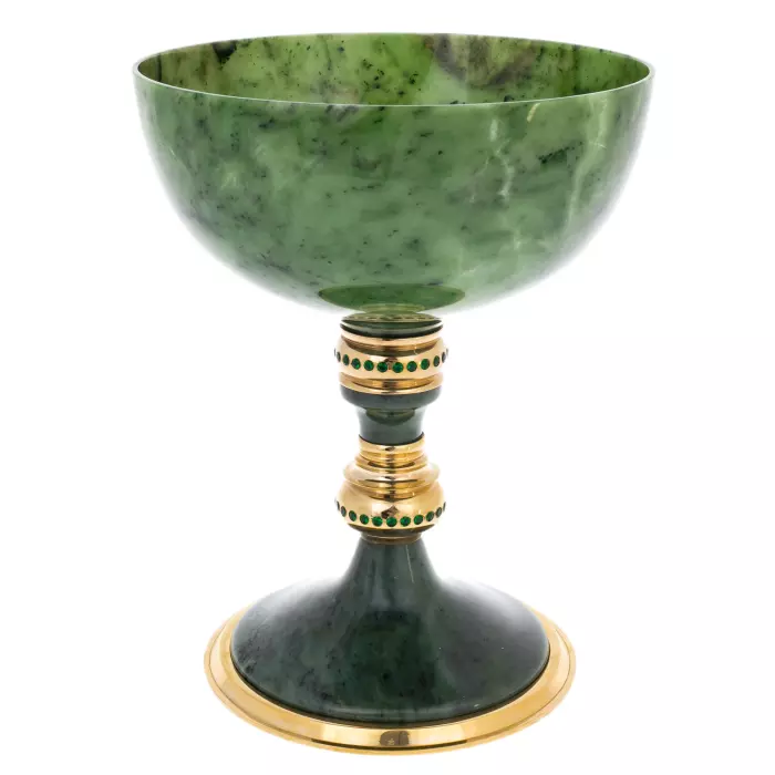Нефрит, традиционно ассоциирующийся с прочностью, мудростью и устойчивостью, придаёт изделию ощущение монументальности. Полированная поверхность камня мягко отражает свет, раскрывая природную структуру минерала. Металлический декор выполнен в технике златоустовской гравюры: орнаментальные пояса, аккуратные растительные мотивы и тщательно проработанные детали создают выразительный контраст с гладью камня. Золочение усиливает торжественный характер формы и подчёркивает царственное звучание названия.