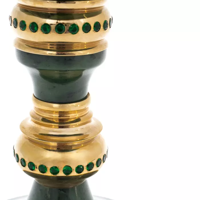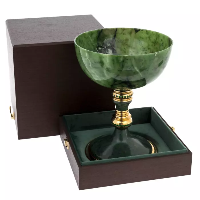 Ваза из нефрита «Царская», созданная мастерами Златоуста, представляет собой статусный интерьерный предмет, сочетающий природную силу камня и выразительность художественного металла. Корпус выполнен из цельного нефрита благородного зелёного оттенка с естественной глубиной рисунка, дополнен декоративными элементами с золочением и тонкой гравировкой. Композиция рассчитана на парадное размещение — в представительском кабинете, просторной гостиной или зале для приёмов.