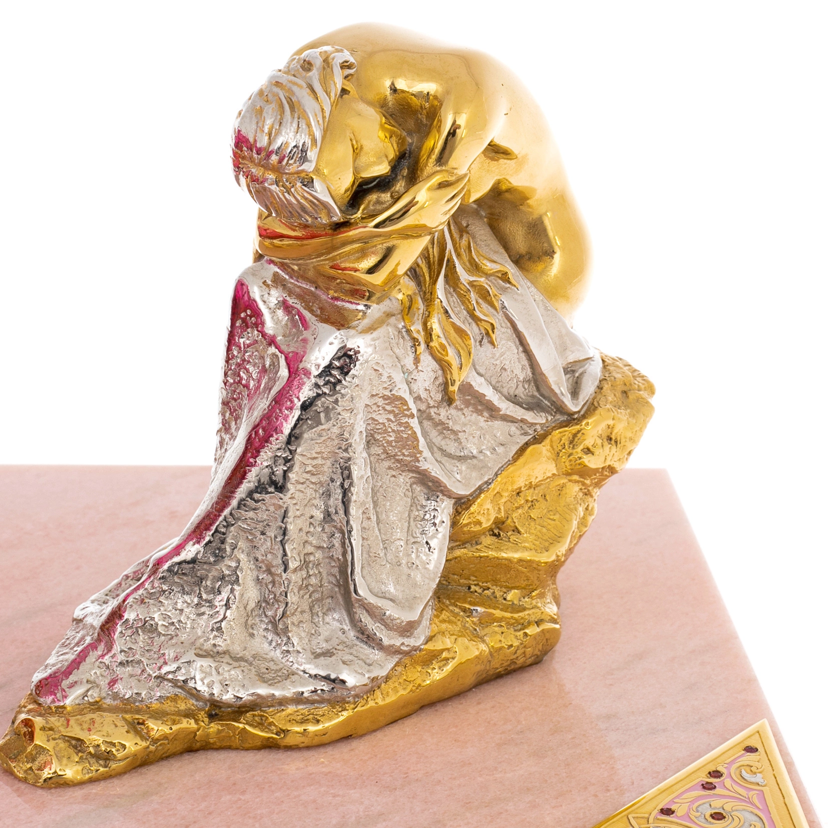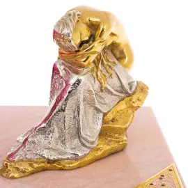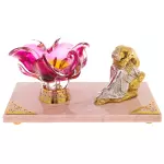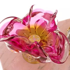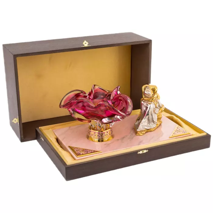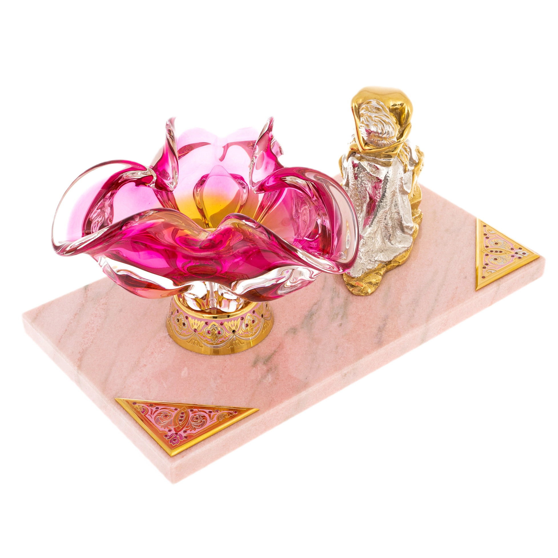 Ваза на мраморной подставке «Вазочка и девушка» — изящная декоративная композиция, сочетающая художественное стекло и златоустовскую металлопластику. В центре внимания — яркая стеклянная чаша сложной лепестковой формы, выполненная в насыщенных розово-малиновых оттенках с плавными переходами цвета. Рядом расположена миниатюрная фигура девушки в драпировке, трактованная как аллегория созерцания и вдохновения. Основанием служит прямоугольная мраморная плита нежного розового тона, придающая композиции цельность и устойчивость.
