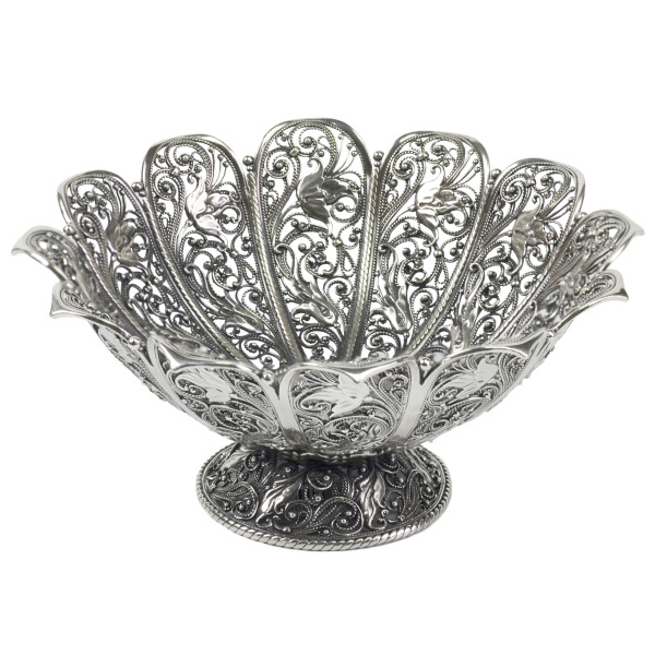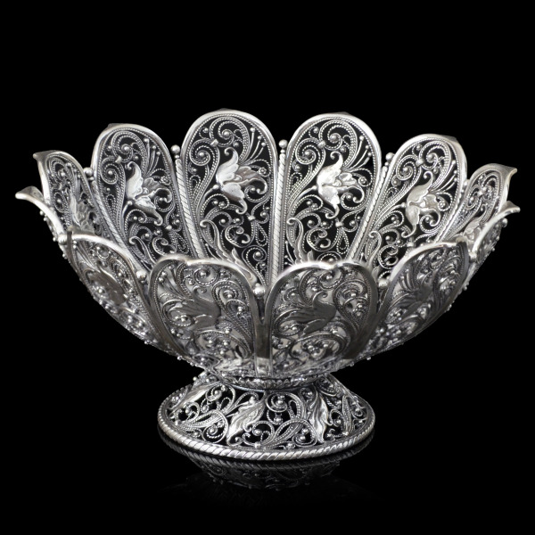 Серебряная конфетница «Вдохновение» — изысканный предмет сервировки и одновременно самостоятельный арт-объект, созданный из серебра 925 пробы. Ажурная чаша с лепестковой пластикой словно раскрывается навстречу свету, формируя выразительный силуэт, уравновешенный изящной ножкой. Предмет рассчитан на интерьер, где ценят подлинные материалы, ручную работу и тихую, ненавязчивую роскошь. Конфетница органично впишется как в классическую столовую, так и в кабинет или гостиную, выступая акцентом, притягивающим взгляд.