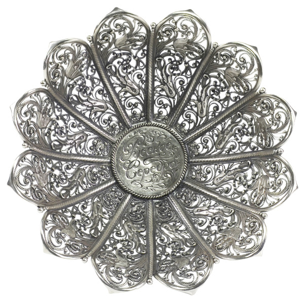В основе художественного решения лежит сложная техника скани, дополненная гравированием и оксидированием. Тончайшие серебряные нити образуют ритмичный орнамент с растительными мотивами, в котором каждая линия выверена вручную. Оксидирование подчёркивает глубину рисунка, создавая выразительный контраст между светлым блеском серебра и затемнённым фоном, благодаря чему узор приобретает объём и графическую чёткость. Гравировка завершает композицию, добавляя фактурную насыщенность и ощущение ювелирной точности исполнения.