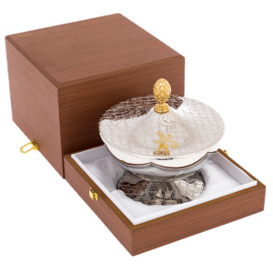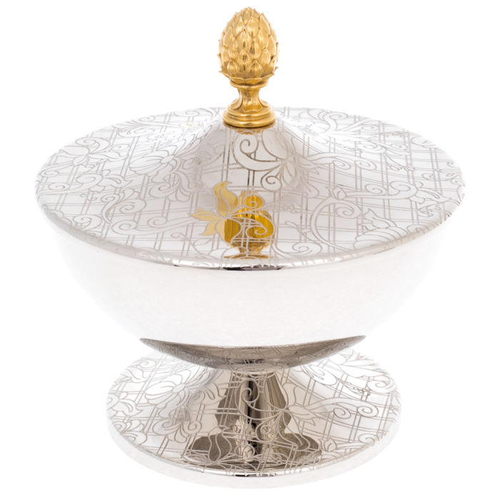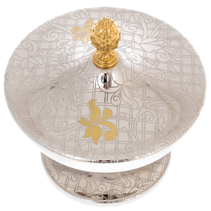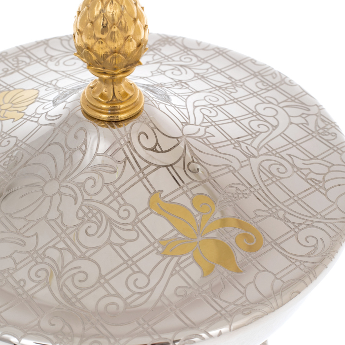 Внутренняя чаша, отполированная до совершенной гладкости, предназначена для хранения конфет, драже или небольших десертов, которые особенно эффектно смотрятся на фоне сияющего металла. Крышка, украшенная тем же орнаментом, опускается мягко и точно, создавая цельный силуэт, в котором нет ни одной лишней детали. Каждая линия тиснения, каждый золотой штрих выполнены вручную, благодаря чему конфетница обретает уникальный характер и подчёркивает мастерство художников Златоуста.
