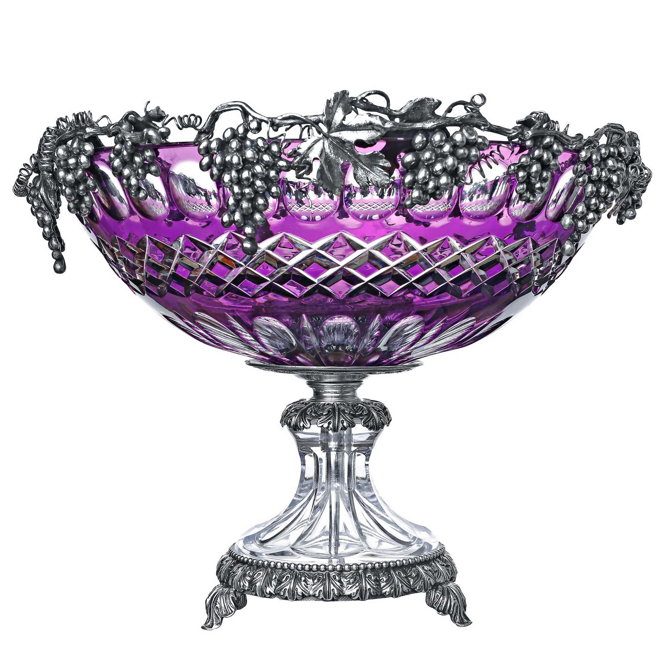 Роскошная ваза для фруктов, будто сошедшая с праздничного стола римского полководца Лукулла, озарит ваш дом отблеском искрящегося изобилия роскошного античного пира. Мотивы античности использованы нашими мастерами в этом необычайно торжественном и вместе с тем теплом и празднично-искрящемся изделии. Прекрасная чаша из хрусталя высшего качества черничного цвета, украшенная виноградной лозой, стоит на бронзовом основании из прозрачного хрусталя, также отделанного изящными лепестками тонкой ручной работы.